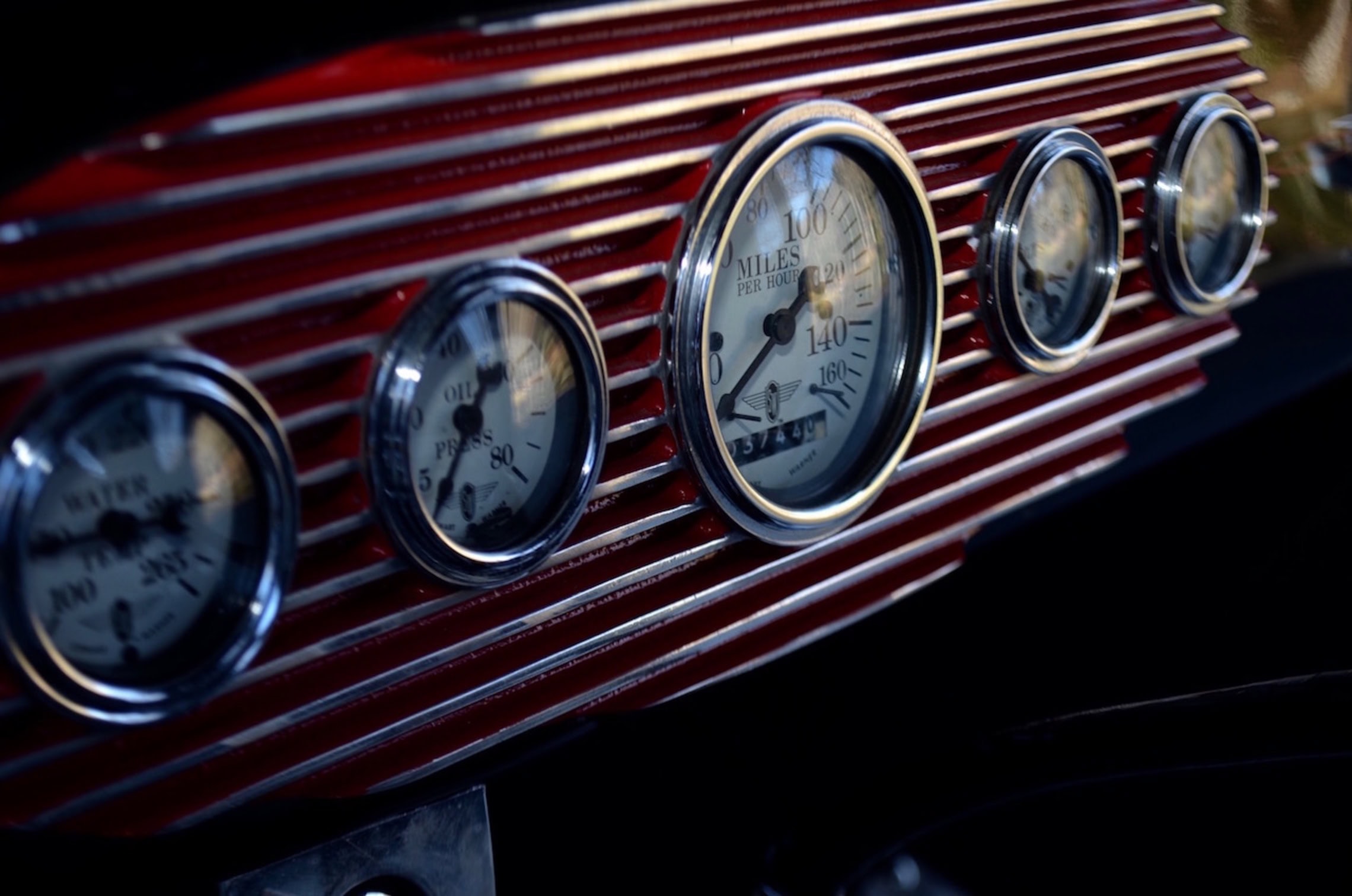 Musique de recueillement et silence d’un minute en souvenir (il est décédé dans un accident d’avion aux commandes de son Beechcraft, avec son épouse Deana)… Lorsqu’il a acheté ce coupé, c’était un Rat Rod déglingué qui avait deux choses qu’il recherchait : un moteur FlatheadV8 et une attitude “Coolesque”… Le plan A était simplement de nettoyer un peu, d’enlever une partie de l’encombrement, comme les pneus de secours montés sur le côté, et de simplement profiter de la voiture dans toute sa splendeur patinée d’époque. Ahhhhhhhhhhh ! Les plans les mieux conçus des Hot Rodder’s “de rue” tournent souvent mal et quand on lui a suggéré que la carrosserie était un peu trop haute, il n’y avait qu’un seul remède… Le toit a été habilement coupé de 6 po à l’avant et de seulement 4 po à l’arrière. Ce grand “Râteau de toit” typiquement Hot Rod a amplifié l’attitude caractérielle “Bouseux de Campagne” du coupé…