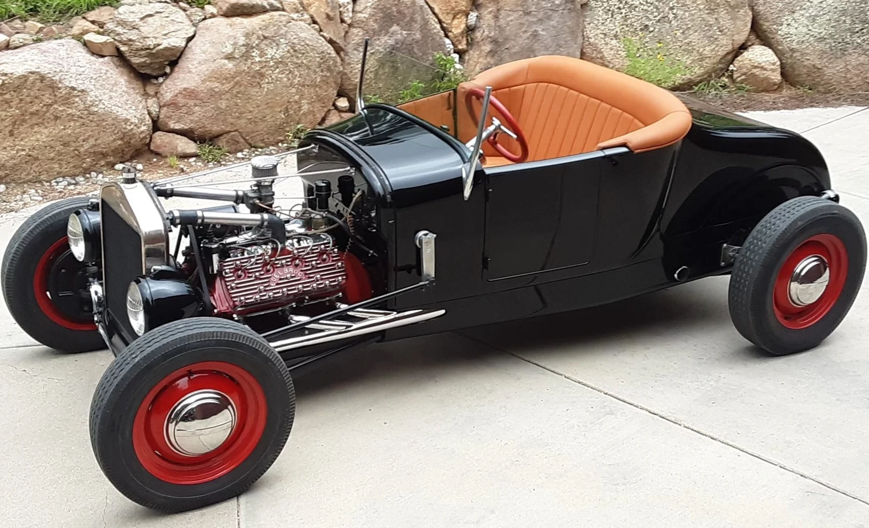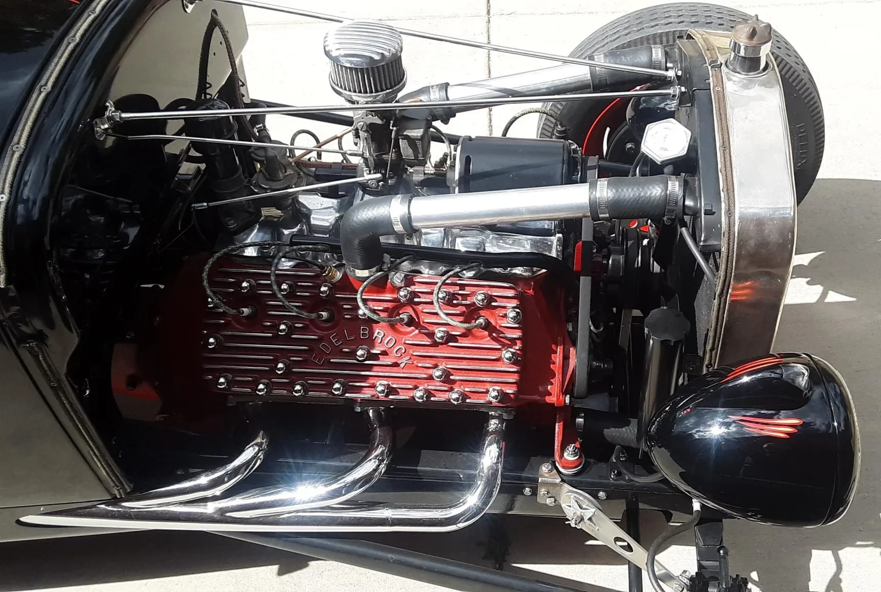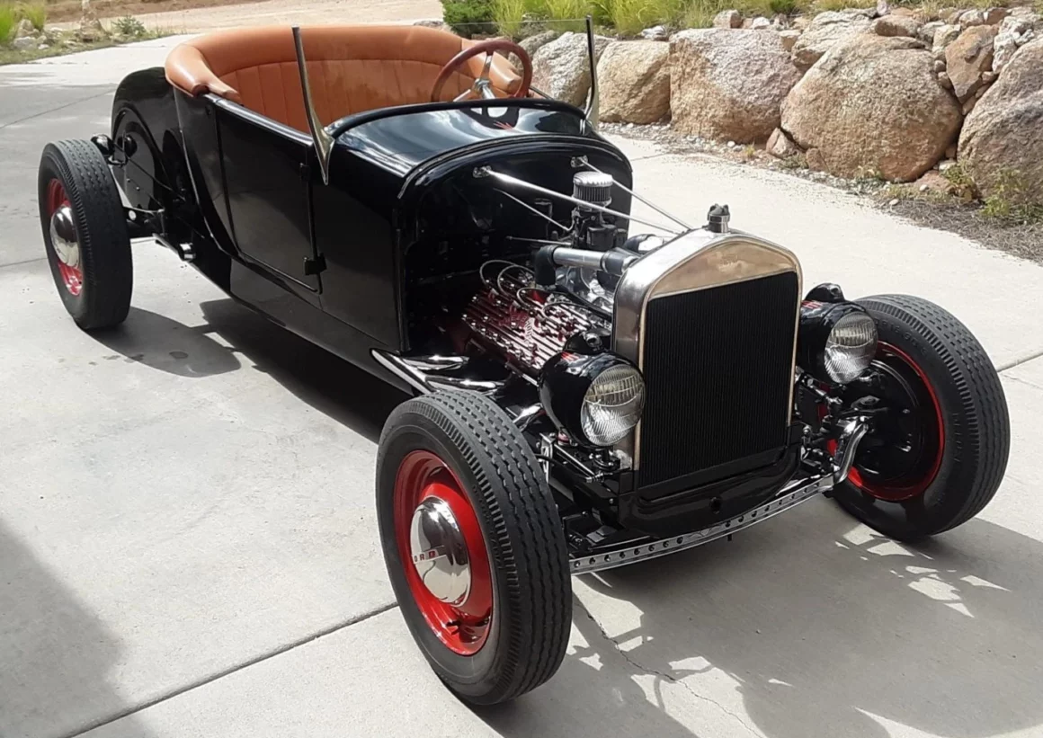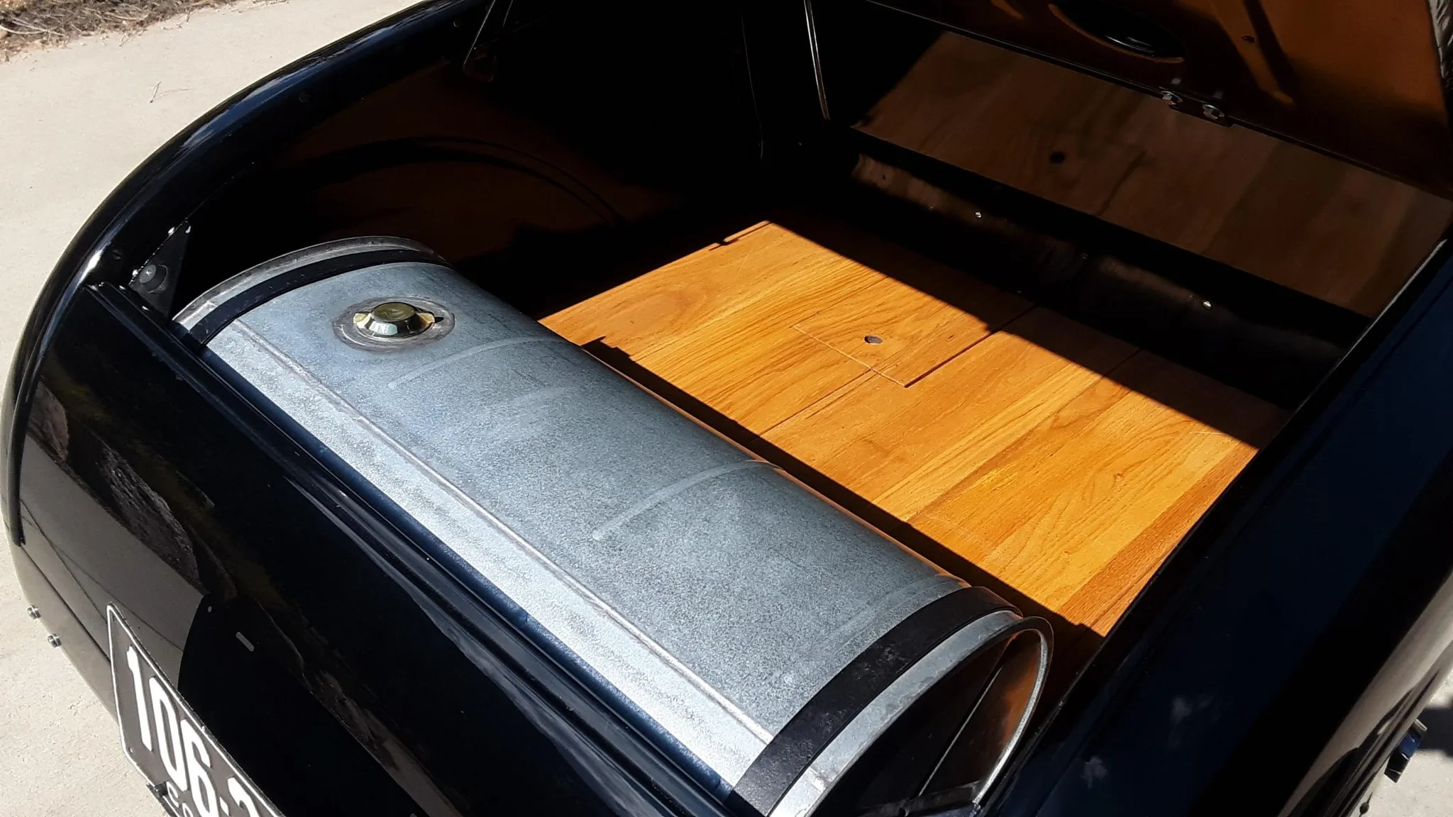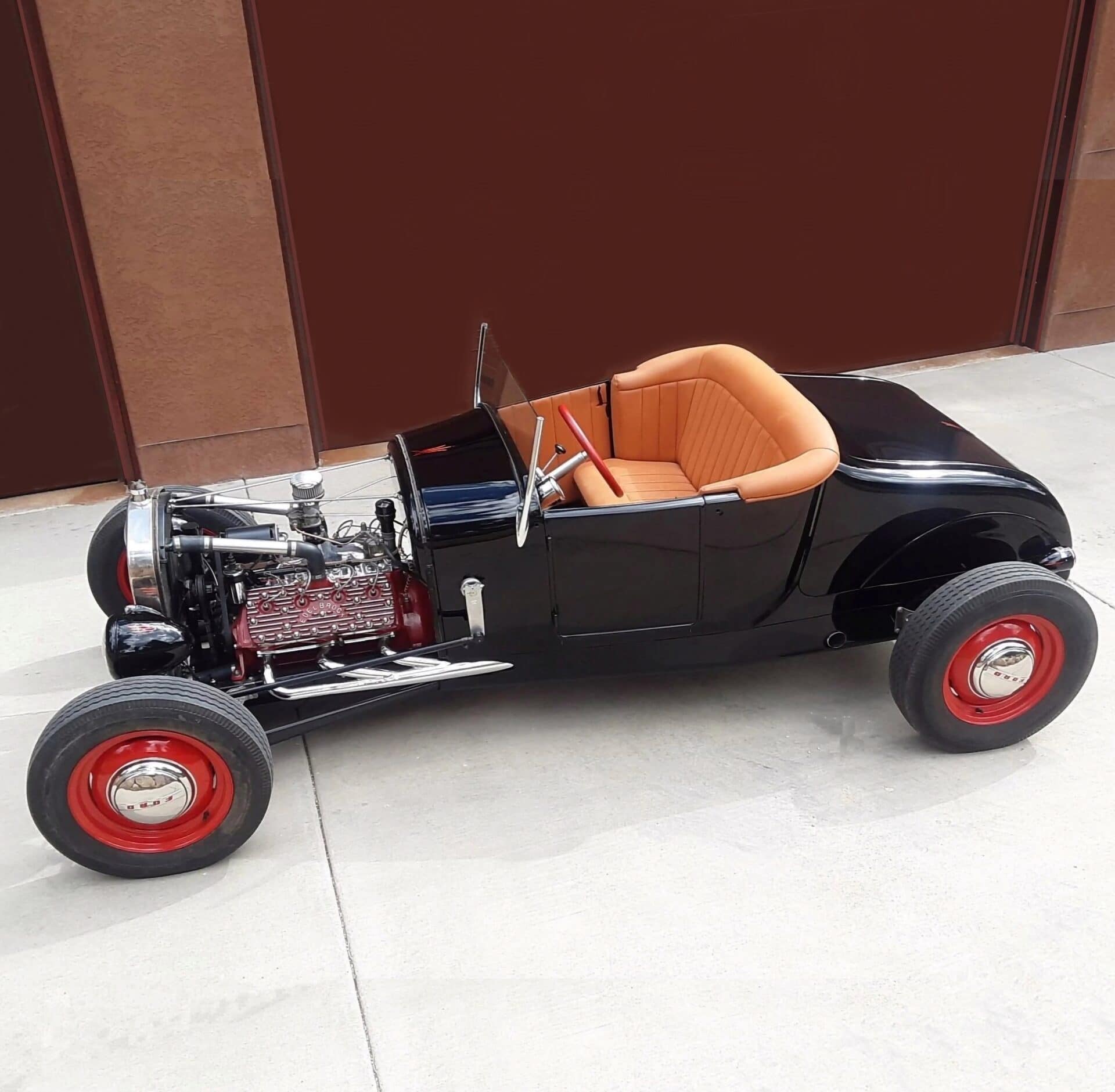 Ce Hot-Rod Tudor’27 n’est pas un Misfit mais simple et beau. Le V8 est équipé de culasses Edelbrock et la puissance passe par une transmission manuelle à trois vitesses. La voiture est finie en noir sur une sellerie beige et dispose d’un essieu avant Super Bell à poutre en I, et de planchers en chêne.