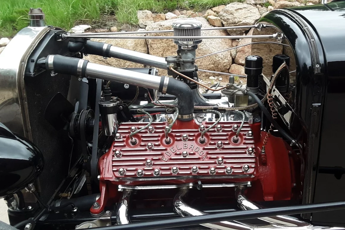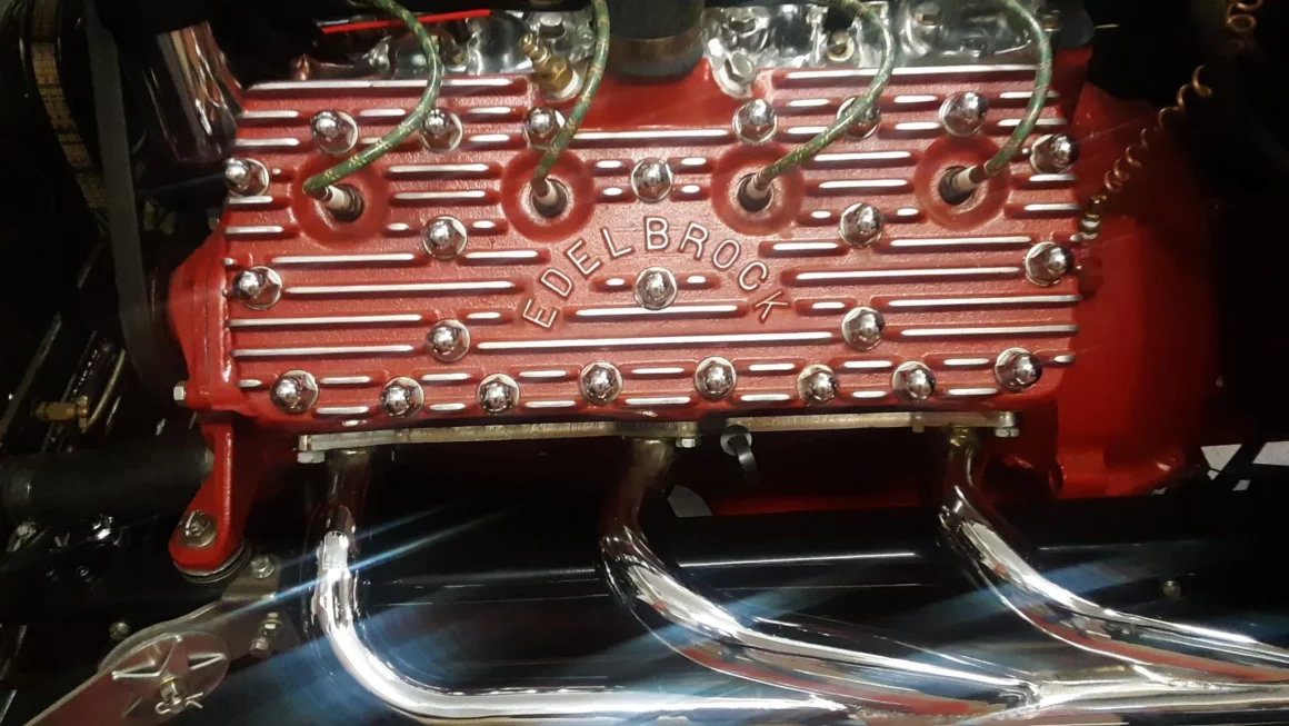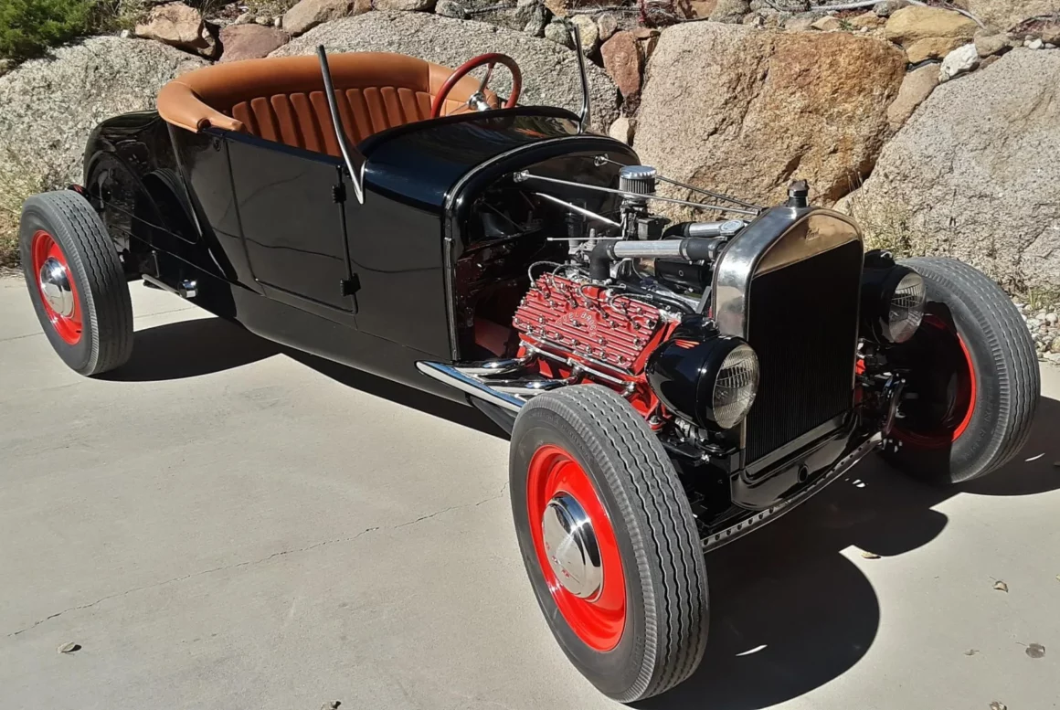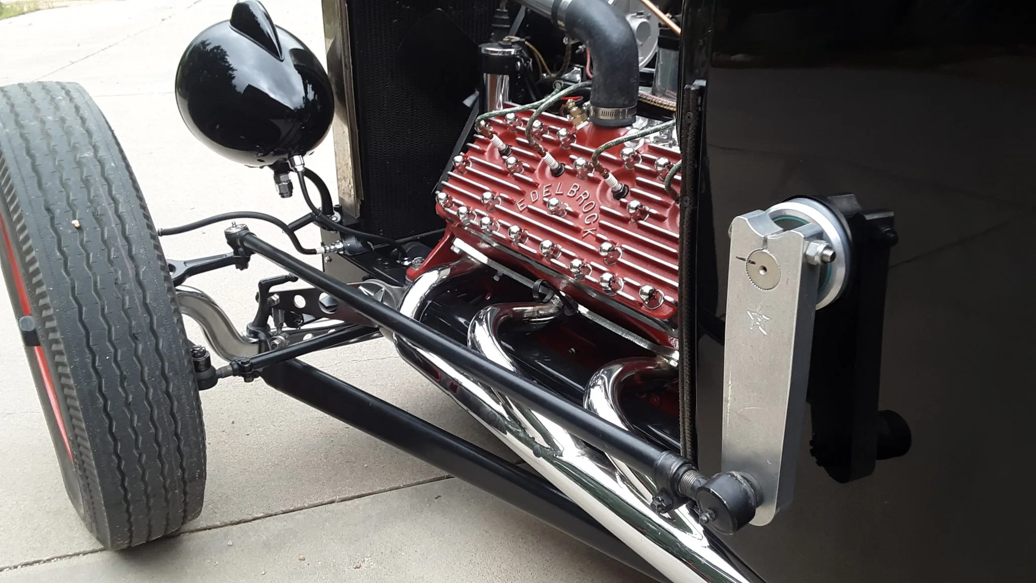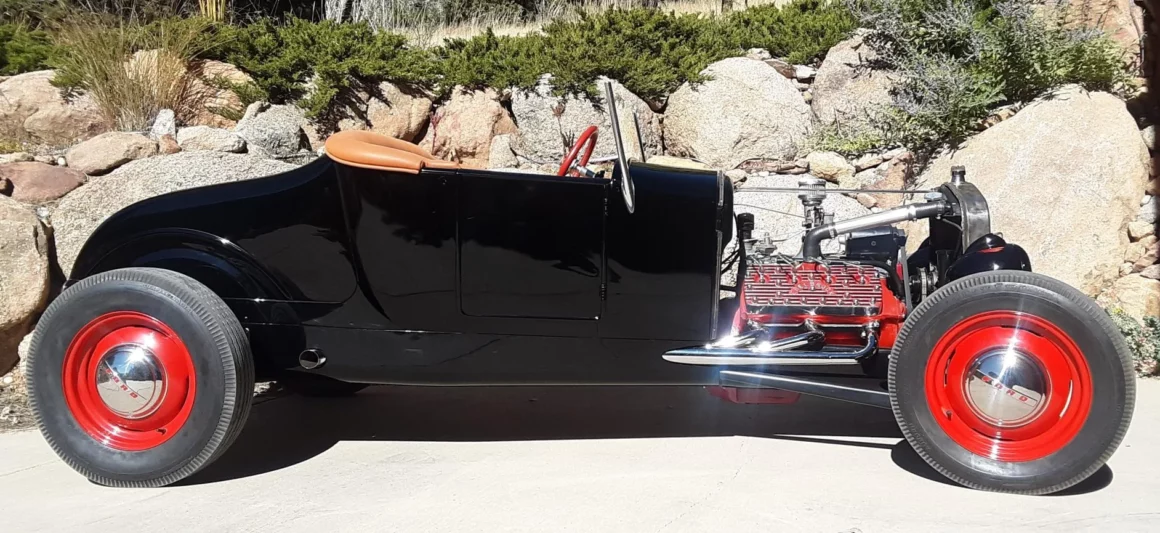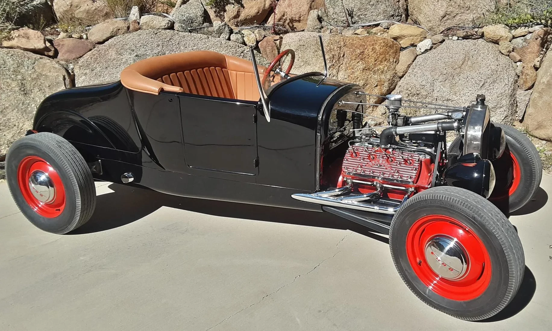 Ce Hot-Rod Tudor’27 n’est pas un Misfit mais simple et beau. Le V8 est équipé de culasses Edelbrock et la puissance passe par une transmission manuelle à trois vitesses. La voiture est finie en noir sur une sellerie beige et dispose d’un essieu avant Super Bell à poutre en I, et de planchers en chêne.