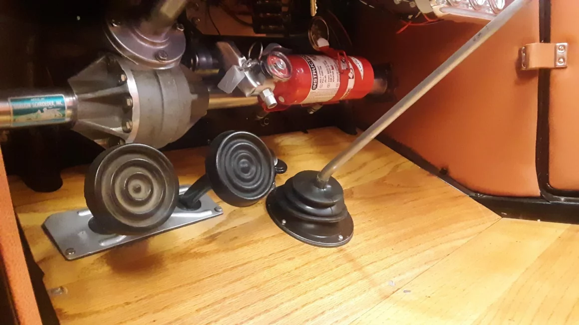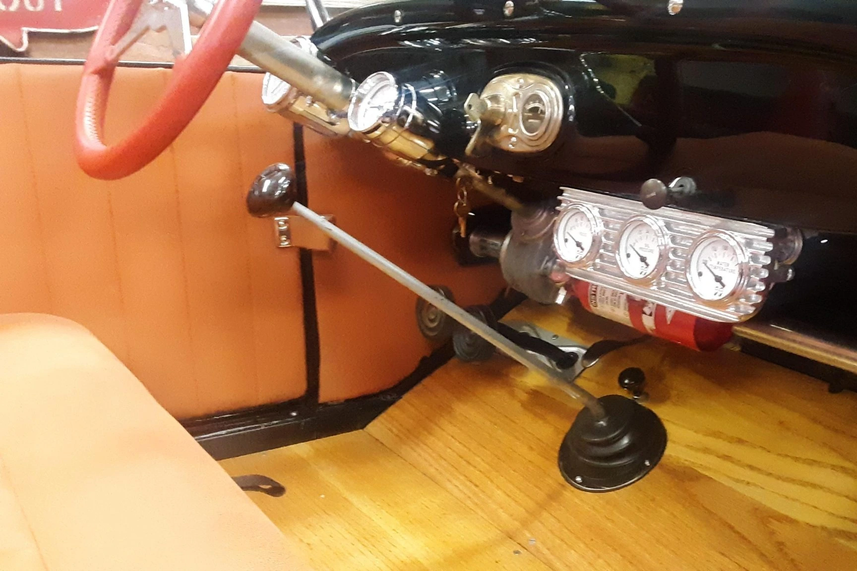 Freins à tambour aux quatre roues, pompe à carburant électrique, système d’échappement personnalisé, jauges Mooneyes, feux arrière à LED et jantes en acier de 16 pouces au fini rouge montées avec des pneus Diamond Back. Boîtier de direction Schroeder. Amortisseurs à friction en acier inoxydable.