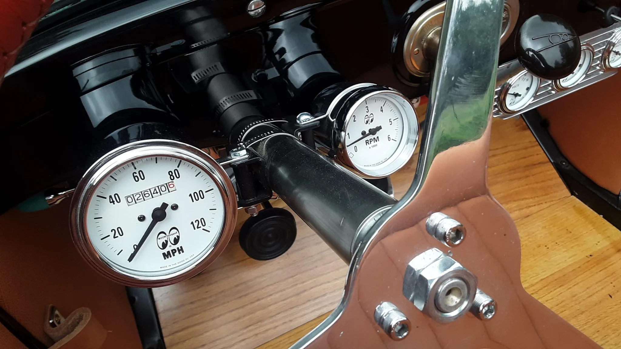 Essieu avant Superbell. Phares I-beam. Le volant à trois branches se trouve devant un tachymètre Mooneyes 6ktr/min monté sur la colonne avec un compteur de vitesse de 120 mph. Une nacelle Mooneyes à trois jauges est montée sous le tableau de bord : tension, pression d’huile et température de l’eau.