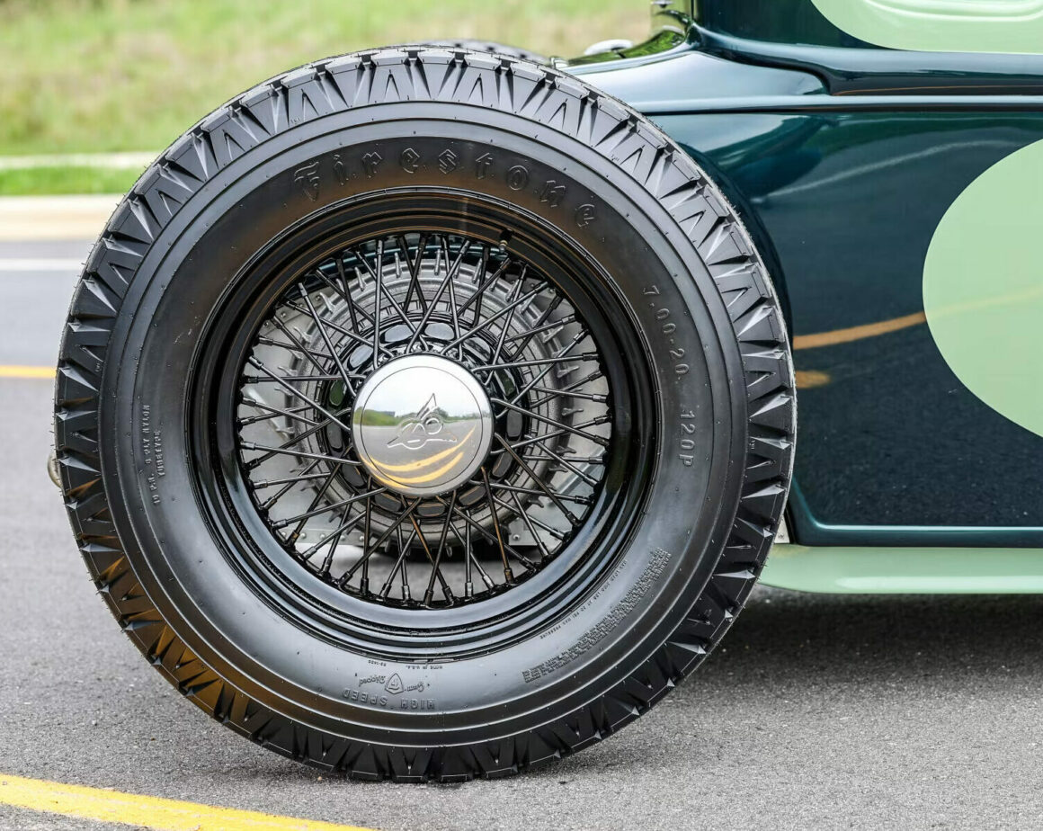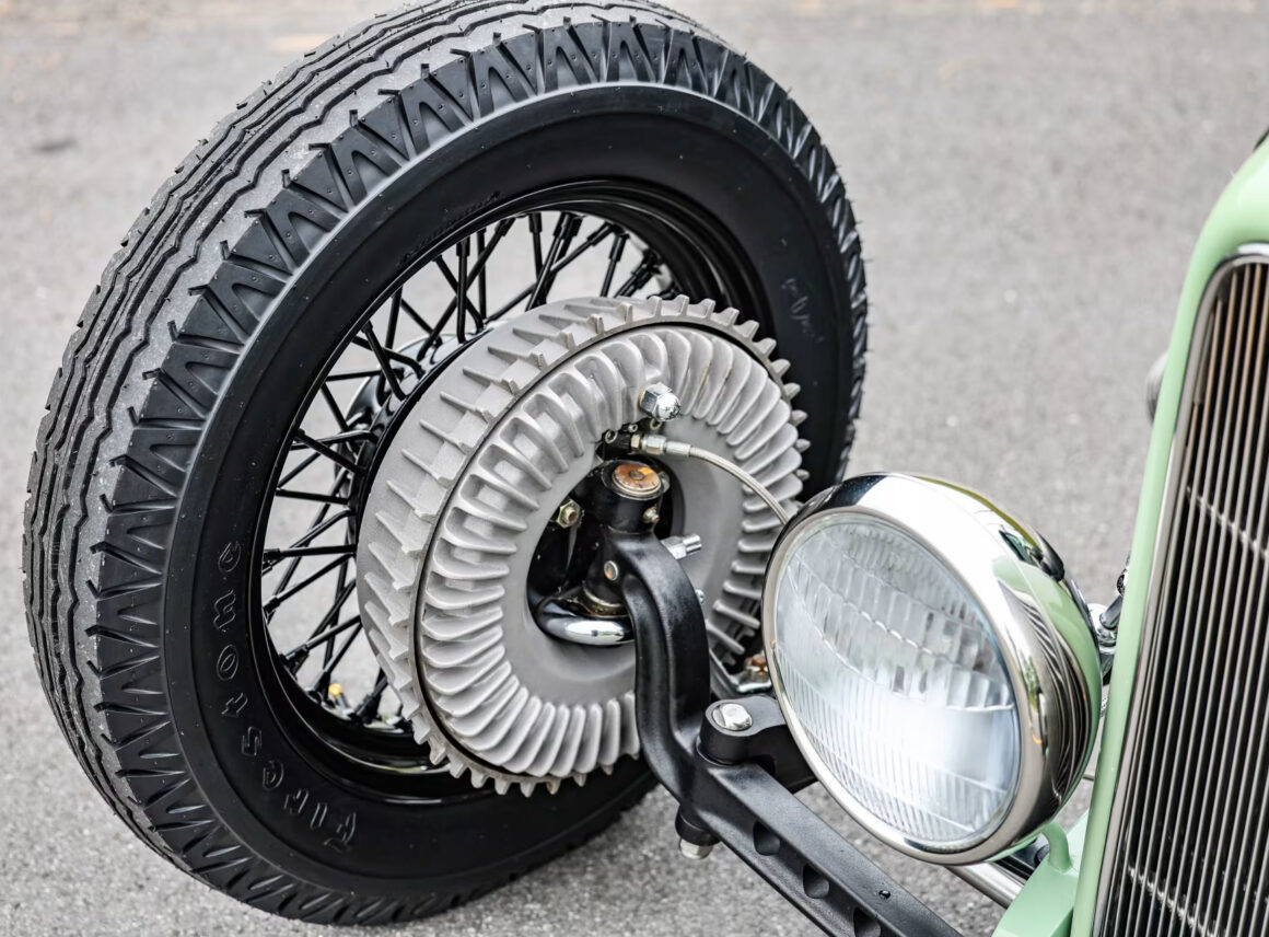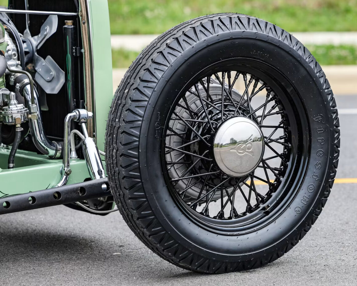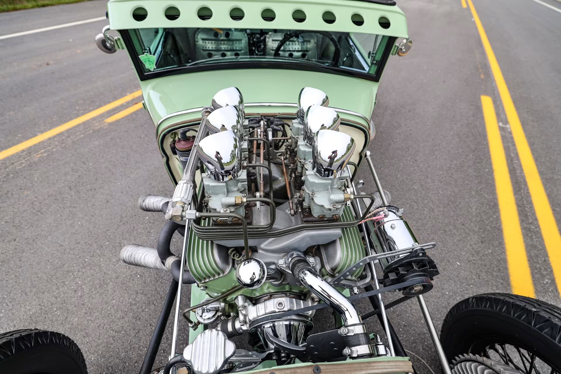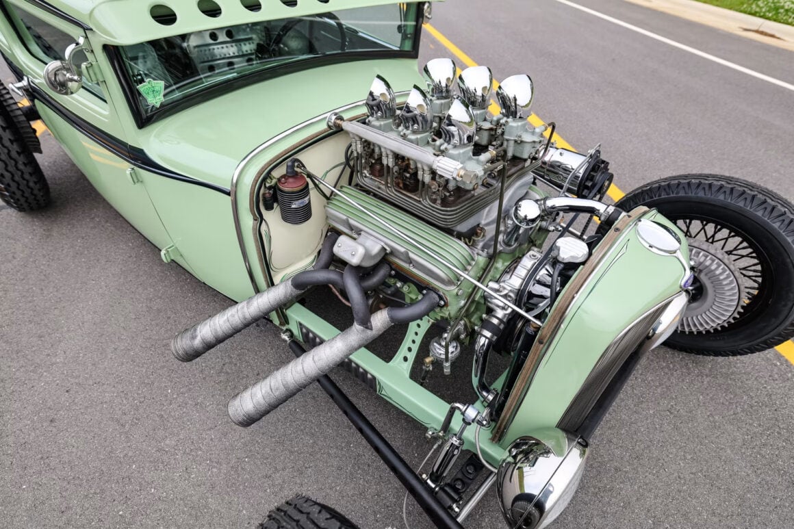 Les pneus sont des4,75-5,00-20po et 7,50-18po. Les freins avant sont des Wilson Welding à tambours équipés de sabots Ford’40. Le moteur V8 est certes un 350ci mais c’est un SBC 72 construit par Milo Iglesias de Foreign Car Rebuilding situé à Palatine, Illinois. Les caches soupapes à ailettes Vintage Cal Custom ont d’abord été peints en vert clair Chrysler pour correspondre à la carrosserie, avec de nombreux autres composants Vintage.