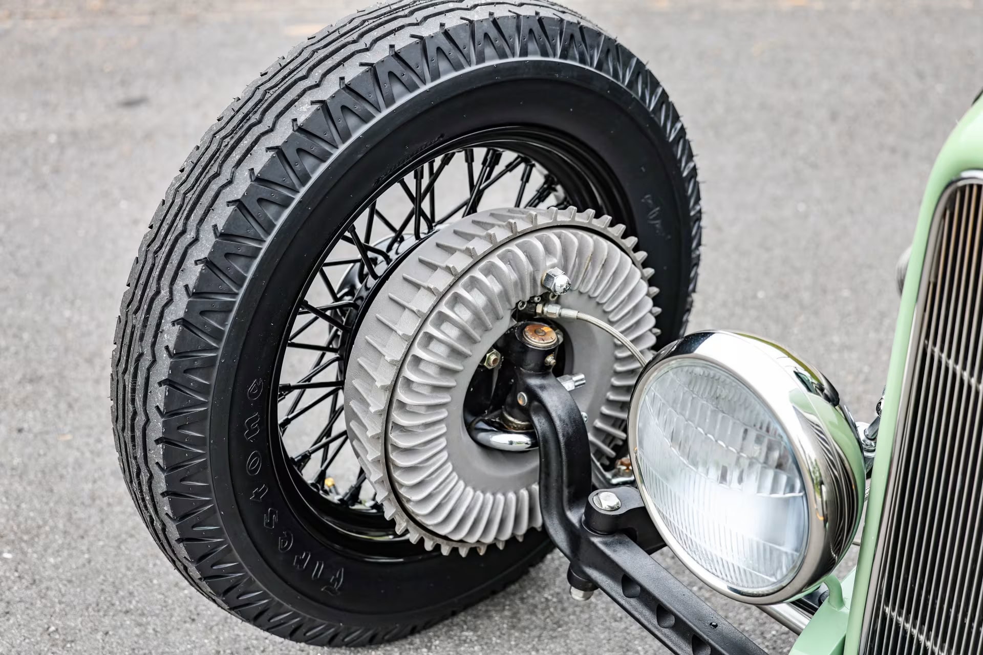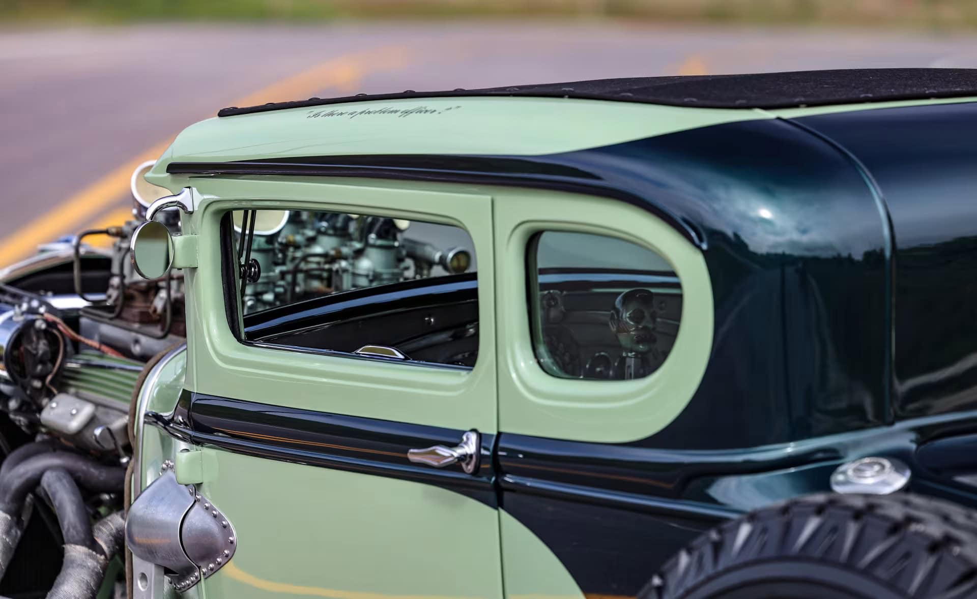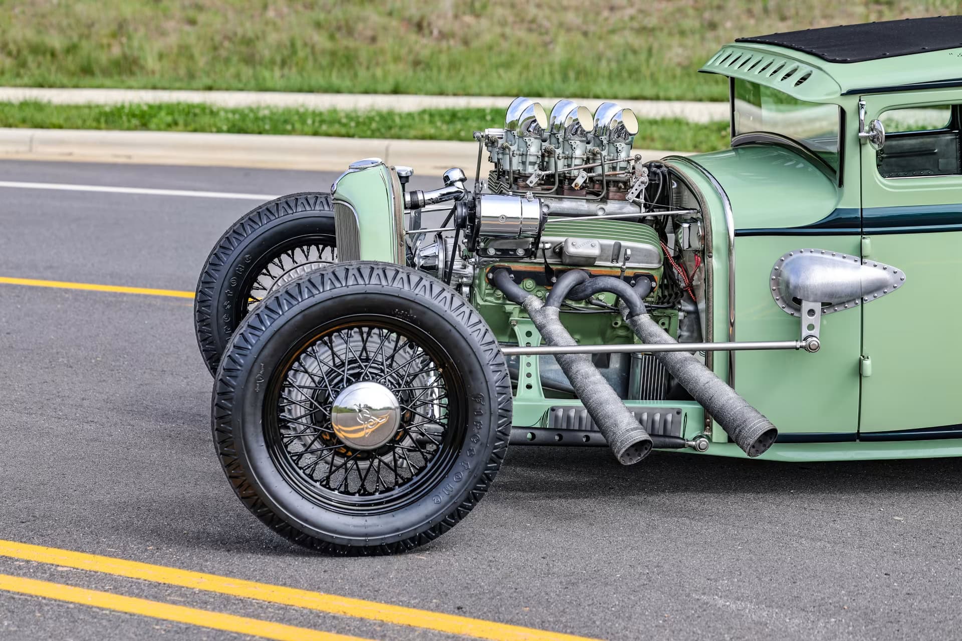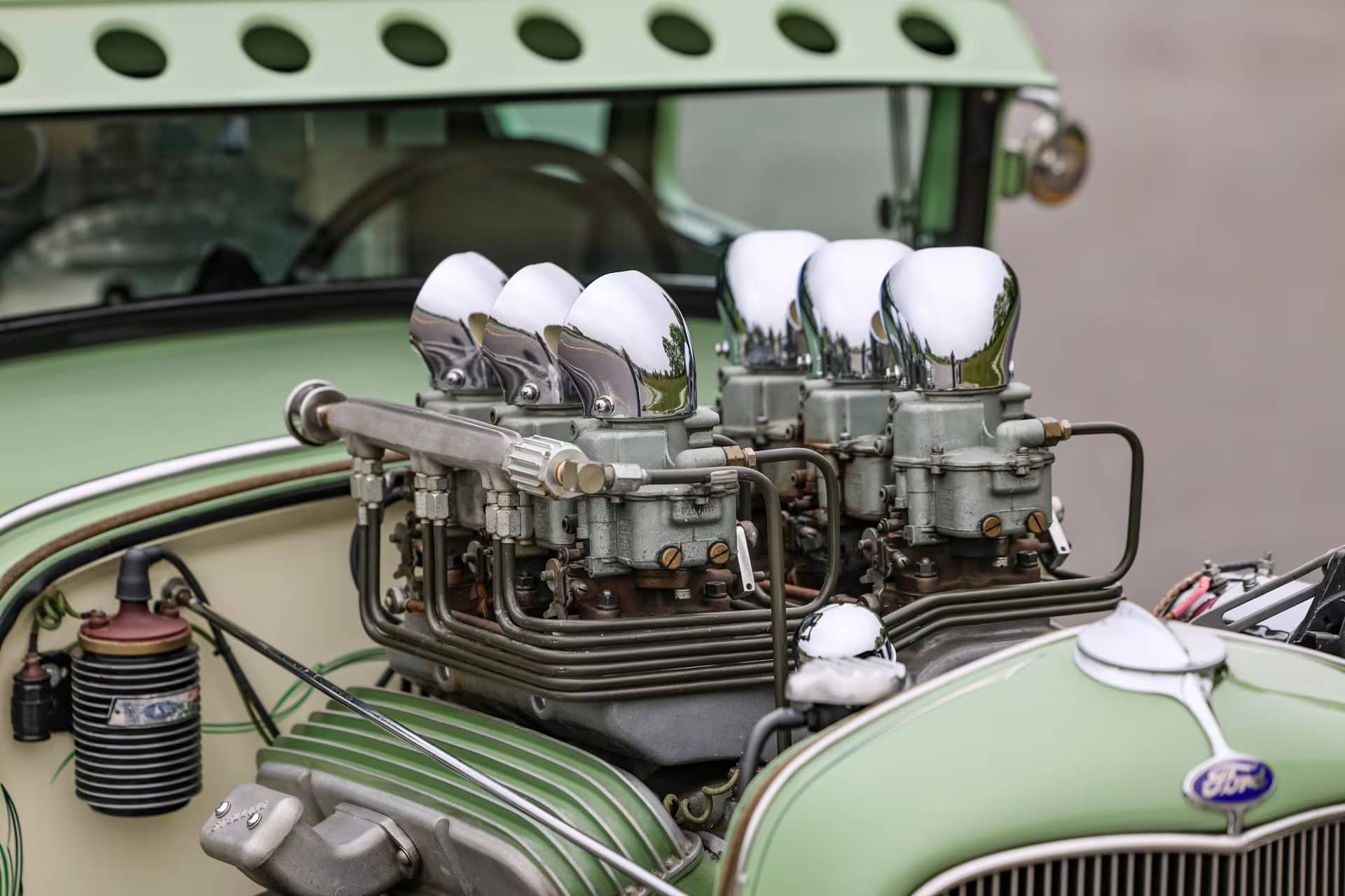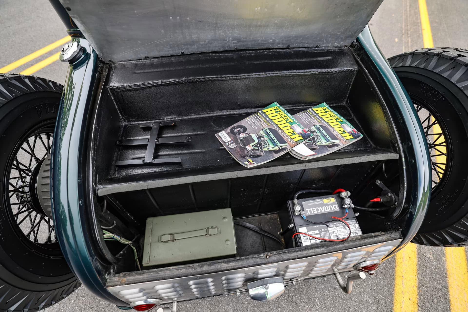 Les pneus sont des4,75-5,00-20po et 7,50-18po. Les freins avant sont des Wilson Welding à tambours équipés de sabots Ford’40. Le moteur V8 est certes un 350ci mais c’est un SBC 72 construit par Milo Iglesias de Foreign Car Rebuilding situé à Palatine, Illinois. Les caches soupapes à ailettes Vintage Cal Custom ont d’abord été peints en vert clair Chrysler pour correspondre à la carrosserie, avec de nombreux autres composants Vintage.