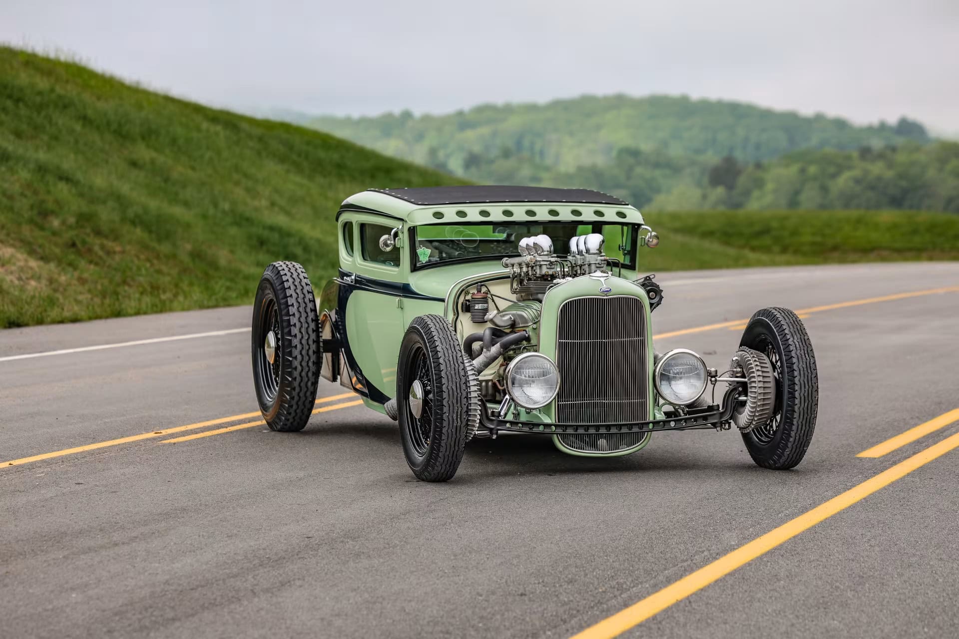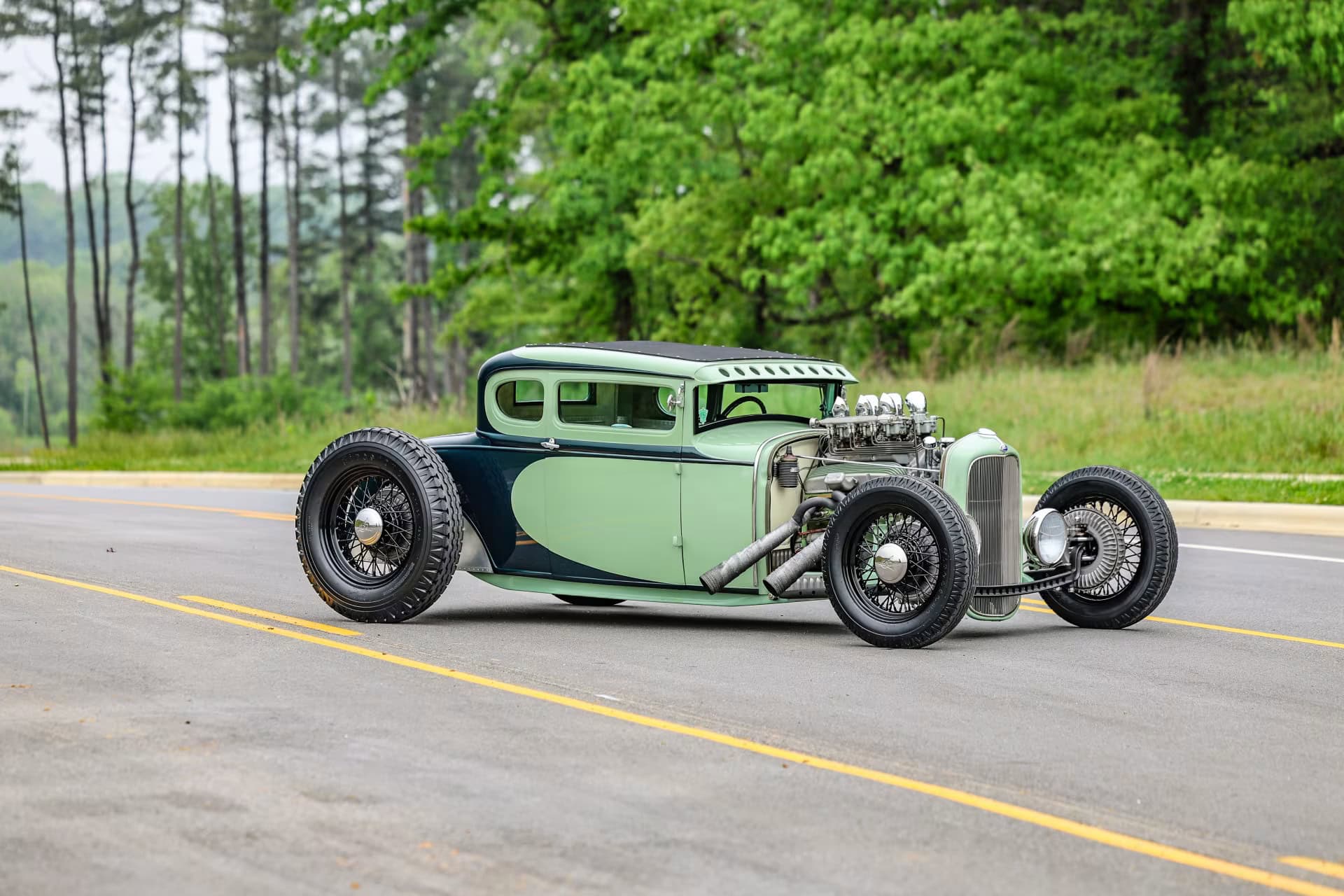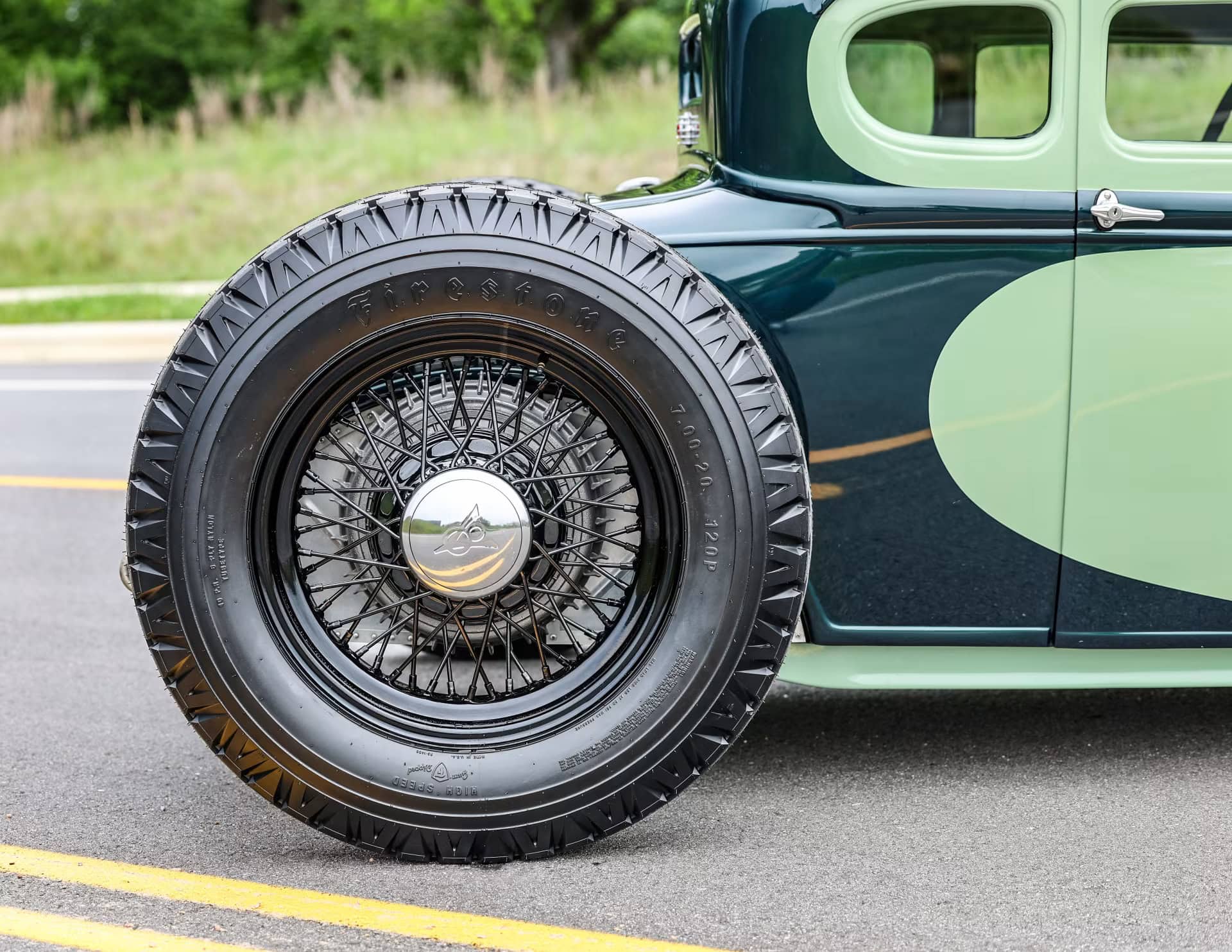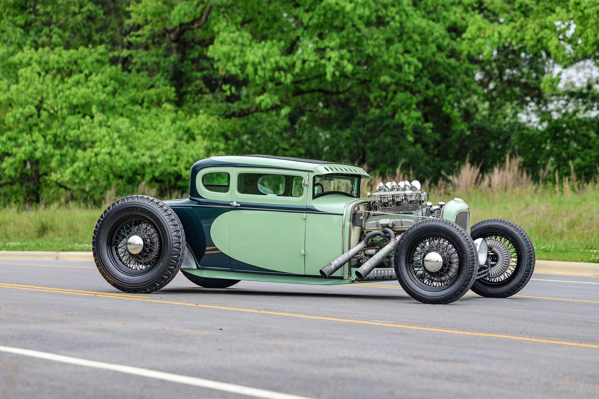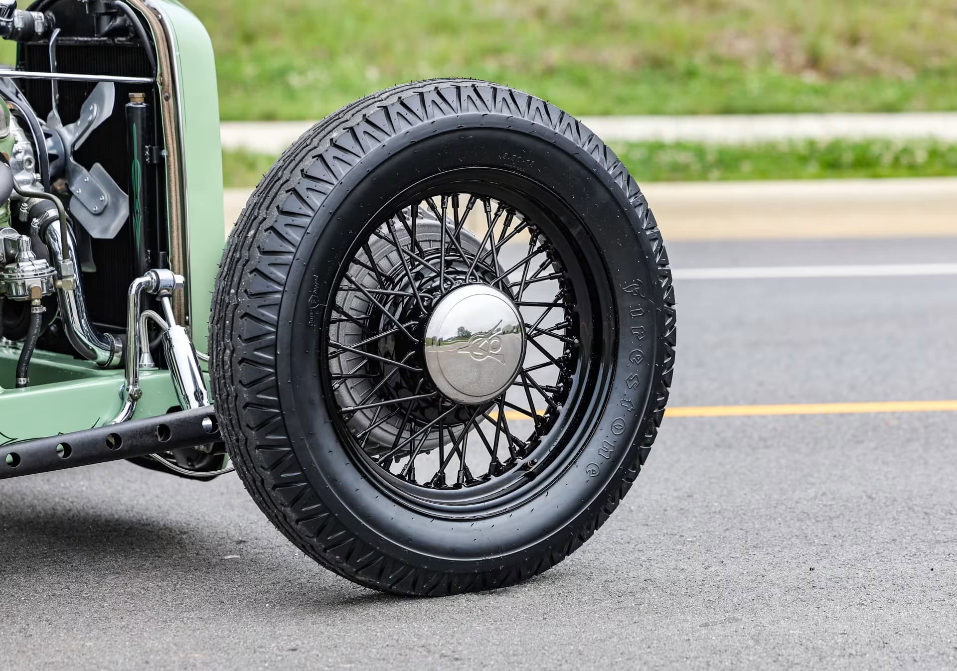Les pneus sont des4,75-5,00-20po et 7,50-18po. Les freins avant sont des Wilson Welding à tambours équipés de sabots Ford’40. Le moteur V8 est certes un 350ci mais c’est un SBC 72 construit par Milo Iglesias de Foreign Car Rebuilding situé à Palatine, Illinois. Les caches soupapes à ailettes Vintage Cal Custom ont d’abord été peints en vert clair Chrysler pour correspondre à la carrosserie, avec de nombreux autres composants Vintage.