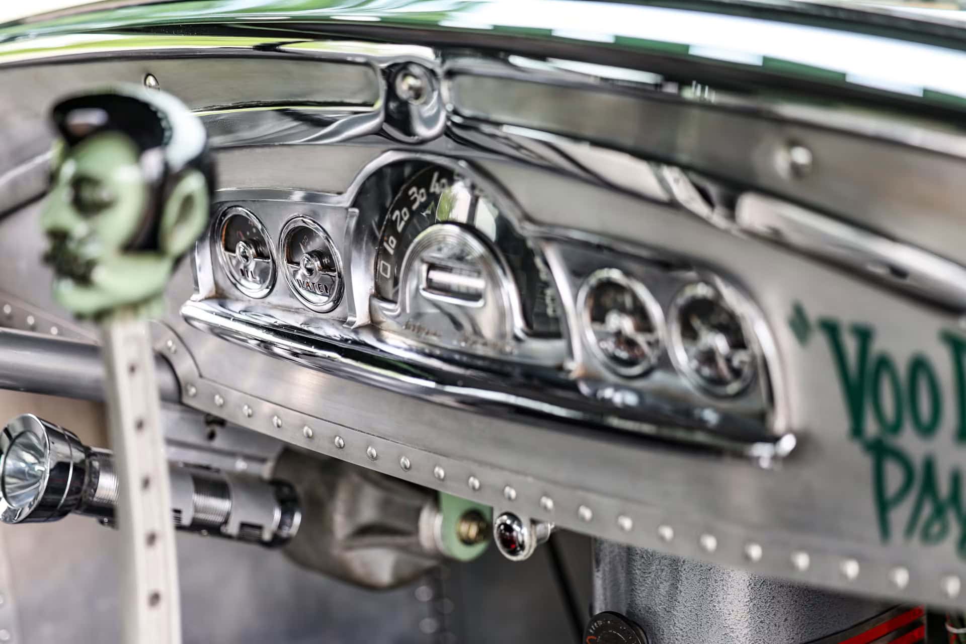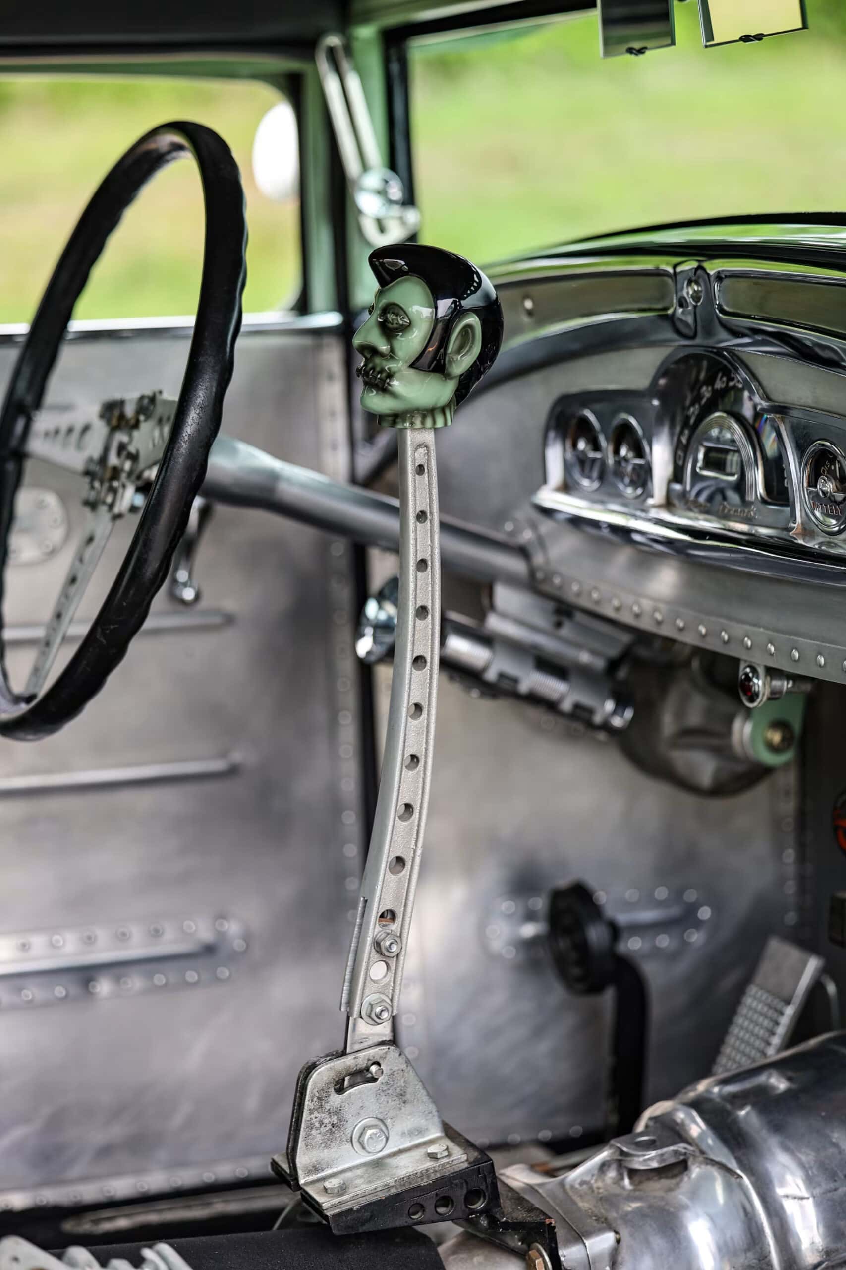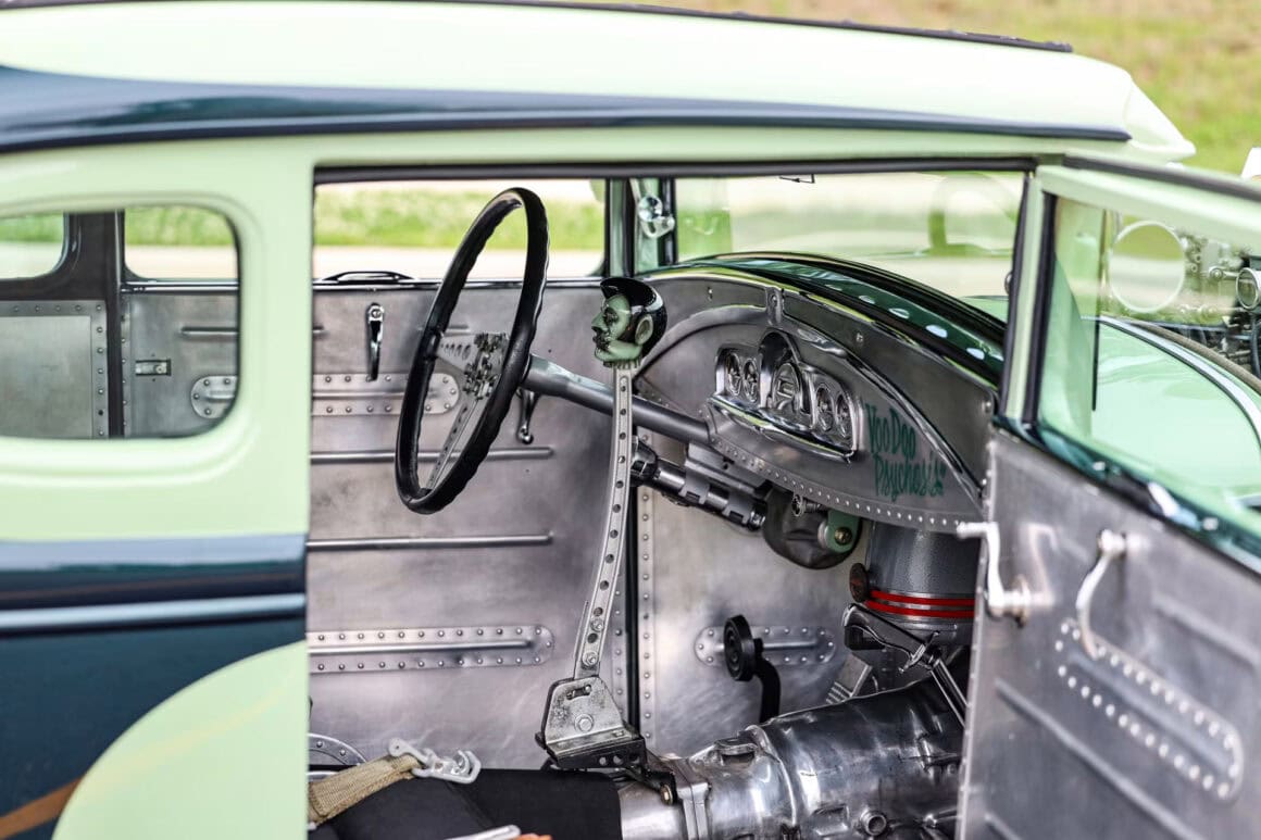 À l’intérieur : les sièges façon bombardier B-52 construits sur mesure sont stupéfiants, ET les ceintures de sécurité d’origine du bombardier de la Seconde Guerre mondiale, ainsi que divers éléments de Pontiac’49, telle une colonne de direction scratchée Indevit, un volant à dégagement rapide et des très rares rétroviseurs d’autobus Greyhound 27… Les voitures construites “Voodoo Larry Grobe” frappent au niveau du bas-ventre.