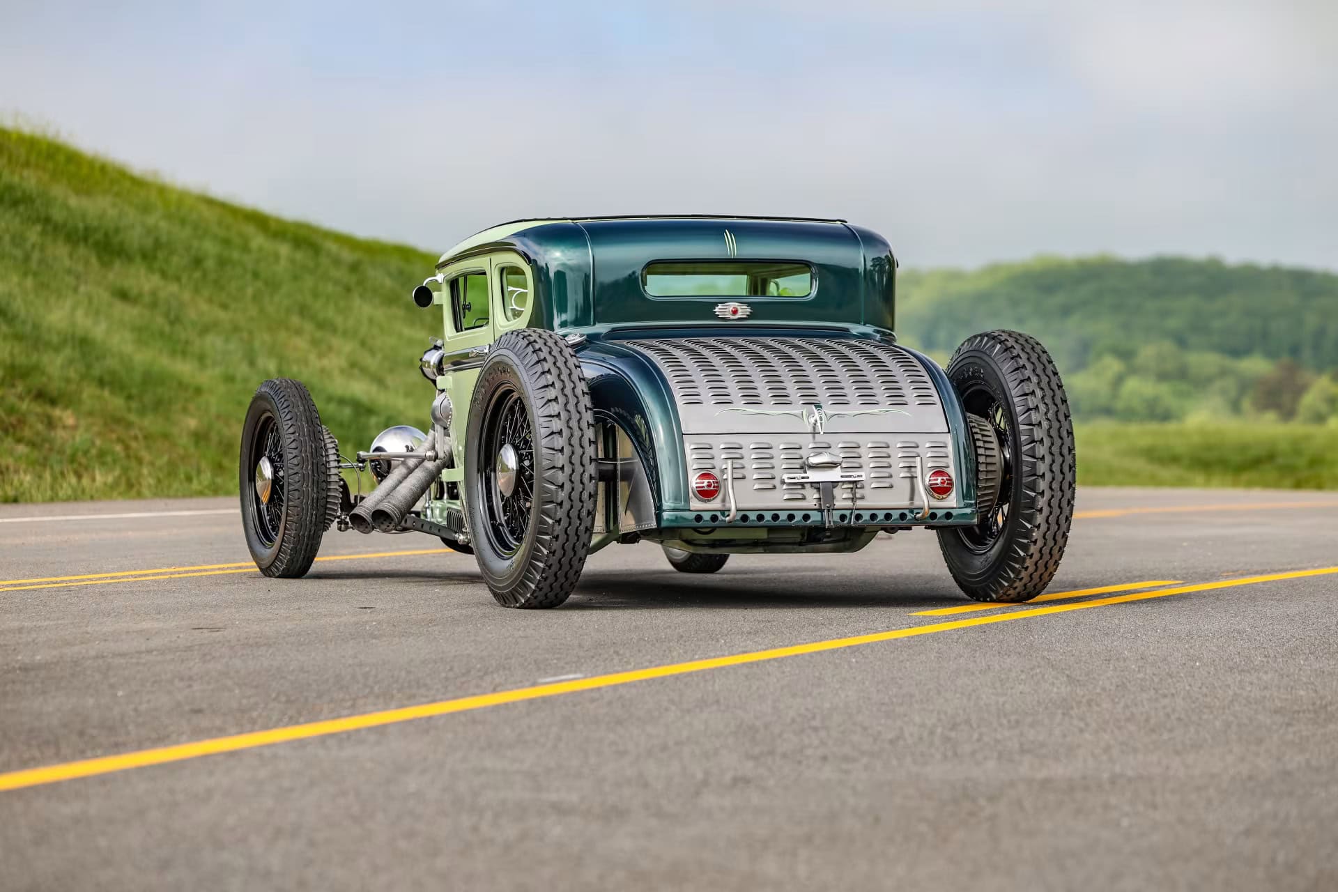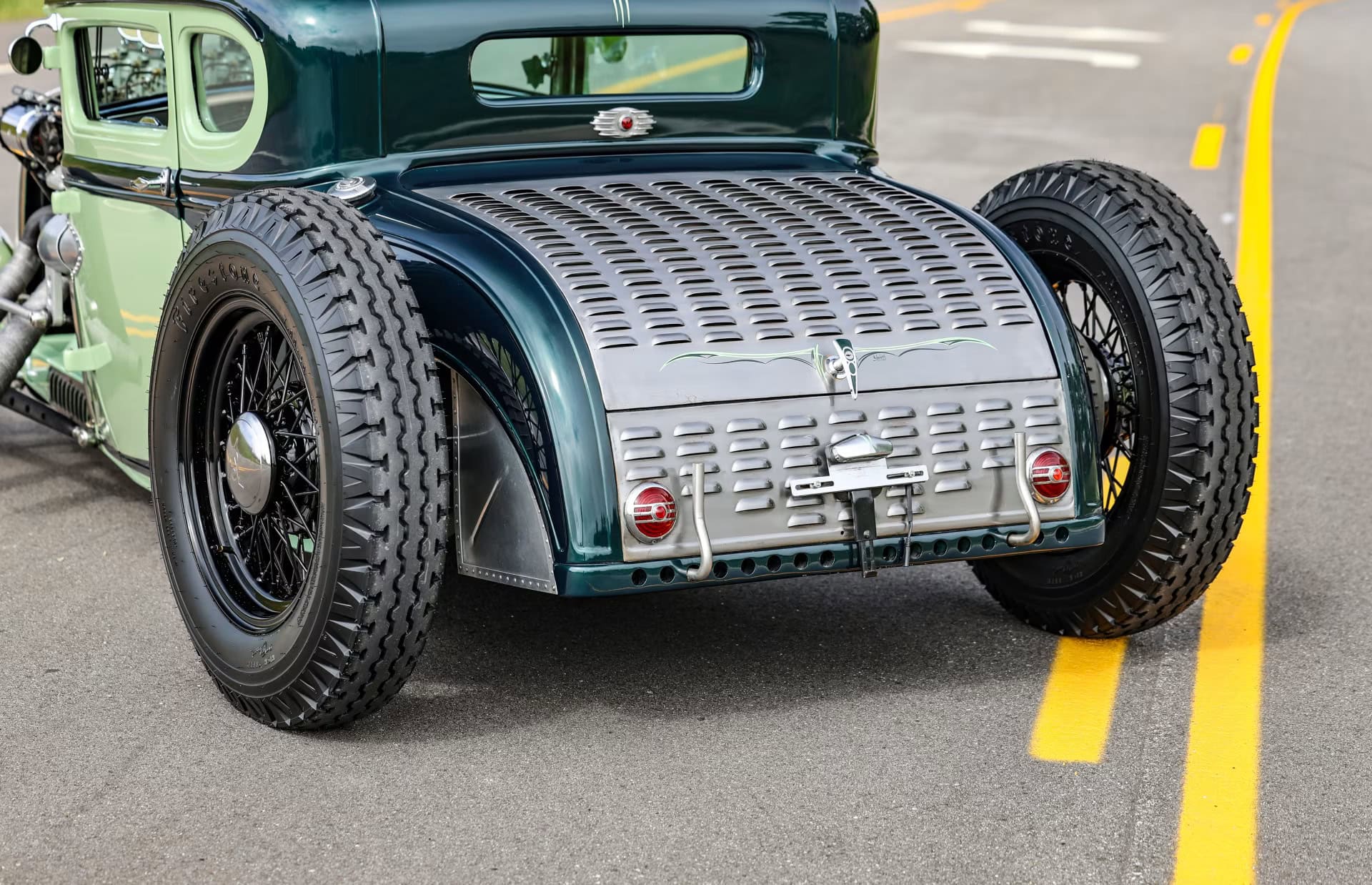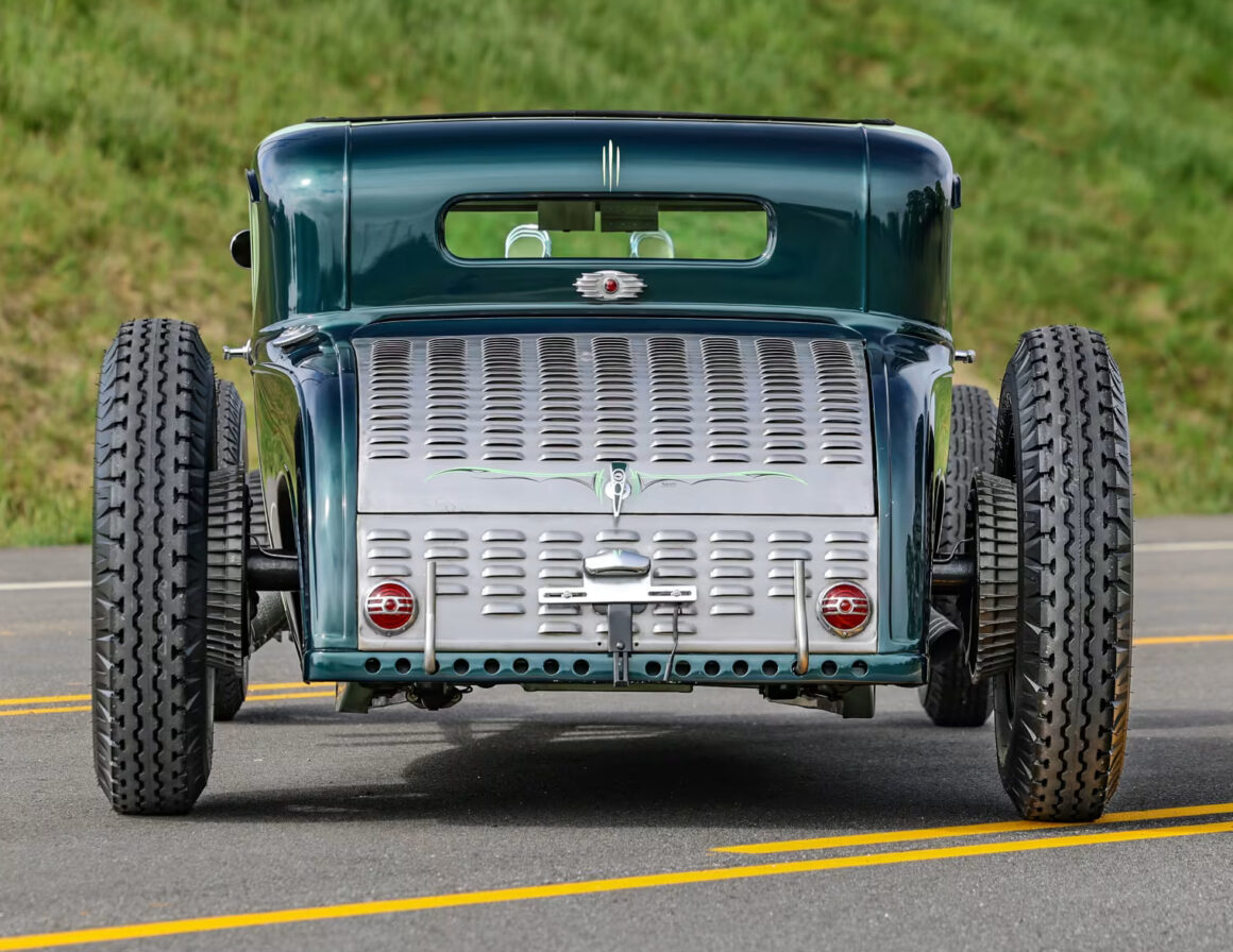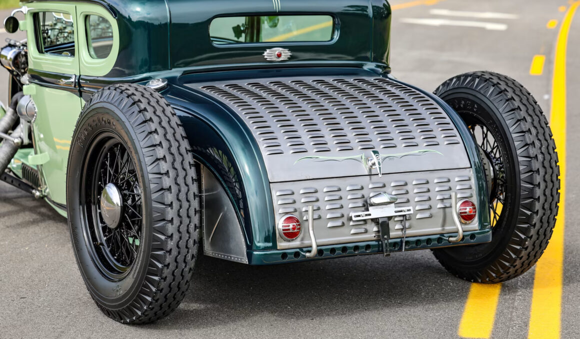 Le vert clair est une couleur Chrysler 46 et la teinte plus foncée est empruntée à Mercedes. Le style est proche de l’ancien coupé “Pierson Brothers” qui s’était fait remarquer lors des débuts de Bonneville Salt Lake’s. Le couvercle du coffre n’a pas été peint pour lui donner un aspect volontairement inachevé… Venons-en au châssis, c’est un Ford’32 pincé de 3 pouces, relevé de 14 pouces à l’arrière et raccourci de 6 pouces à l’avant.