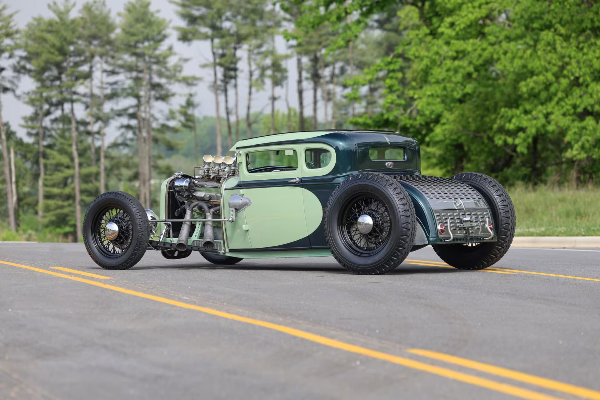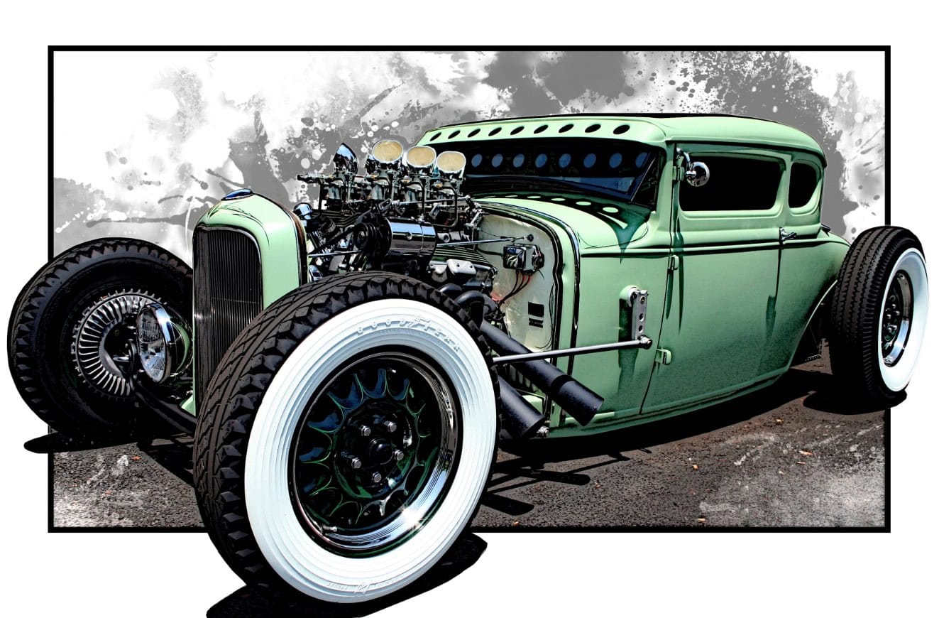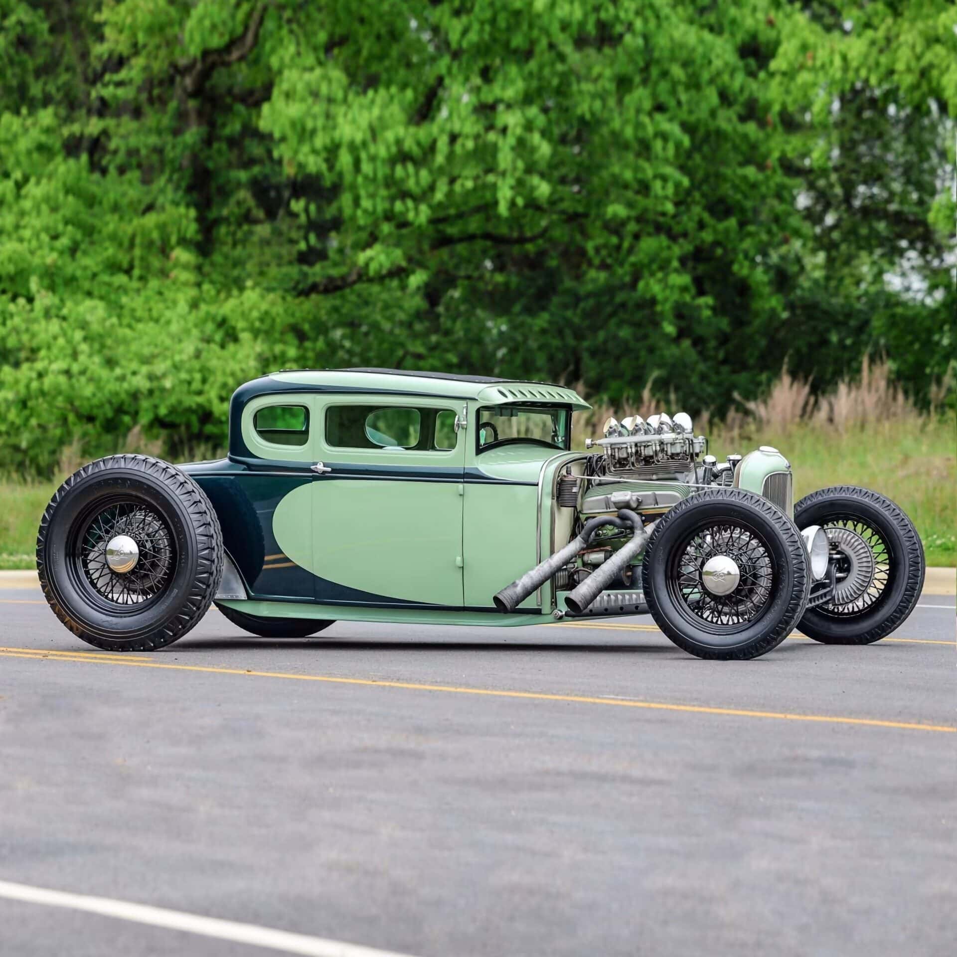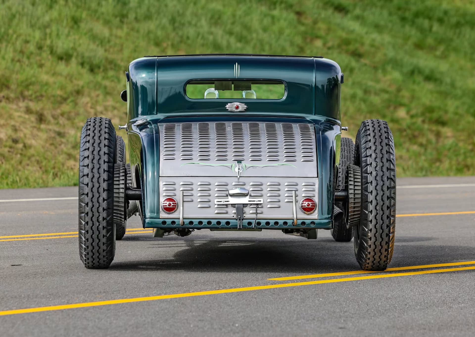 Le vert clair est une couleur Chrysler 46 et la teinte plus foncée est empruntée à Mercedes. Le style est proche de l’ancien coupé “Pierson Brothers” qui s’était fait remarquer lors des débuts de Bonneville Salt Lake’s. Le couvercle du coffre n’a pas été peint pour lui donner un aspect volontairement inachevé… Venons-en au châssis, c’est un Ford’32 pincé de 3 pouces, relevé de 14 pouces à l’arrière et raccourci de 6 pouces à l’avant.