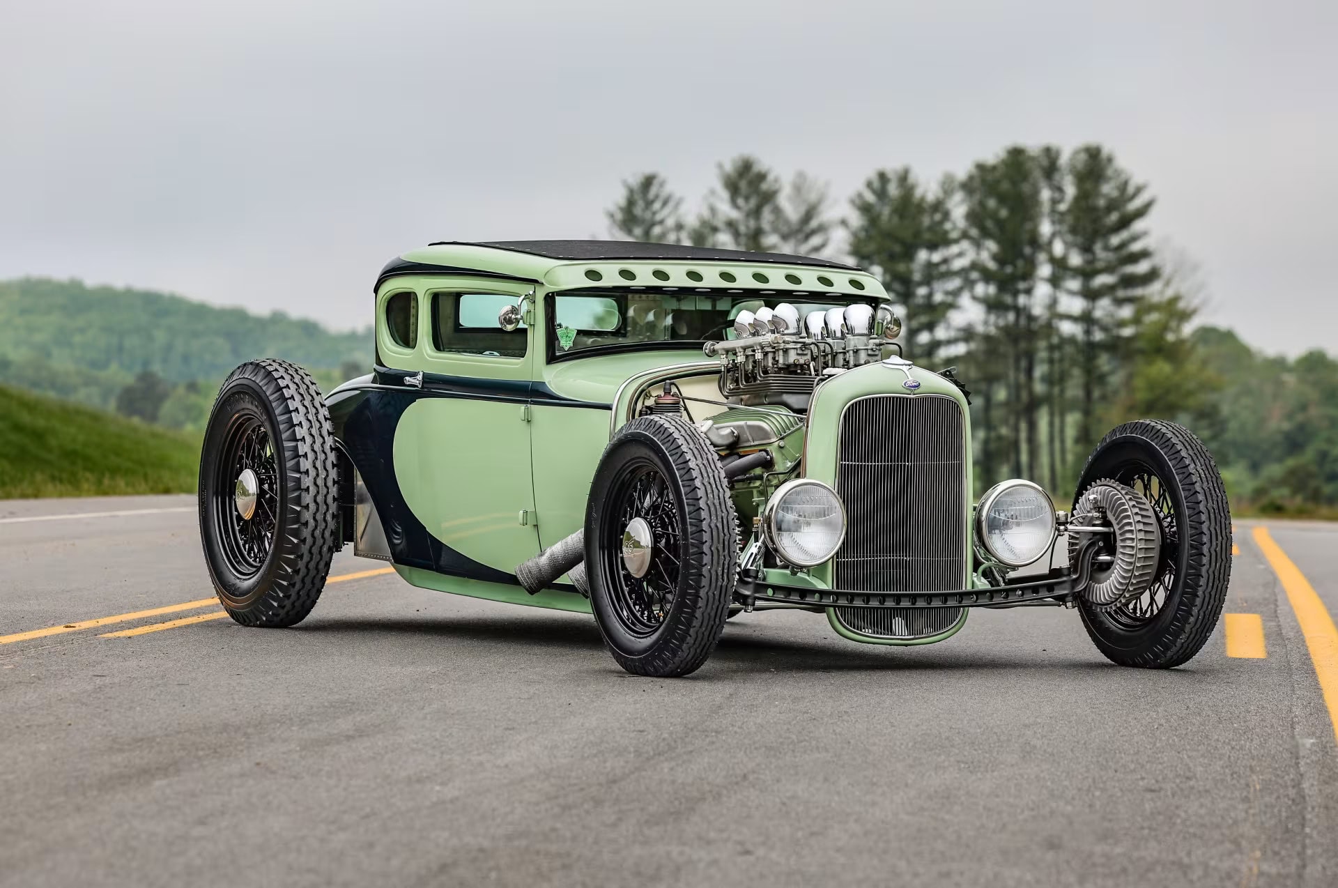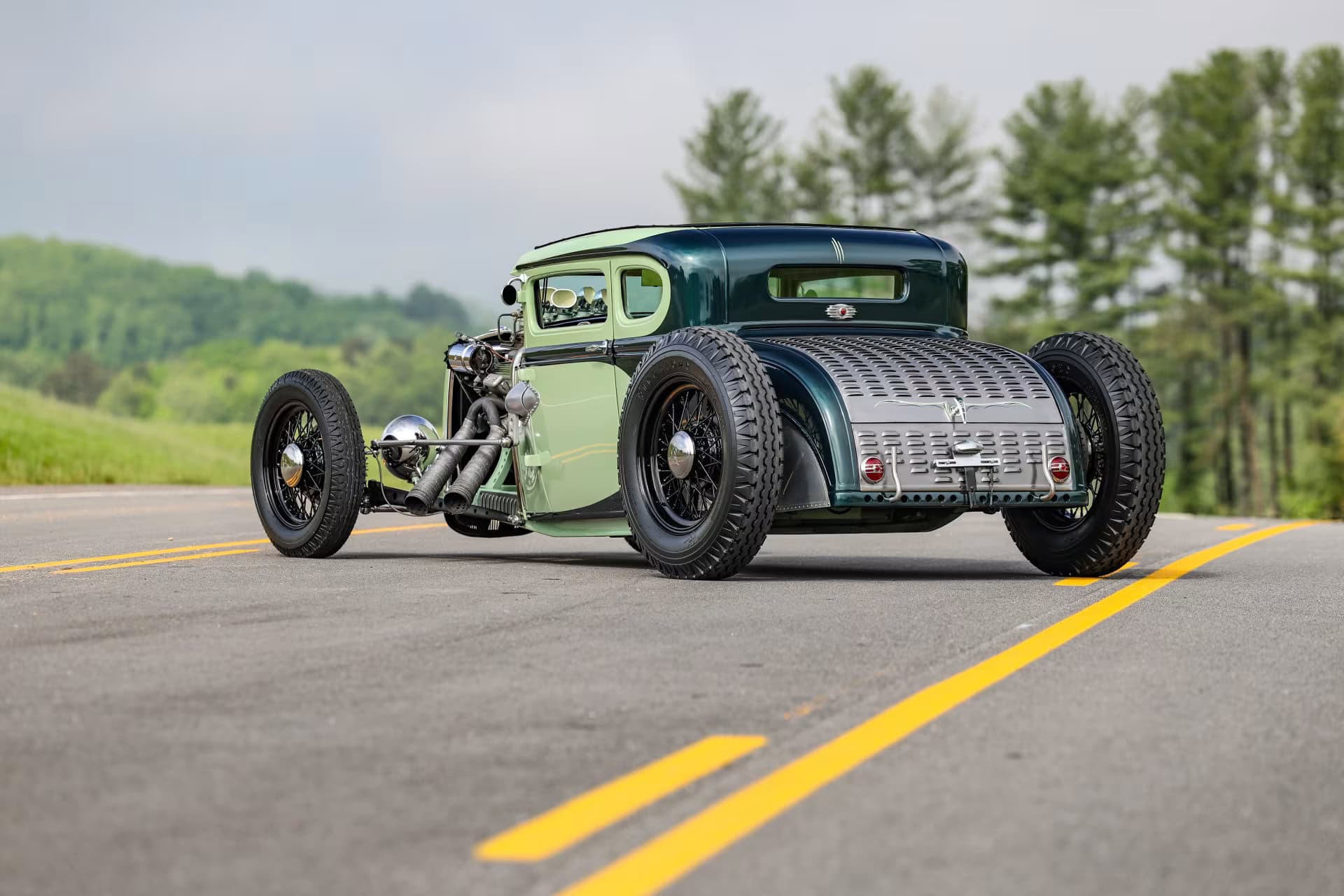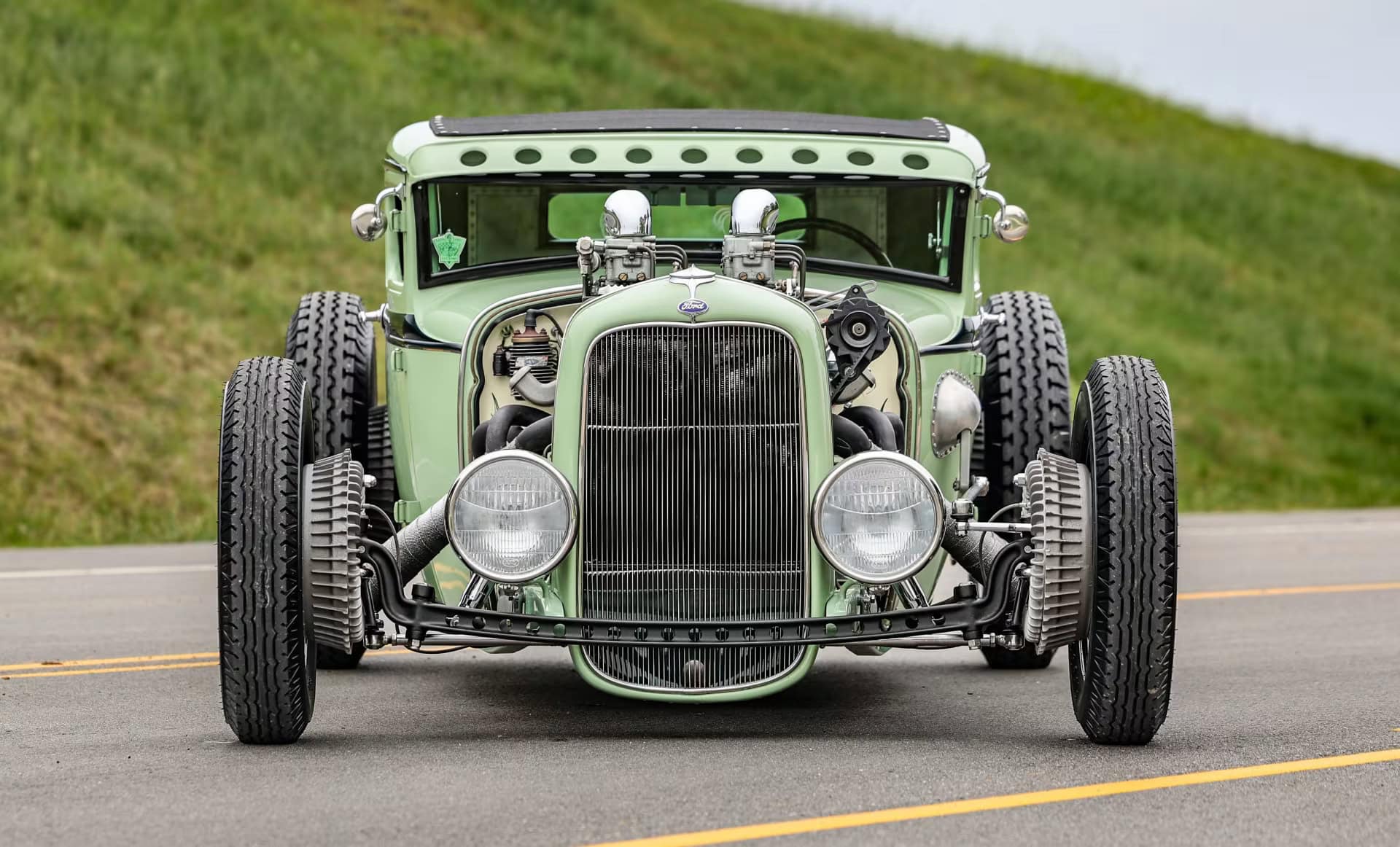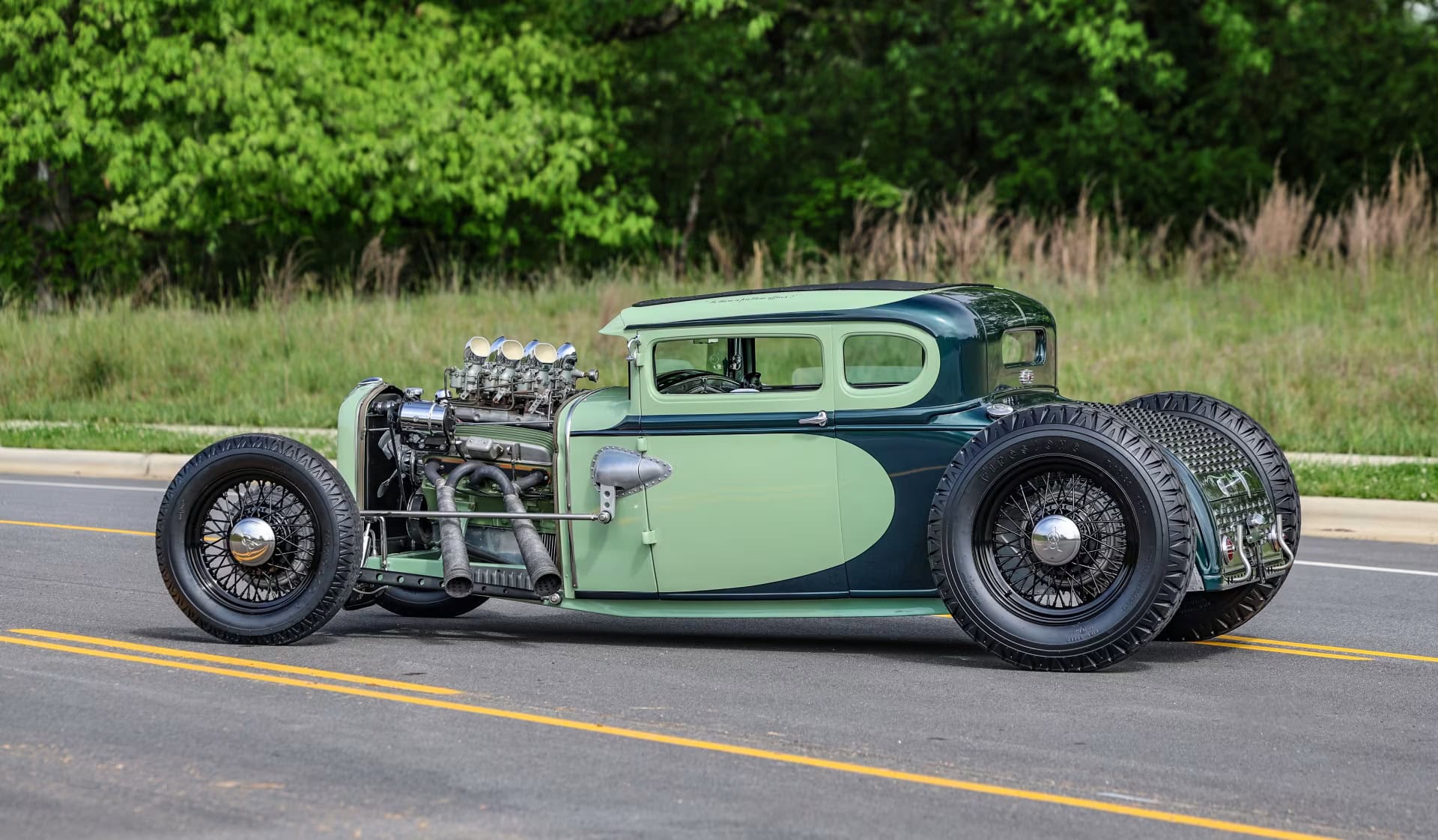 Le vert clair est une couleur Chrysler 46 et la teinte plus foncée est empruntée à Mercedes. Le style est proche de l’ancien coupé “Pierson Brothers” qui s’était fait remarquer lors des débuts de Bonneville Salt Lake’s. Le couvercle du coffre n’a pas été peint pour lui donner un aspect volontairement inachevé… Venons-en au châssis, c’est un Ford’32 pincé de 3 pouces, relevé de 14 pouces à l’arrière et raccourci de 6 pouces à l’avant.