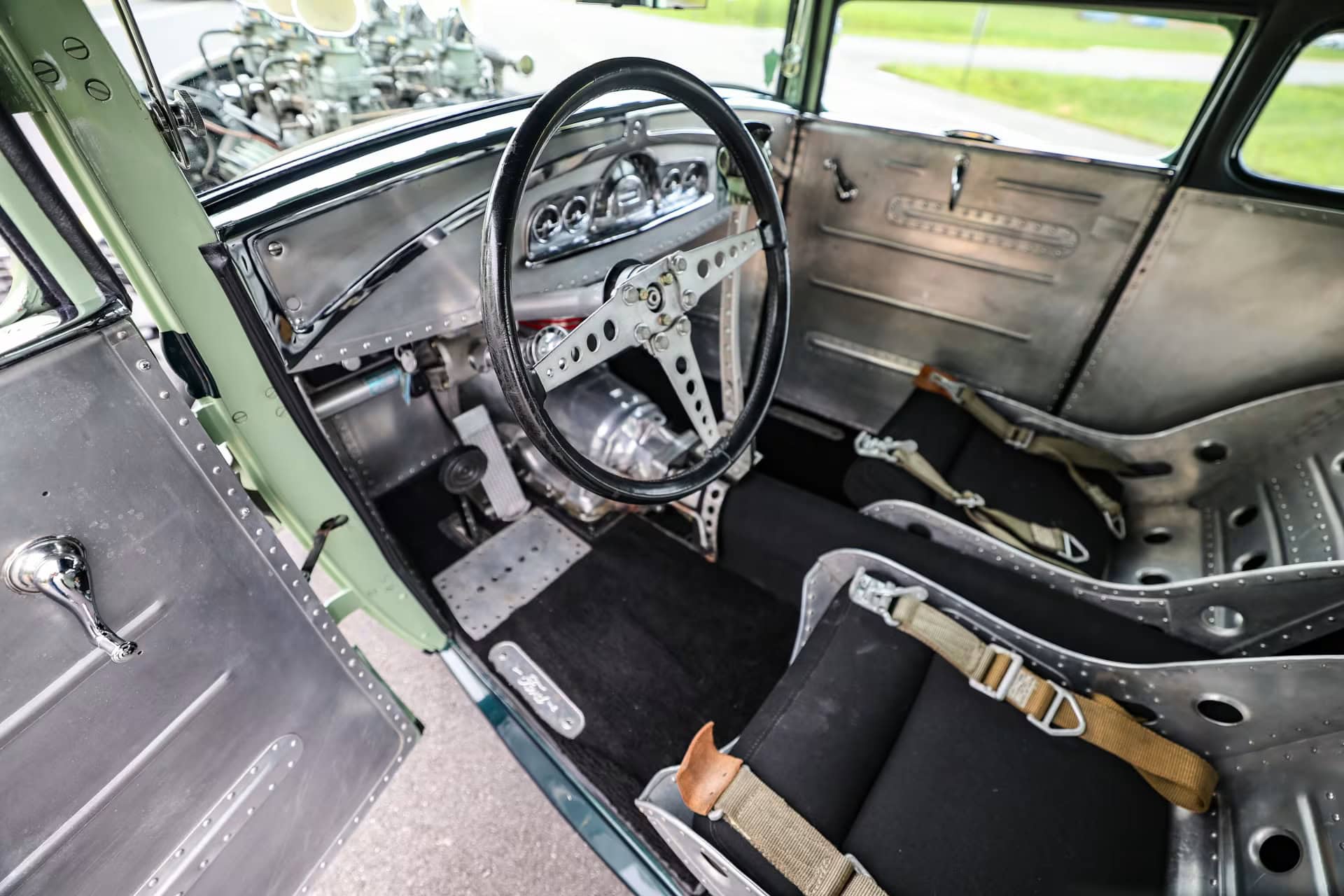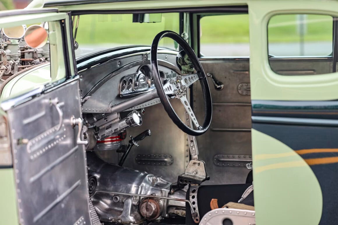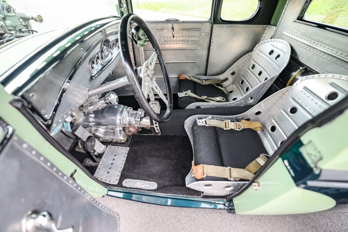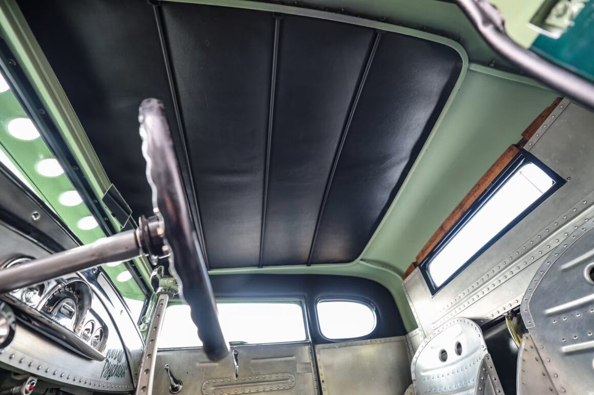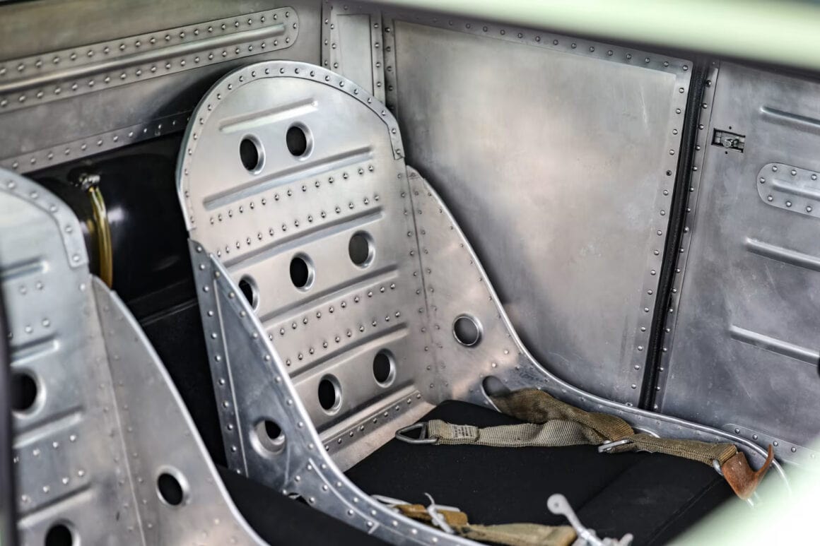 Le boîtier poli est un élément important dans un intérieur chargé de caractéristiques importantes… L’intérieur comporte un plancher construit à partir de zéro. La majeure partie de l’intérieur est constituée de panneaux d’aluminium rivetés. Combiné aux sièges de bombardier B-52 construits sur mesure avec des ceintures B-52 d’origine, l’ensemble crée une sensation d’avion de 2ième Guerre mondiale. Les compteurs Pontiac 49 y contribuent.