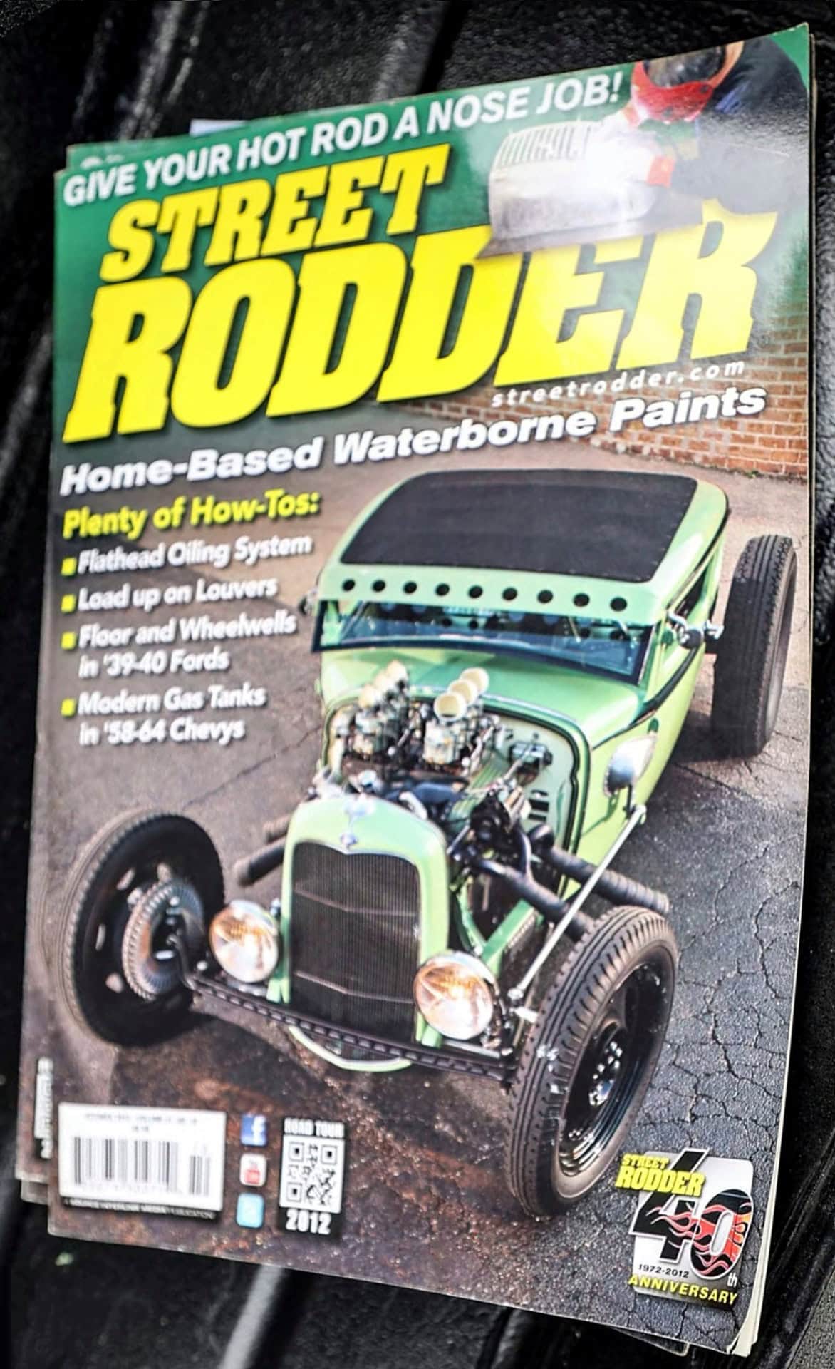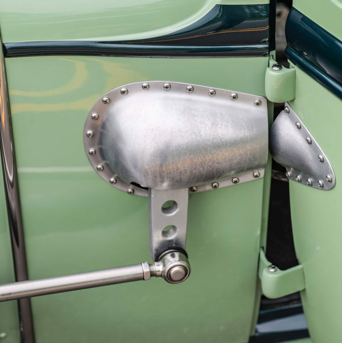 OK… L’ami de Larry, Jim, de “Lions Rod Shop”, a réalisé 171 “Louvers” dans une tôle d’acier frais, qui a ensuite été soudée à un cadre tubulaire suivant l’emplacement d’ouverture. D’autres “Louvers” ont été perforés dans le panneau inférieur, où Larry a installé des “Nerf-bar’s” et les feux arrière d’une Dodge’36. Chez Flat Line Kustoms à Elgin, dans l’Illinois, Bob Sanford a effectué la carrosserie finale et peint les deux tons de vert en Envirobase PPG.