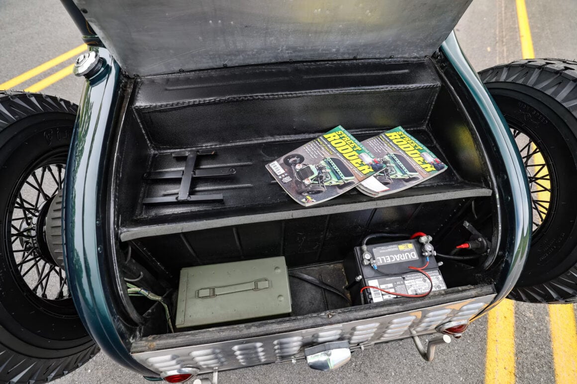 Le vendeur avait acheté le coupé au propriétaire d’origine 45 ans plus tôt… Après le sablage et quelques réparations des panneaux inférieurs, le toit du coupé a été diminué de 6 pouces. Une visière a été soudée en place pour obtenir un look épuré et la cloison pare-feu a été reculée pour plus de dégagement du moteur. La calandre et les phares d’une Ford’32 ont été ajoutés. Mais Larry voulait un couvercle de coffre “différent”…