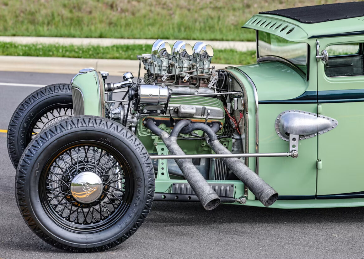 La puissance est livrée par une rampe d’alimentation Eelco à une demi-douzaine de Holley 94 double corps avec des collecteurs d’admission Edelbrock X1 Ram Log 6×2. La transmission TH350 a été construite chez Pioneer Transmission Service à Franklin Park, Illinois, et modifiée avec un kit de changement de vitesse manuel inversé. Et contrairement à la plupart des transmissions des autres Rod’s, celle-ci n’est pas cachée.