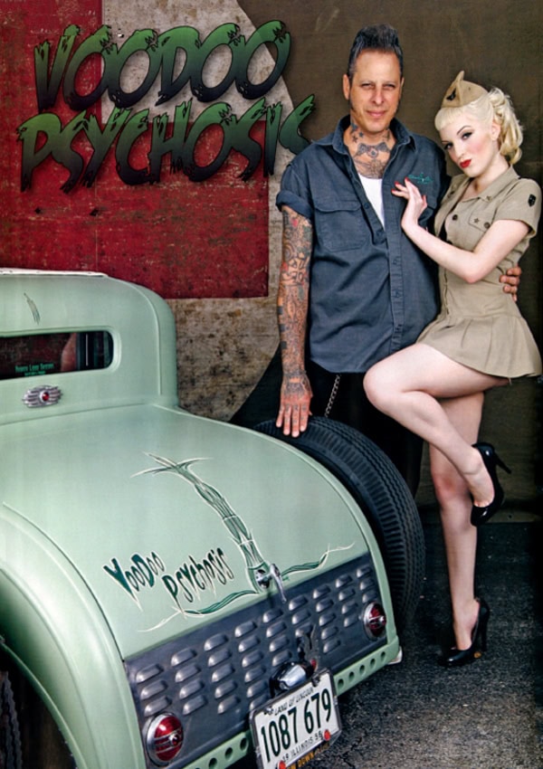 Un réservoir d’essence Dodge’36 est situé derrière les sièges de bombardier B-52. Le volant est monté sur une colonne indivit et le rétroviseur provient d’un bus Greyhound’27. Ce Hot Rod “Voodoo Psychosis” a été construit en six mois. Depuis qu’il est terminé, Larry le conduit aussi souvent qu’il le peut : “Il gagne des prix à peu près partout où il va”, dit-il, et il s’amuse à mettre son Hot Rod en valeur avec diverses Shemales explosives…