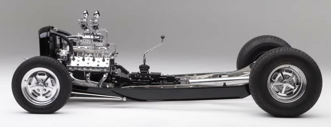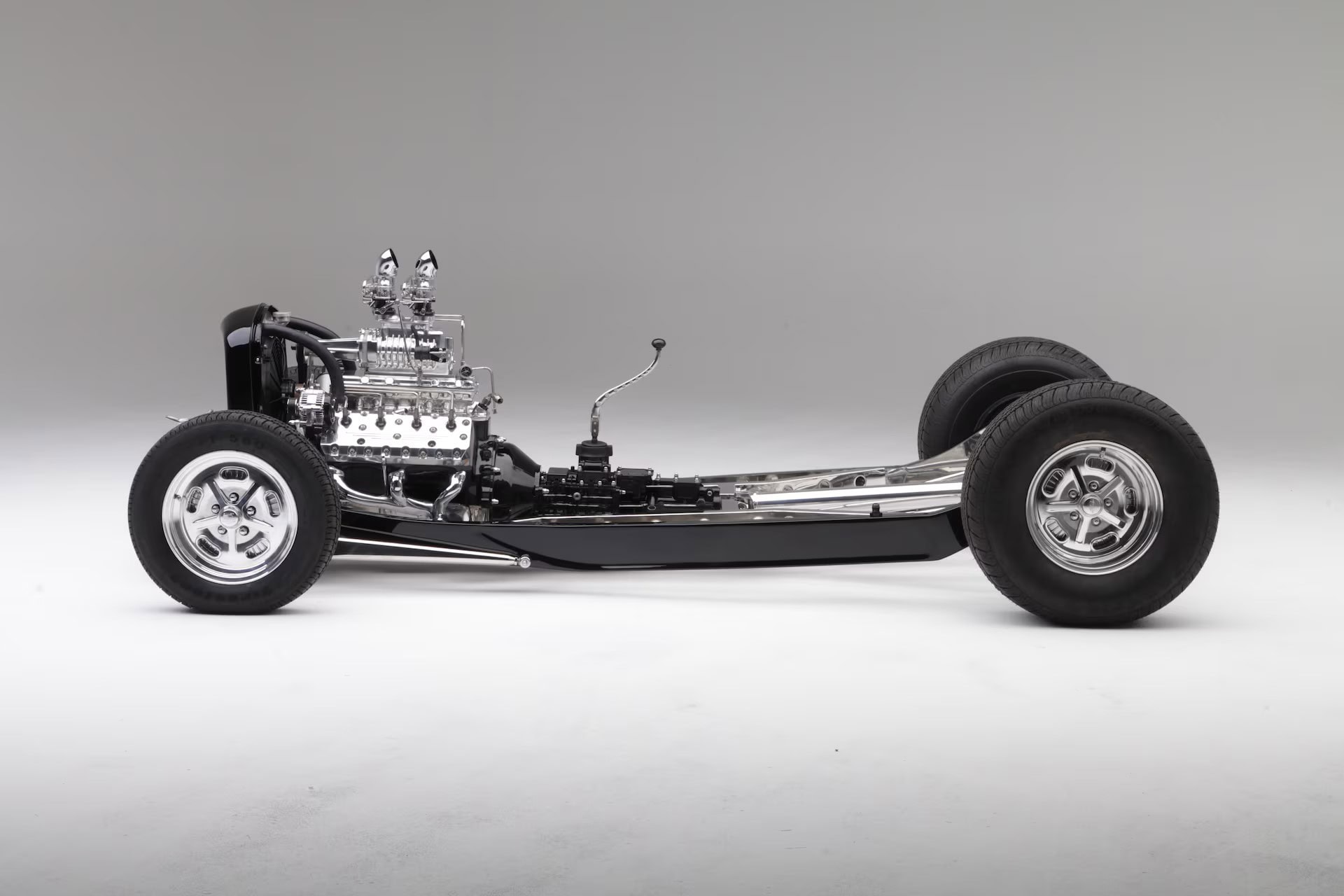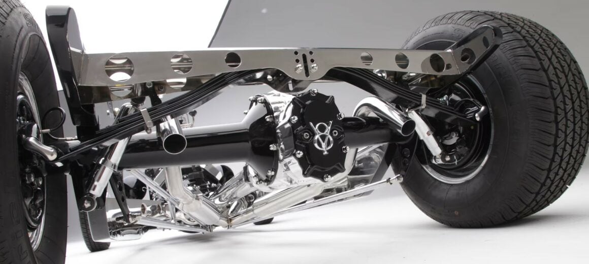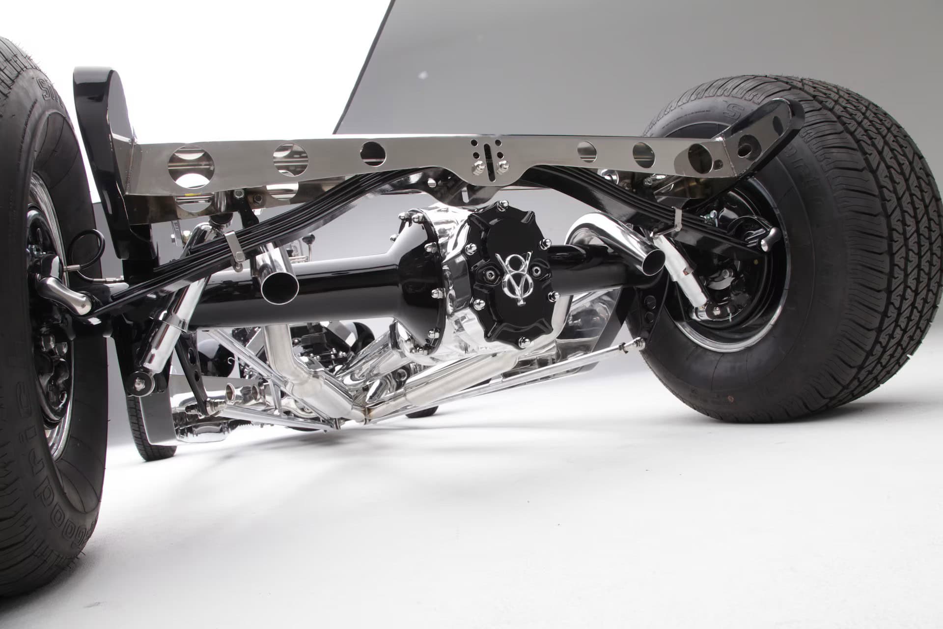 “Je garde le micro… Je suis tout émoustillé de savoir que des Frenchies vont me lire… Je suis par contre interrogatif de ce qu’il vont en faire ? Le Châssis modifié a été créé à l’aide de rails d’estampage de chez Reid’s Rod Parts à Orange, Californie. J’ai construit les membres K, les traverses et la plaque de boxe en acier inoxydable. Des amortisseurs tubulaires et des ressorts à lames de chez Reid ont été ajoutés aux deux extrémités, avec un essieu à poutre en I à l’avant et des essieux arrière Works”.