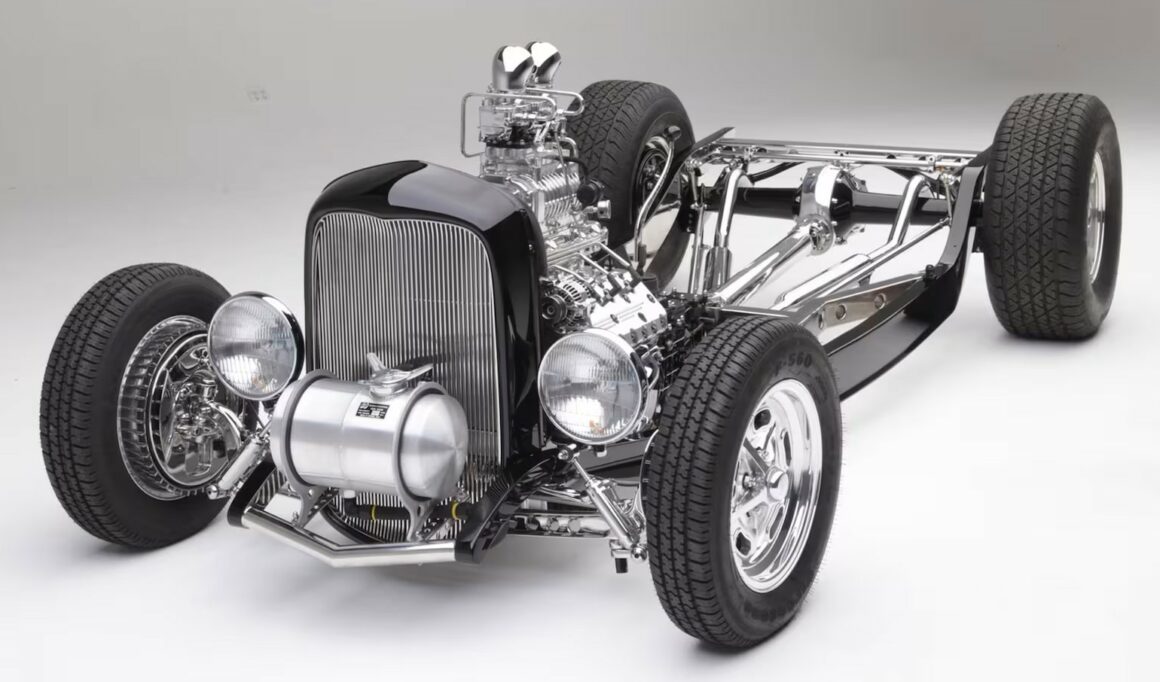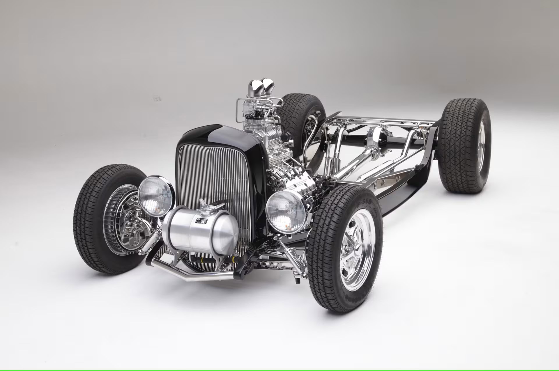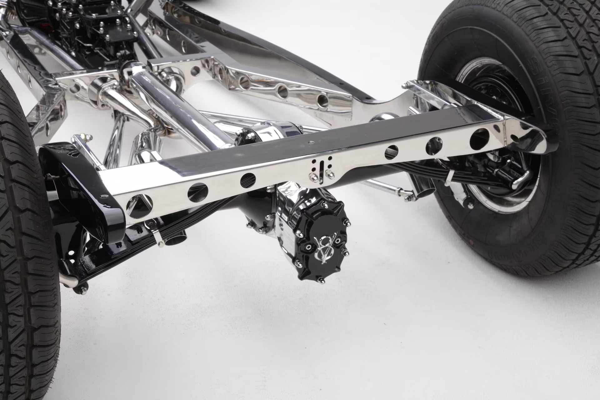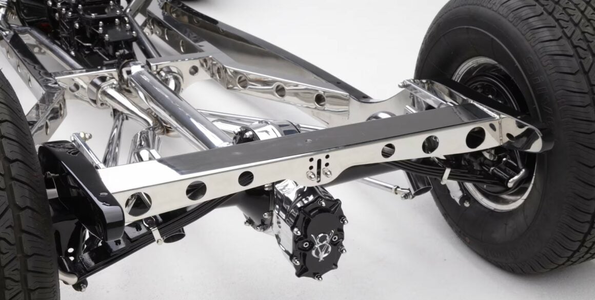 “Je garde le micro… Je suis tout émoustillé de savoir que des Frenchies vont me lire… Je suis par contre interrogatif de ce qu’il vont en faire ? Le Châssis modifié a été créé à l’aide de rails d’estampage de chez Reid’s Rod Parts à Orange, Californie. J’ai construit les membres K, les traverses et la plaque de boxe en acier inoxydable. Des amortisseurs tubulaires et des ressorts à lames de chez Reid ont été ajoutés aux deux extrémités, avec un essieu à poutre en I à l’avant et des essieux arrière Works”.