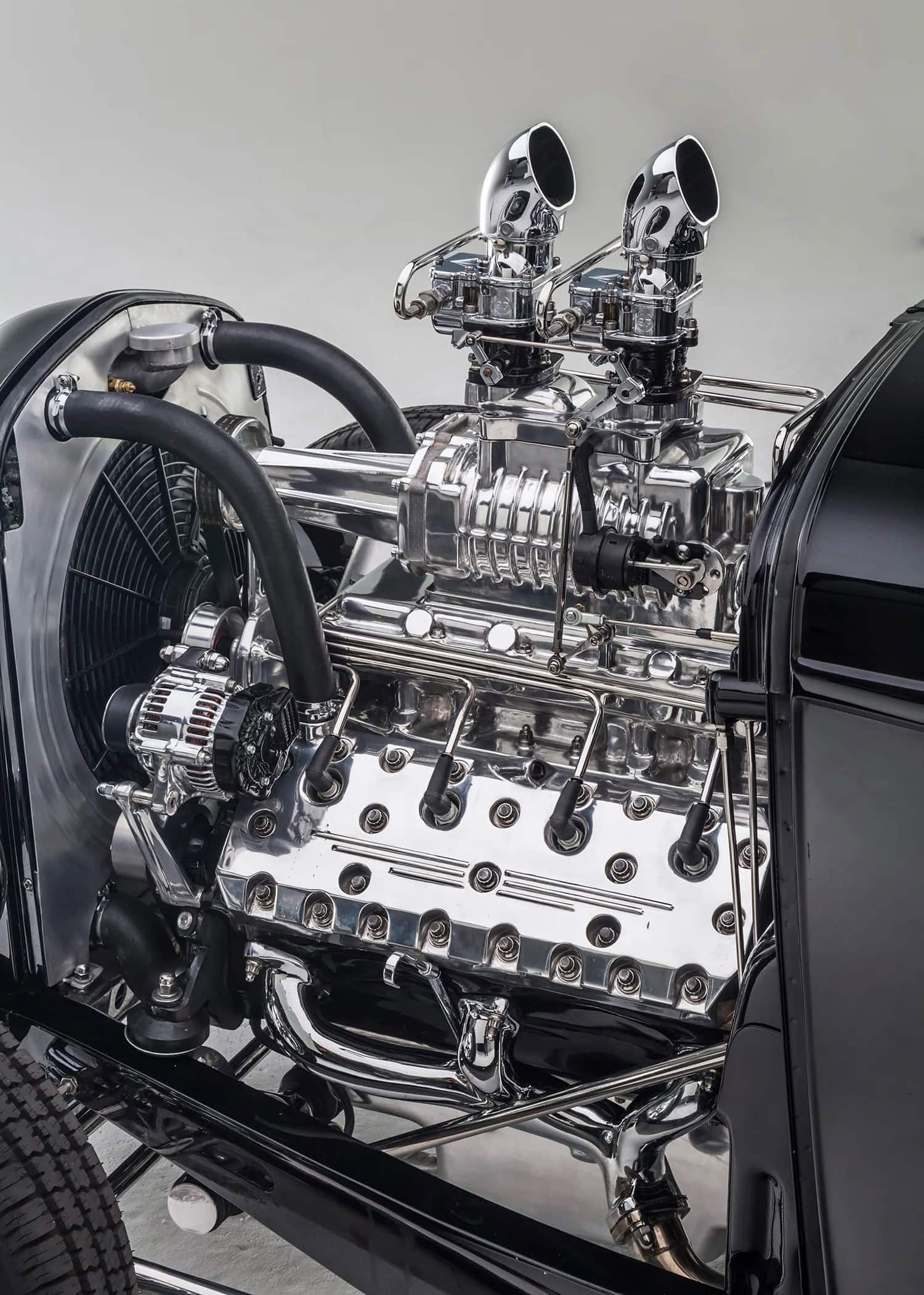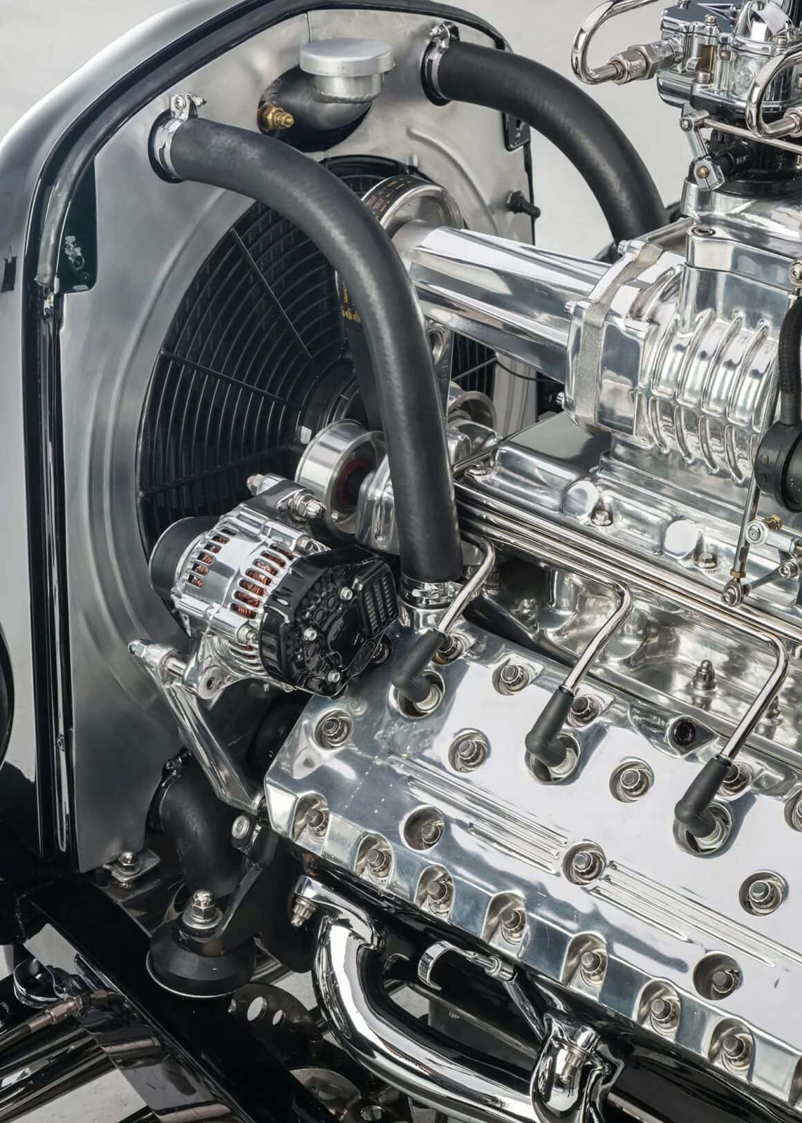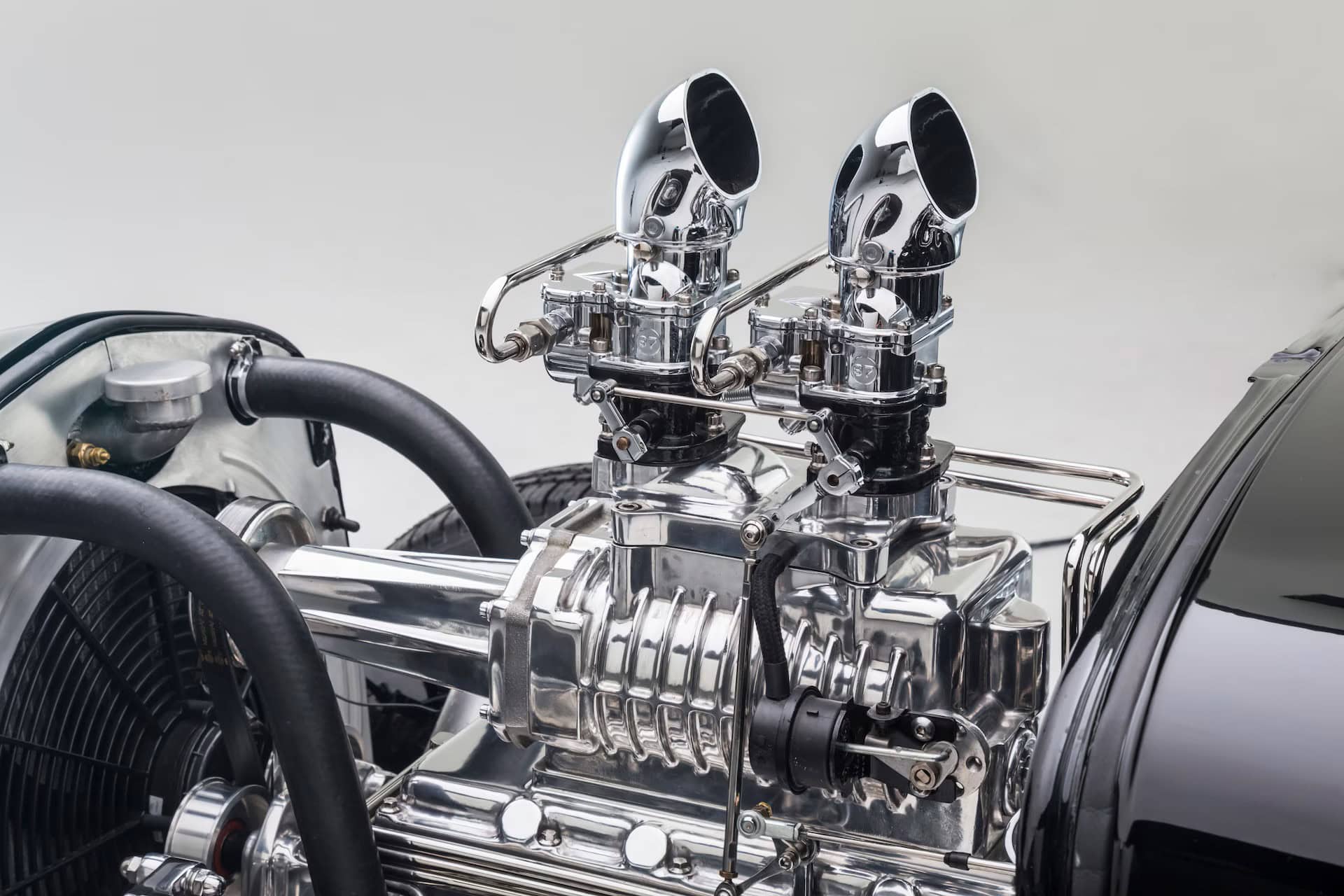 À l’extérieur, le compresseur et le collecteur Tom Roberts Design, les deux carburateurs Stromberg 97, les écopes et les têtes en aluminium Wilson & Woods ont été polis et plaqués pour une brillance exceptionnelle. Une magnéto Vertex enflamme le mixage, et Flathead Jack a gérer ce qui restait. Pour tout garder au frais un radiateur en aluminium Mattson’s soutenu par un ventilateur électrique Spal de The FanMan a été placé.