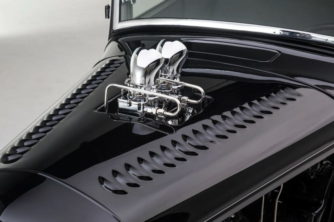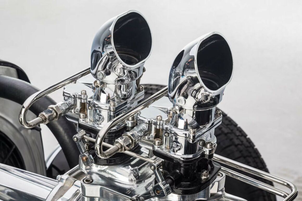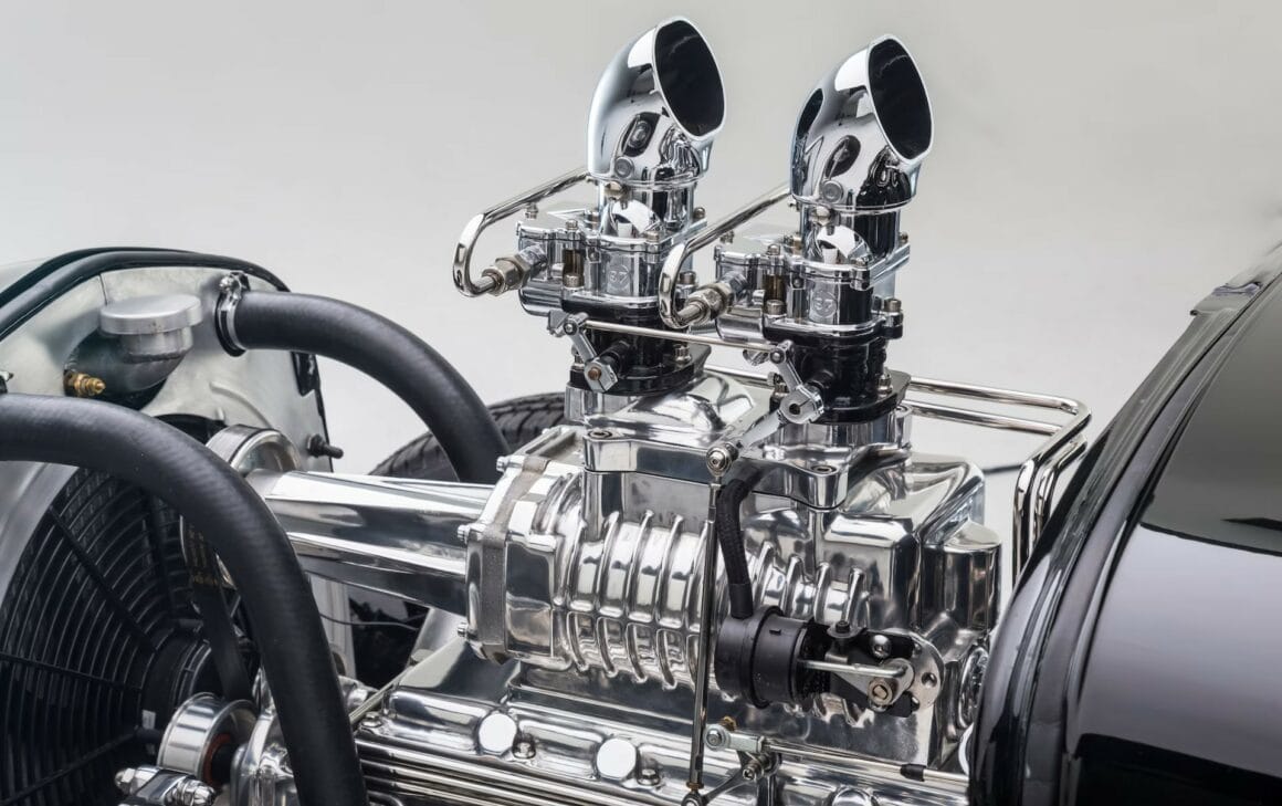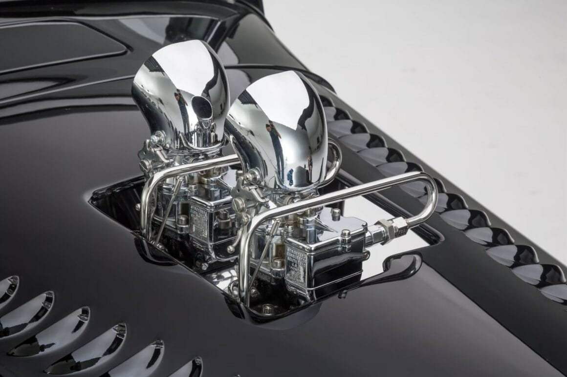 À l’extérieur, le compresseur et le collecteur Tom Roberts Design, les deux carburateurs Stromberg 97, les écopes et les têtes en aluminium Wilson & Woods ont été polis et plaqués pour une brillance exceptionnelle. Une magnéto Vertex enflamme le mixage, et Flathead Jack a gérer ce qui restait. Pour tout garder au frais un radiateur en aluminium Mattson’s soutenu par un ventilateur électrique Spal de The FanMan a été placé.