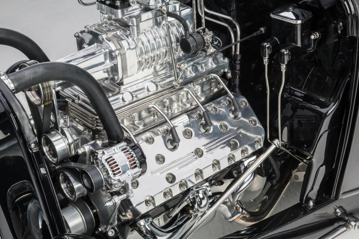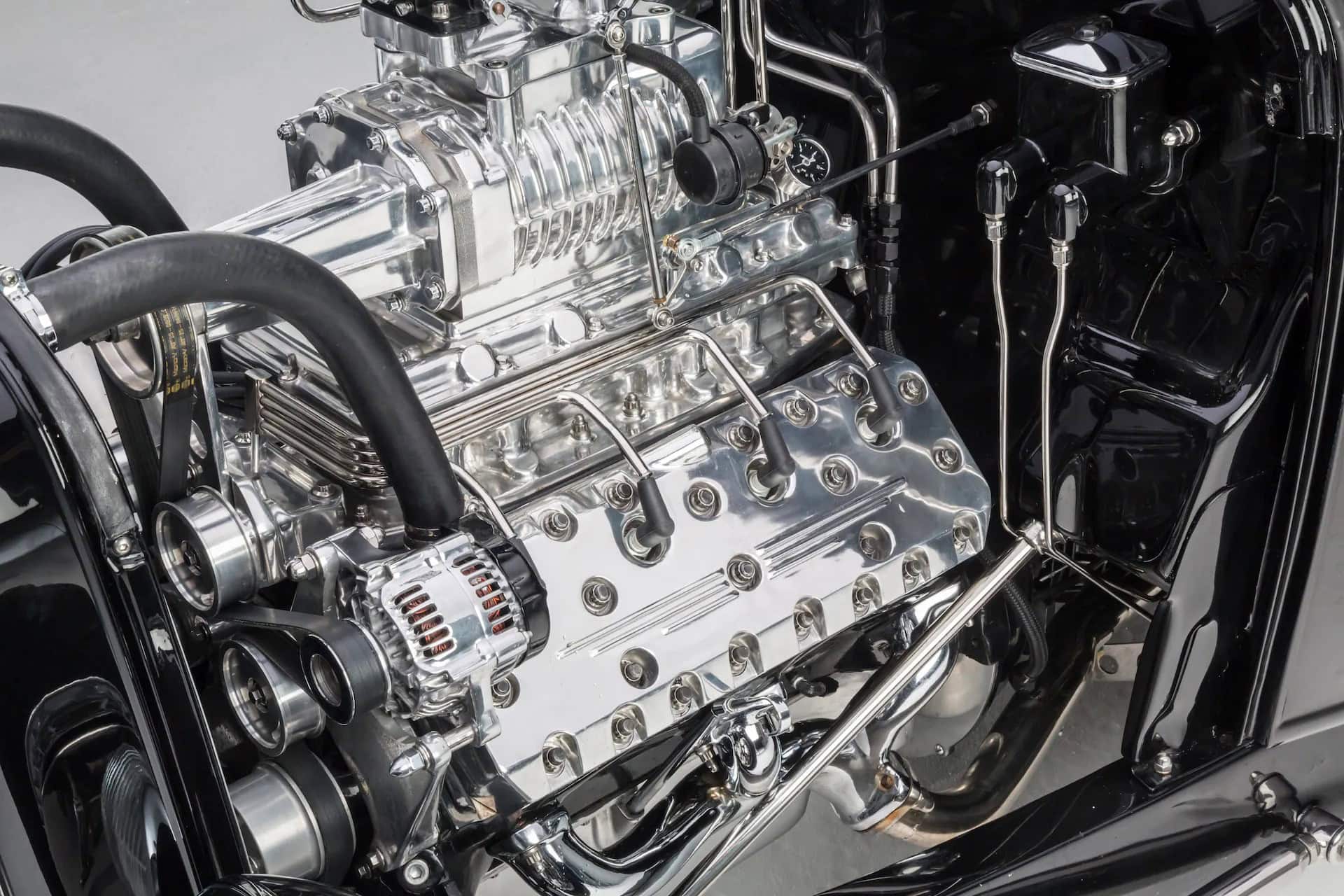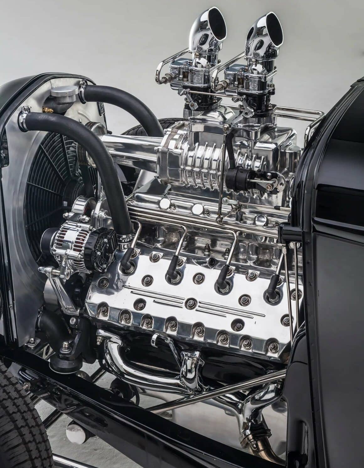 C’est volontairement compliqué pour un f… plein la vue aux rigolos. Mais Ken avait fabriqué le même système pour l’utiliser sur son précédent Hot Rod’32. Le but de toute cette ingénierie du système de carburant n’est pourtant que d’alimenter le V8 Flathead avec compresseur. C’est BEP Racing Engines situé à Orange County qui a effectué l’usinage sur le V8 286ci, que Ken a assemblé avec des pistons Ross, un villebrequin Scat, et d’autres composants internes HP.