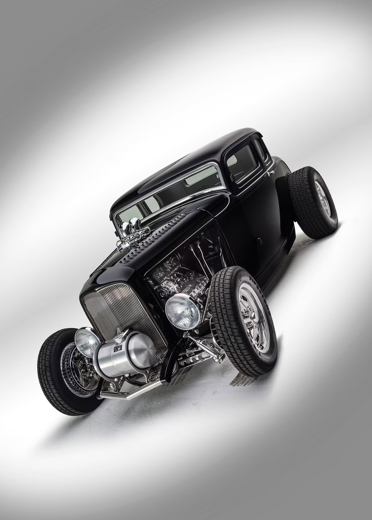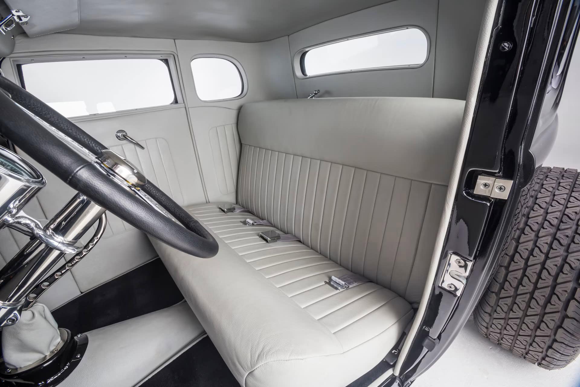 Ken Thurrm garde le crachoir : “C’est Reid’s Rod Parts qui a fourni la réplique de la calandre Deuce. La capuche à persiennes est une pièce faite maison. L’éclairage est assuré par des phares reconstruits par Greening Auto Company et des feux arrière Reid’s…. C’est Eddie Ruiz de Auto Collectizone à Riverside, en Californie, qui a en finale préparé la tôle pour la peinture du Coupé avec du PPG Jet Black. Notez ce qui me vient en tête, à savoir que les poignées de porte proviennent de CW Moss”.