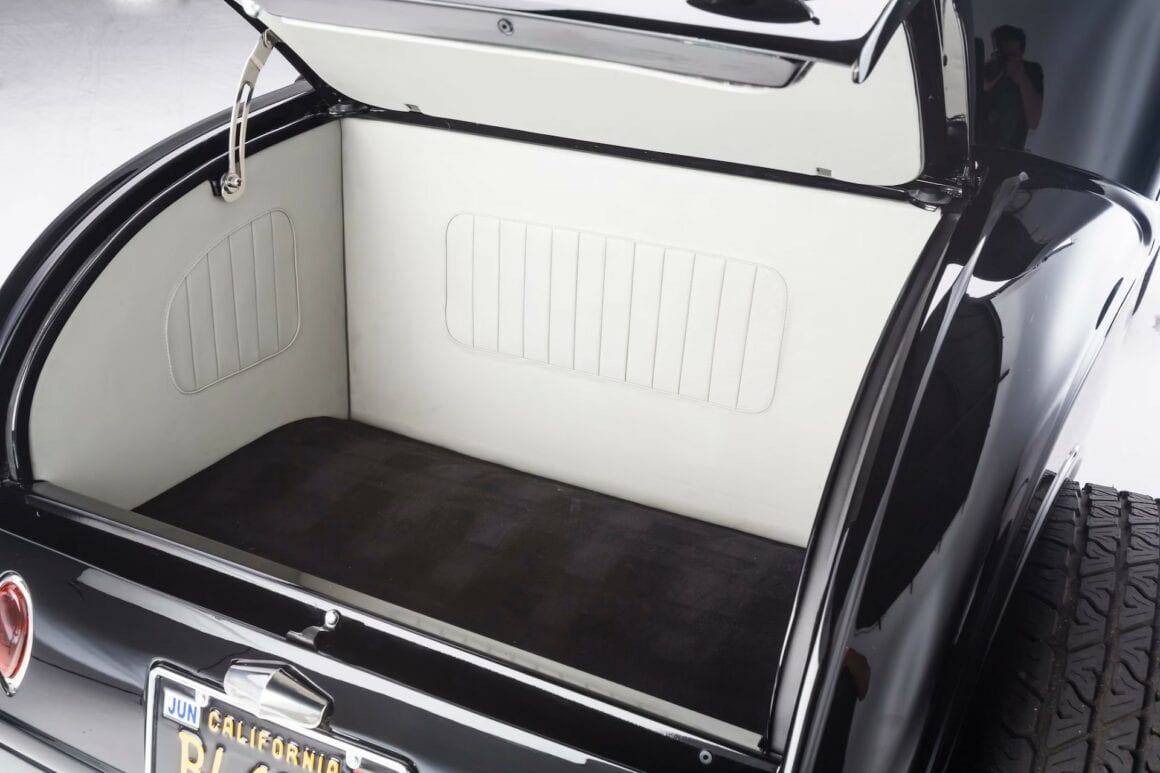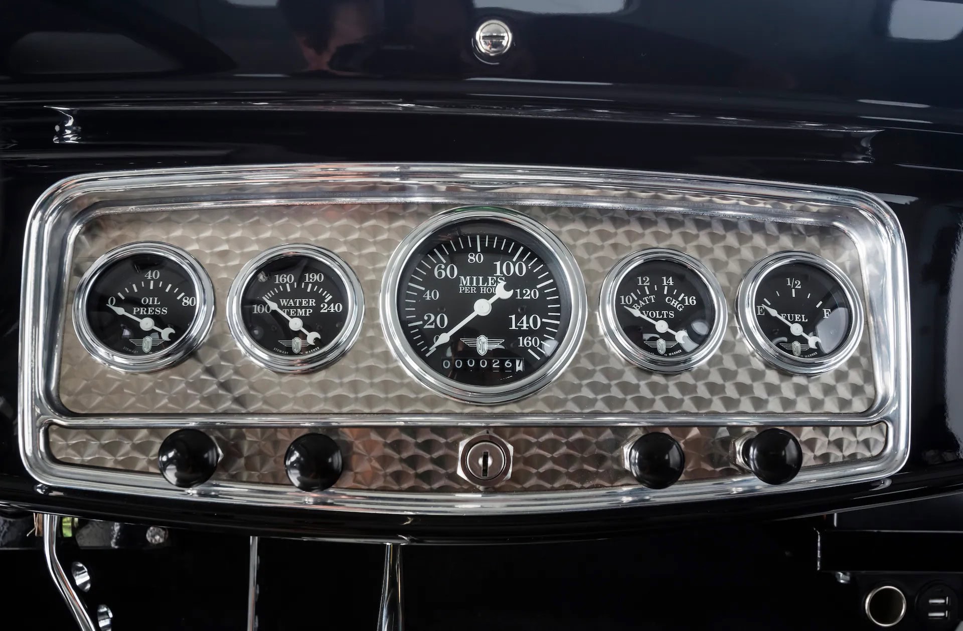 Ken a installé des compteurs d’ailes Stewart-Warner dans un insert du tableau de bord, gardant le tachymètre de course S-W pour sa place sur la colonne de direction Borgeson. Du cuir gris clair recouvre la banquette, les panneaux intérieurs et la garniture de toit Glide Engineering, ancrée par une moquette gris foncé au sol. Jerry Ross de Jerry’s Custom Auto Service s’étant préalablement assuré que tout le câblage était bien fait.
