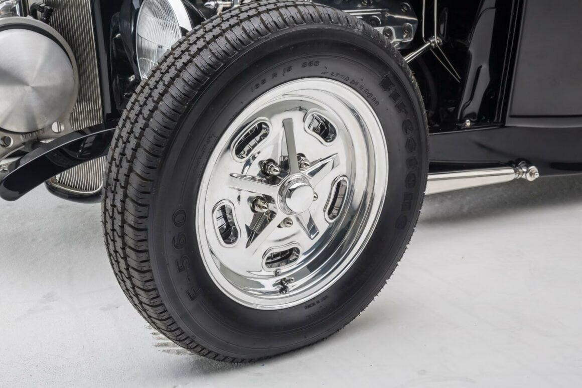 “Ils vont en paire avec le pont-différentiel Halibrand. Les freins arrière sont des tambours Currie. Les freins avant sont des tambours SO-CAL style Buick avec ailettes. Les jantes sont des Santa Fe de 15po de Billet Specialties avec des pneus 560 Firestone AV et 860 BFGoodrich Silvertown AR. Ce Hot Rod est plus qu’une amélioration c’est une création unique. Une grande pompe à carburant de marque Aéromotrice a été placée sous le tableau de bord parce qu’il n’y avait pas d’autre place”.