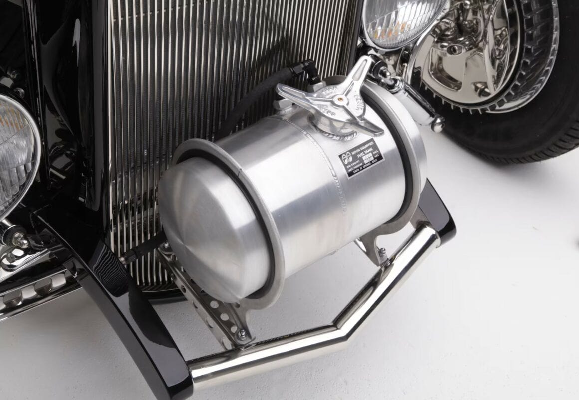 Un solénoïde coupe le tube de ventilation dans le réservoir principal de sorte que la conduite de retour devienne l’évent qui force le carburant à retourner dans le réservoir lunaire devant la calandre… Ken actionne un interrupteur à bascule derrière la coque de la grille pendant le remplissage du réservoir, puis un autre interrupteur à l’intérieur de la voiture actionne la pompe Aeromotive, afin que Ken puisse utiliser le réservoir lunaire comme réserve.