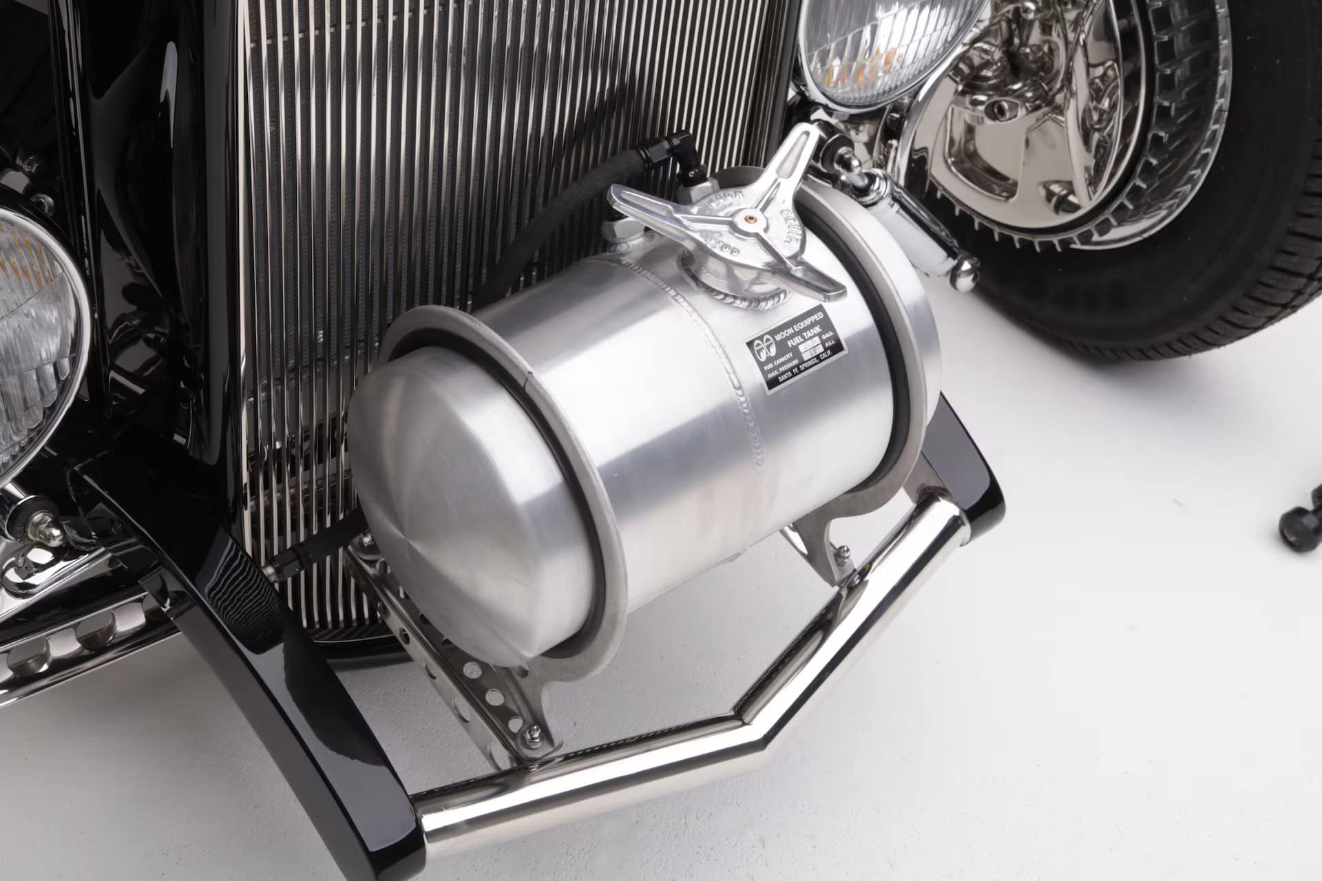“Je me suis amusé à créer un système ludique et inutile avec deux réservoirs, pour le simple bonheur de me faire chier sur des complications inutiles mais belles à voir, car il y a deux réservoirs connectés, celui devant la calandre et celui du coffre qui cube 17 gallons monté derrière le siège banquette. Un tube de ventilation est situé à 1po du haut du réservoir principal, et un retour de carburant va au réservoir lunaire de calandre”… Ken a un coté assez fou…