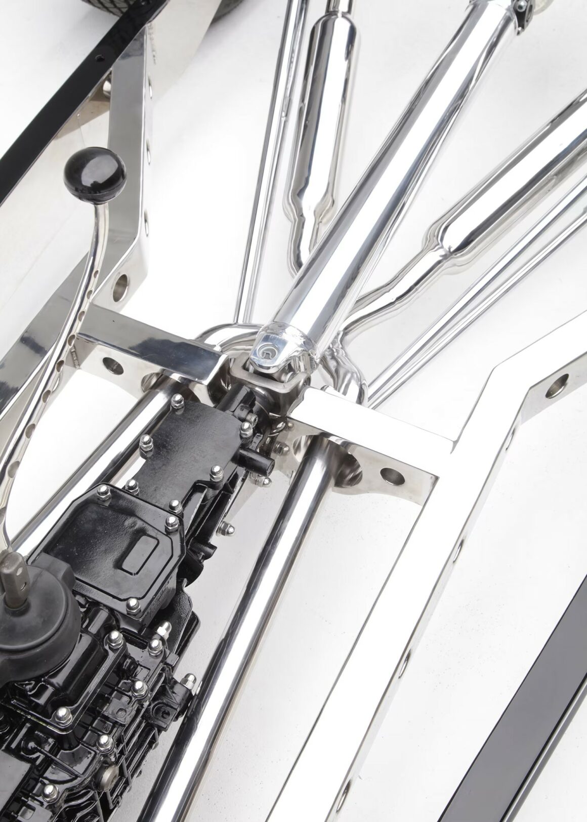 Afin de cacher et de protéger les conduites électriques, de carburant et hydrauliques, Ken a utilisé des tubes en acier inoxydable, en les acheminant à travers les rails du Châssis. Bédard Automotive a reconstruit la transmission à cinq vitesses Tremec 3550 avec un embrayage et un volant d’inertie McLeod. Des pièces percées de troustrous définissent un thème pour l’intérieur, du levier de vitesses et des pédales au volant Sprint Car de Reid’s Rod Parts.