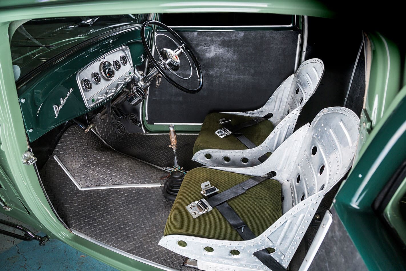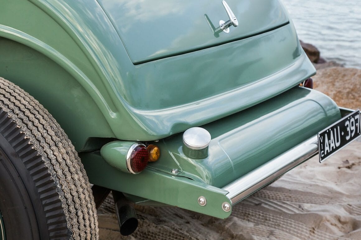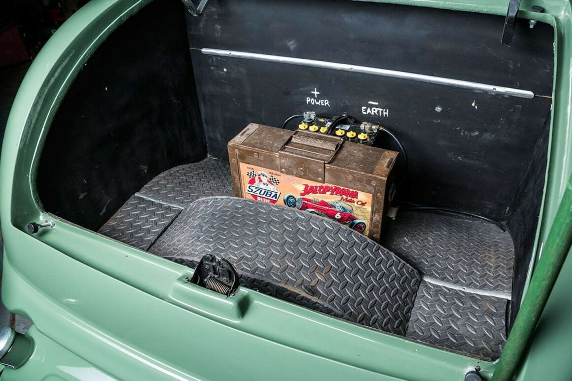 Billy O’Neill a mélangé la couleur de la peinture “Morris Minor Green”. La praticité était plus importante que la nostalgie ici. Sous le capot se trouve un vénérable bloc V8 type Y surmonté d’une prise d’air Offenhauser avec trois carbus 97 et un compresseur. Un coup d’œil à l’intérieur de la cabine révèle des sièges de bombardier, un tableau de bord Auburn et un volant des années ’40. Pete ne se souvient pas d’où venaient les sièges de bombardier repo : “Quelqu’un aux États-Unis les a faits. Je ne souviens plus du reste”... Comme toutes les voitures du hangar de Pete, dans 25 ans, ce Hot-Rod aura toujours l’air parfait, il est intemporel. Pas de teinte de peinture day-glo toxique, pas de billettes en alu, pas de combo roue/pneu. Non, il n’y a pas de numéro de pièce ou de catalogue pour cela. Il n’y a rien dans ce hangar qui n’ait pas le même genre de magie. Rien d’exagéré, rien de sous-fait, rien pris dans une vaine tentative d’être dur ou cool, ils se tiennent tous selon leurs propres termes. En regardant certaines de ses voitures, il est clair qu’une côtelette dans l’esprit de Pete signifie quatre pouces. En plus de ce que Pete a construit lui-même, il y a les reliques, une berline ’46 et une Customline en spécifications d’origine, des machines à remonter le temps qui sont régulièrement conduites.