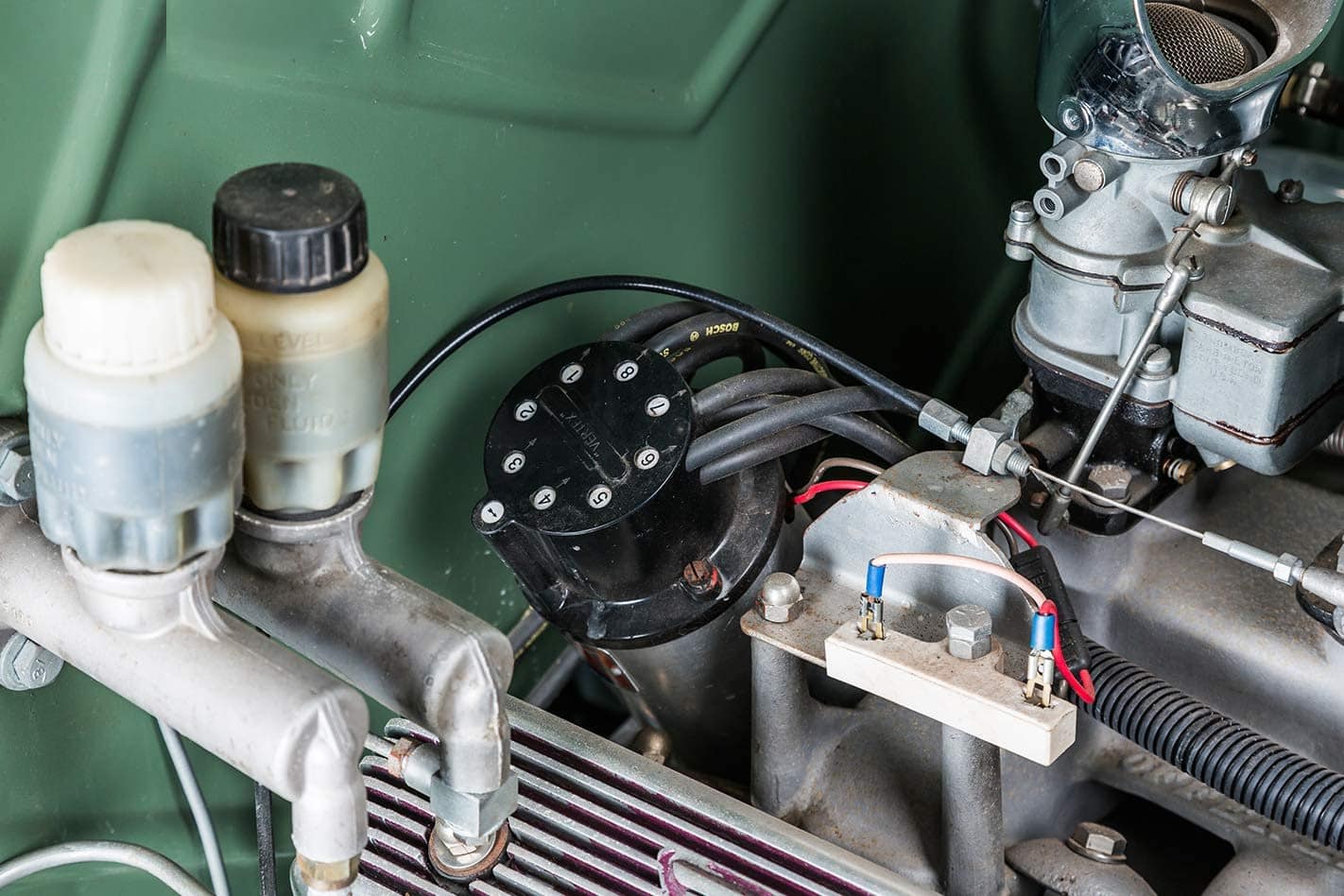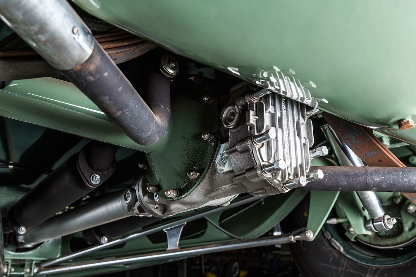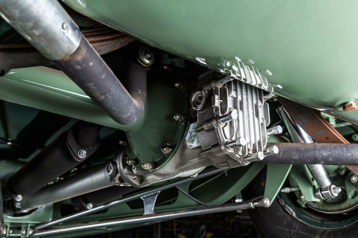 Billy O’Neill a mélangé la couleur de la peinture “Morris Minor Green”. La praticité était plus importante que la nostalgie ici. Sous le capot se trouve un vénérable bloc V8 type Y surmonté d’une prise d’air Offenhauser avec trois carbus 97 et un compresseur. Un coup d’œil à l’intérieur de la cabine révèle des sièges de bombardier, un tableau de bord Auburn et un volant des années ’40. Pete ne se souvient pas d’où venaient les sièges de bombardier repo : “Quelqu’un aux États-Unis les a faits. Je ne souviens plus du reste”... Comme toutes les voitures du hangar de Pete, dans 25 ans, ce Hot-Rod aura toujours l’air parfait, il est intemporel. Pas de teinte de peinture day-glo toxique, pas de billettes en alu, pas de combo roue/pneu. Non, il n’y a pas de numéro de pièce ou de catalogue pour cela. Il n’y a rien dans ce hangar qui n’ait pas le même genre de magie. Rien d’exagéré, rien de sous-fait, rien pris dans une vaine tentative d’être dur ou cool, ils se tiennent tous selon leurs propres termes. En regardant certaines de ses voitures, il est clair qu’une côtelette dans l’esprit de Pete signifie quatre pouces. En plus de ce que Pete a construit lui-même, il y a les reliques, une berline ’46 et une Customline en spécifications d’origine, des machines à remonter le temps qui sont régulièrement conduites.