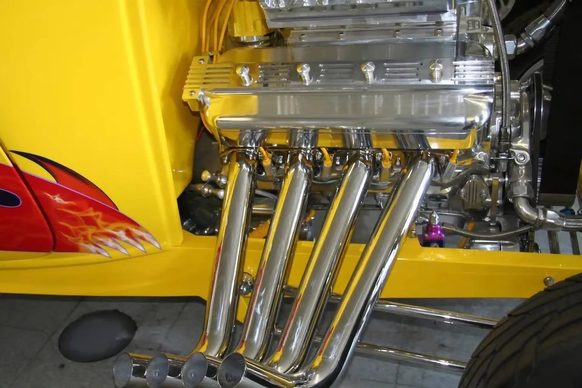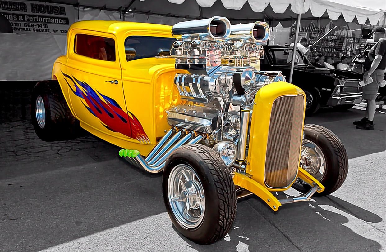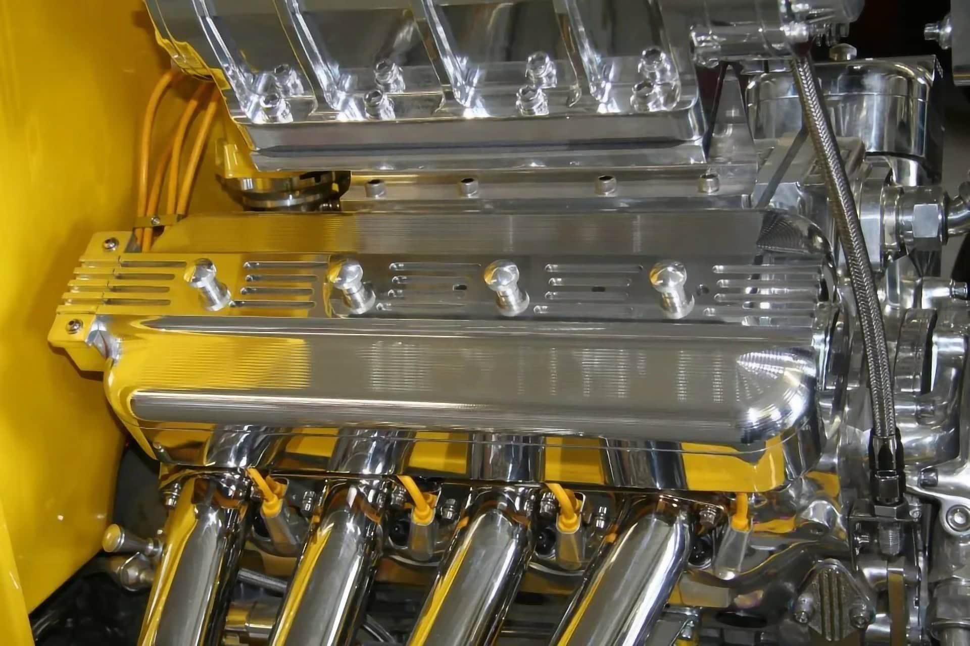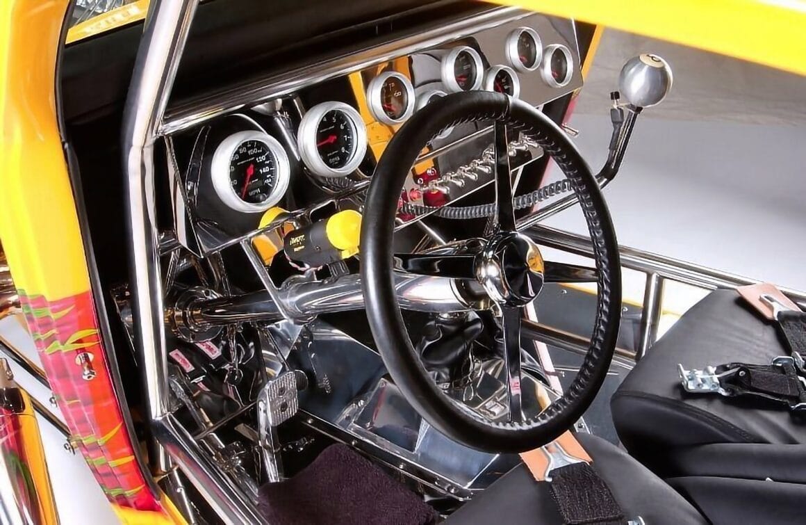 Les deux Blowers 671 sont surmontés d’un quatuor de carburateurs Demon chromés. Les en-têtes de style zoom sont en acier inoxydable et recouverts d’un revêtement Jet-Hot à l’intérieur. La plomberie, y compris le boîtier du câblage, est entièrement en acier inoxydable poli. Un radiateur Be Cool personnalisé, spécialement conçu pour ce projet, permet de contrôler la température du moteur. Une boîte de vitesses Turbo 400 polie envoie toute cette puissance à un quick-change de 9 pouces. De plus, Powerhouse a retravaillé la suspension et l’ensemble de la suspension avant et arrière ainsi que réalisé les panneaux en acier inoxydable poli avec des amortisseurs personnalisés à chaque coin. La carrosserie a été pulvérisée d’une peinture jaune avec des flammes réalisées à l’aérographe. Le résultat est un Hot Rod Coupe pas comme les autres qui se démarque facilement dans les rangées des ’32 lors des spectacles…