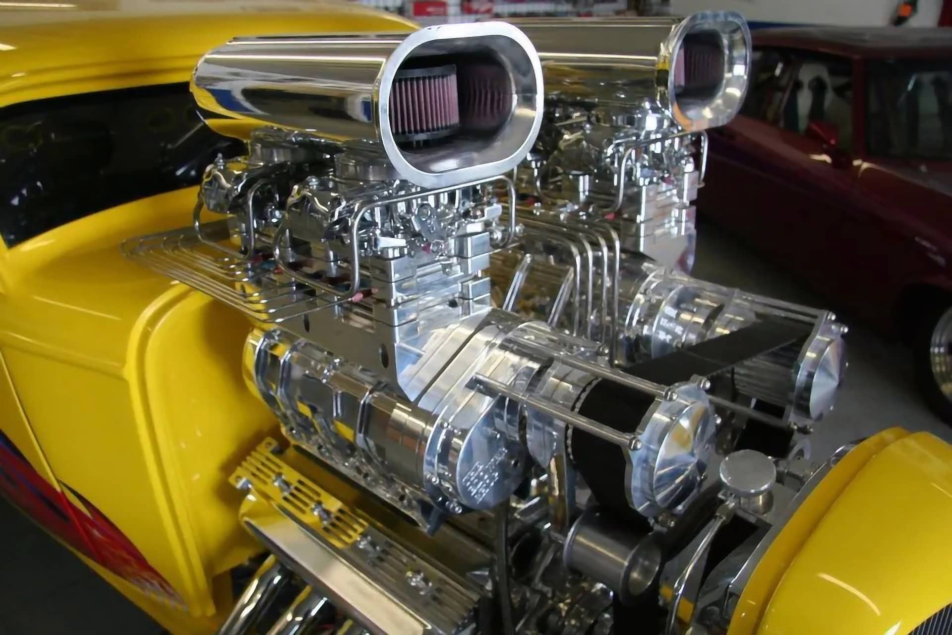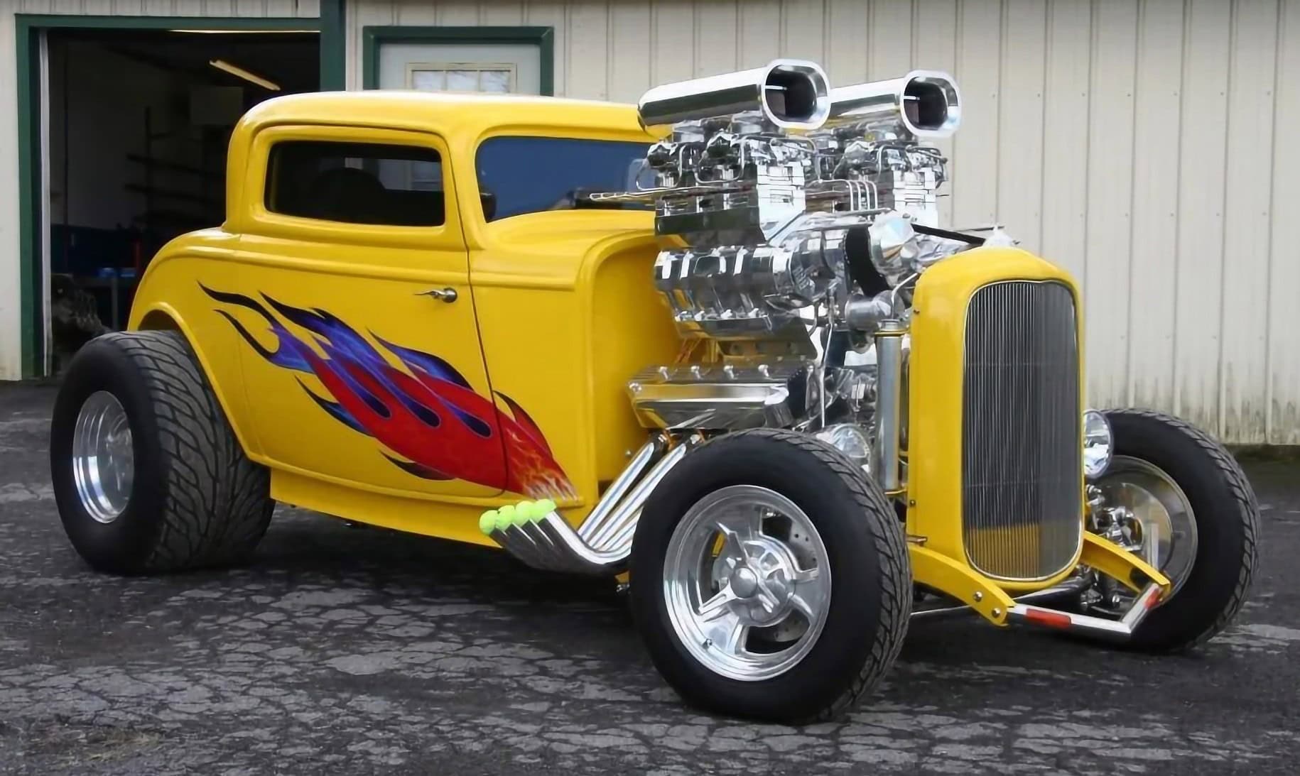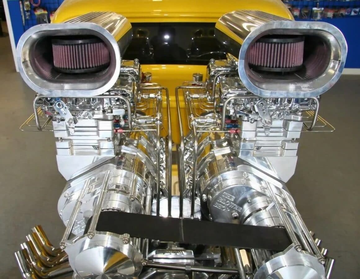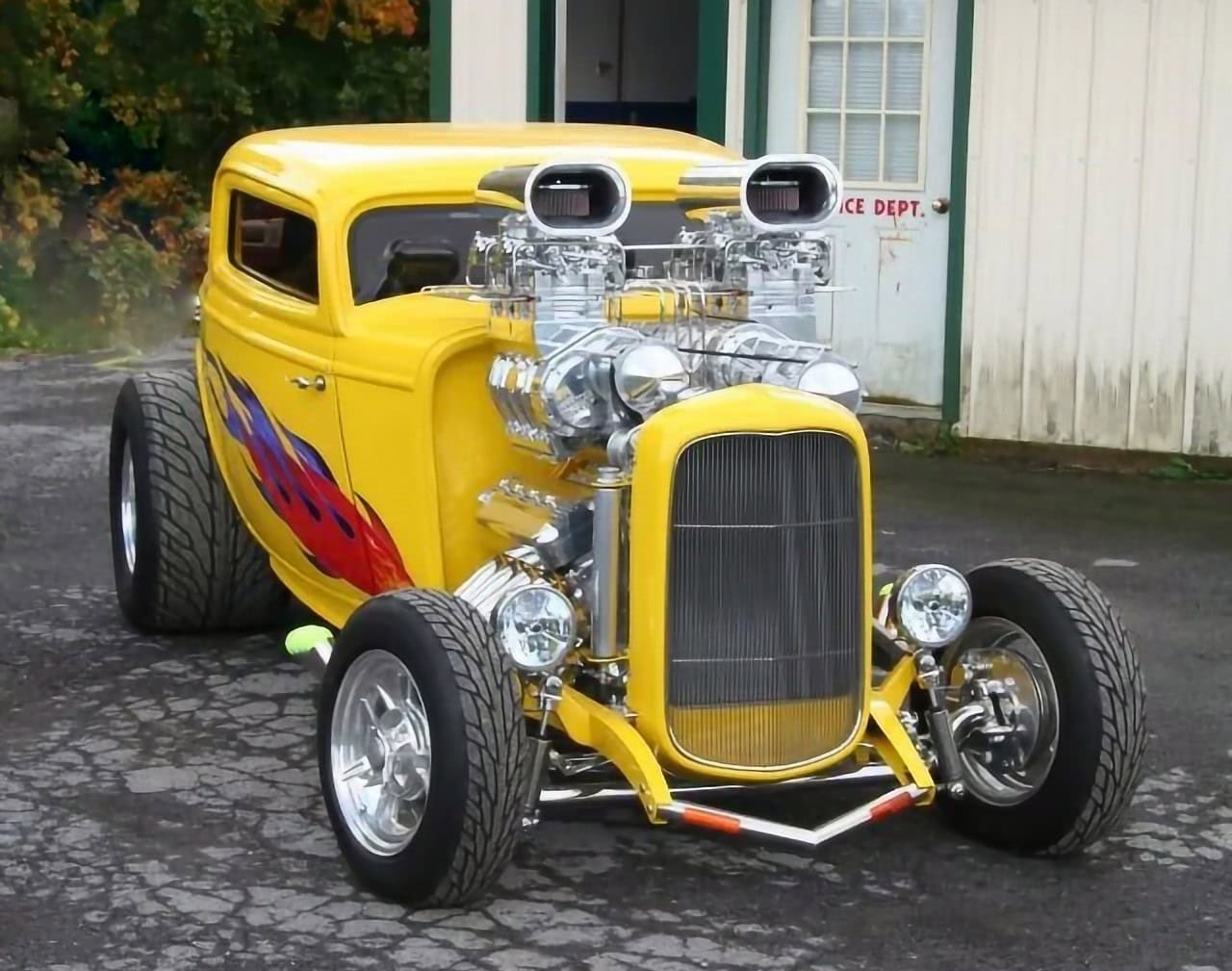 Les deux Blowers 671 sont surmontés d’un quatuor de carburateurs Demon chromés. Les en-têtes de style zoom sont en acier inoxydable et recouverts d’un revêtement Jet-Hot à l’intérieur. La plomberie, y compris le boîtier du câblage, est entièrement en acier inoxydable poli. Un radiateur Be Cool personnalisé, spécialement conçu pour ce projet, permet de contrôler la température du moteur. Une boîte de vitesses Turbo 400 polie envoie toute cette puissance à un quick-change de 9 pouces. De plus, Powerhouse a retravaillé la suspension et l’ensemble de la suspension avant et arrière ainsi que réalisé les panneaux en acier inoxydable poli avec des amortisseurs personnalisés à chaque coin. La carrosserie a été pulvérisée d’une peinture jaune avec des flammes réalisées à l’aérographe. Le résultat est un Hot Rod Coupe pas comme les autres qui se démarque facilement dans les rangées des ’32 lors des spectacles…