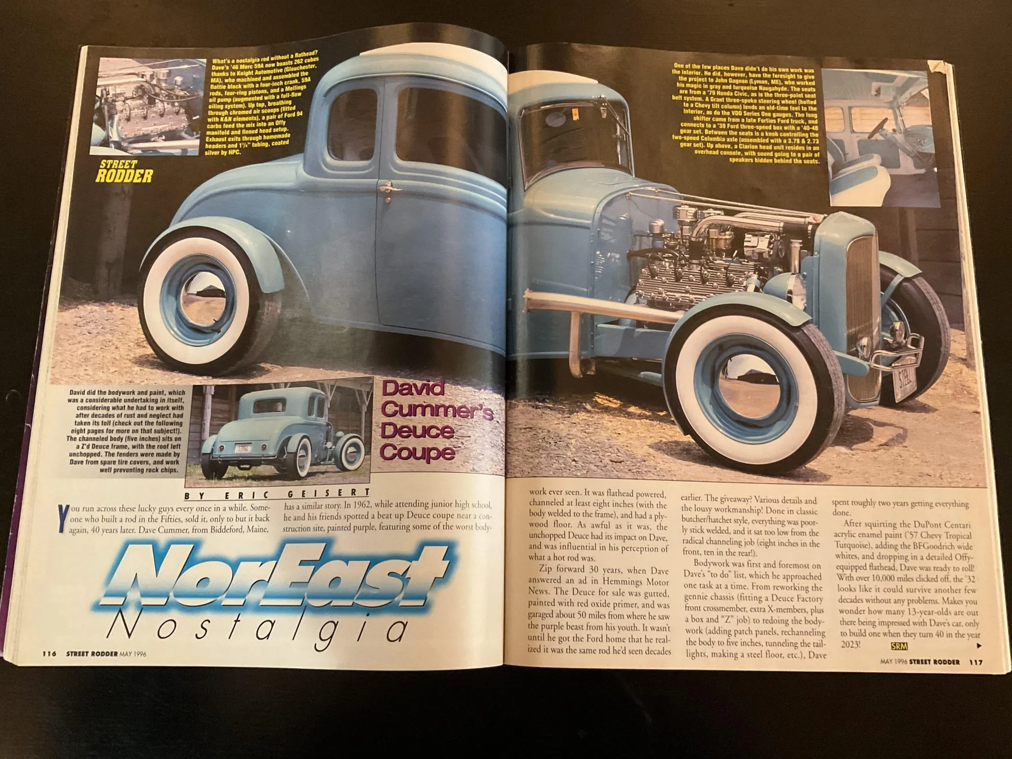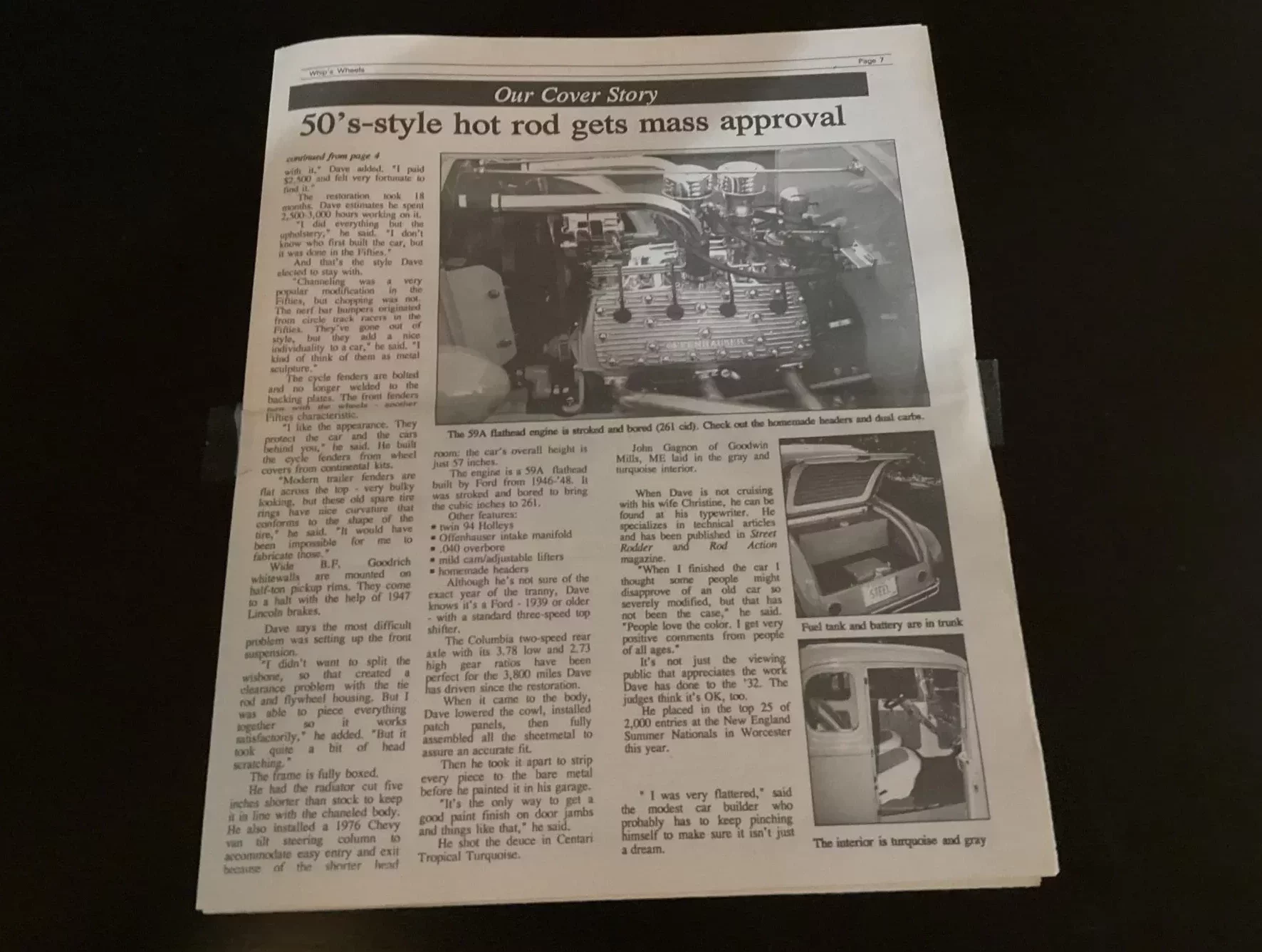 Ce serait même “chiant” de s’y apesantir… De même que de scribouiller qu’il a été publié (mis à l’honneur) dans plusieurs magazines (américains) de Hot Rods des débuts (logique que ce ne soit pas dans “Vogue” ou dans “Le Chasseur Français”, voire dans “Le Figaro Littéraire”)... et est resté tel quel jusqu’en 1990, année ou il a été restauré exactement à l’identique de 1949 par Dave Cummer de Biddeford, dans le Maine, USA, un mec qui vous est aussi inconnu qu’à moi et dont vous n’avez strictement rien à foutre… Waouwwww ! Vous avez senti l’instant du basculement ? Mais oui, le moment ou… Craaaac !… Vous viviez un début d’orgasme émotionnel… Et PAF !… Je vous indique les quasi-coordonnées d’un mec dont vous n’avez rien à foutre… Strictement rien…