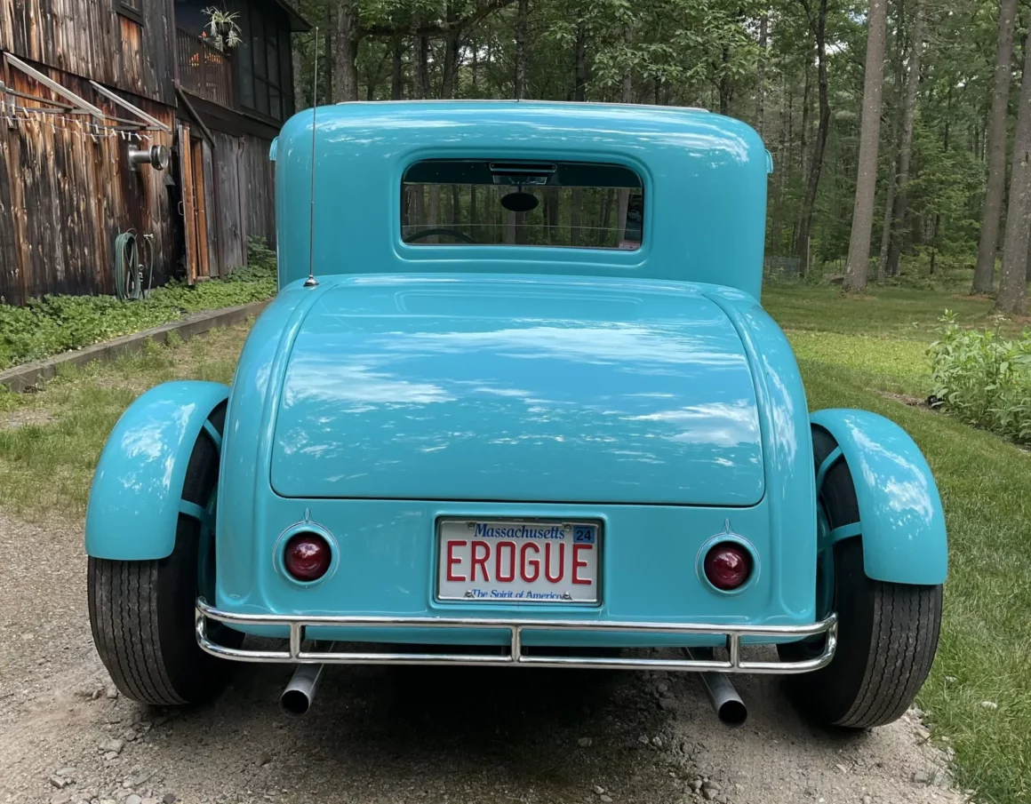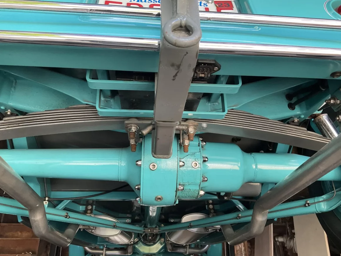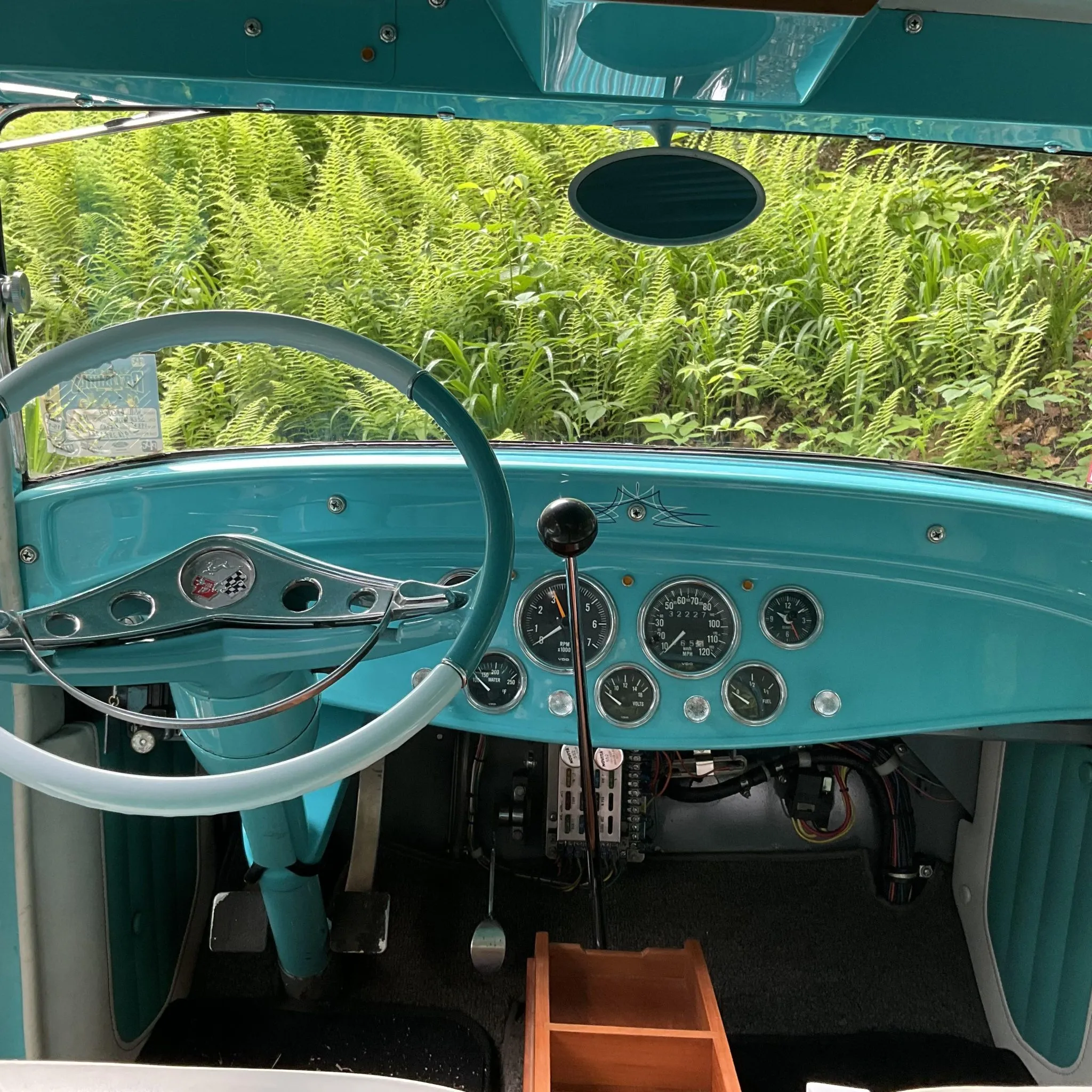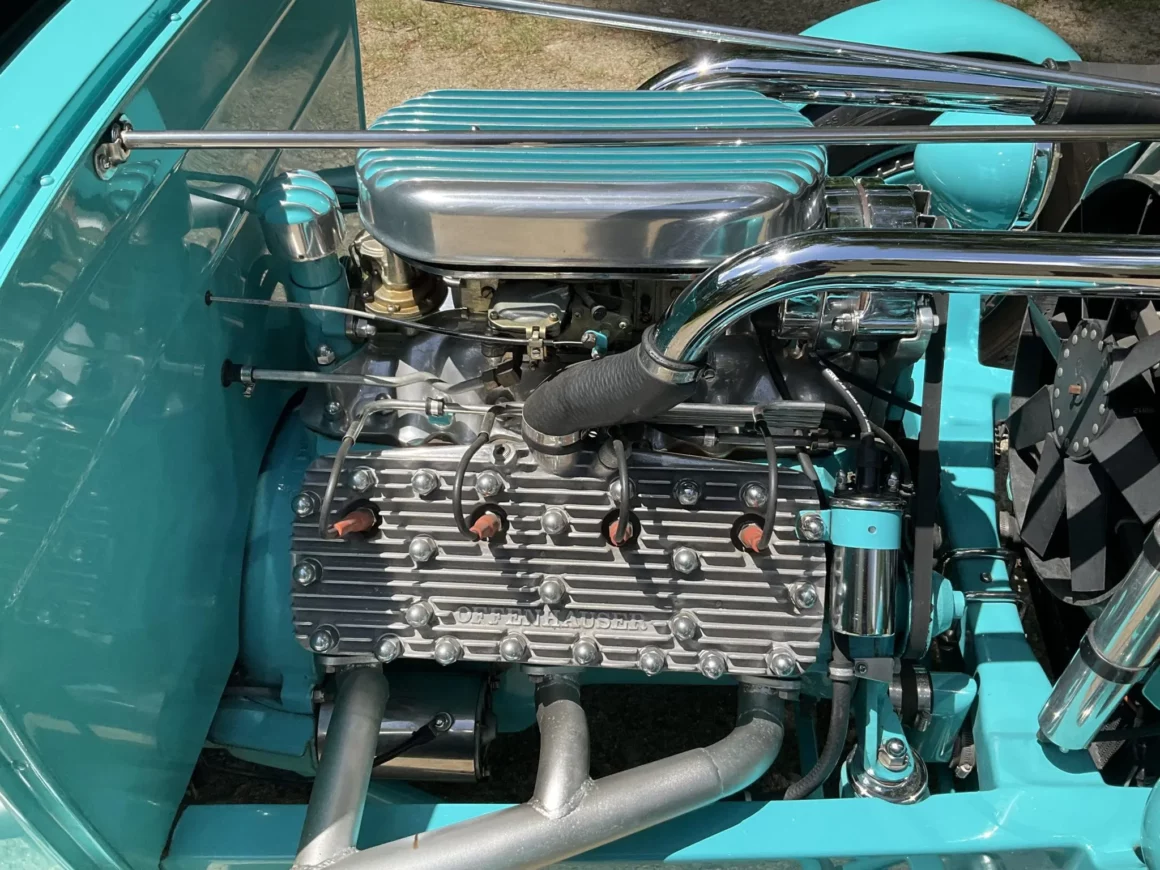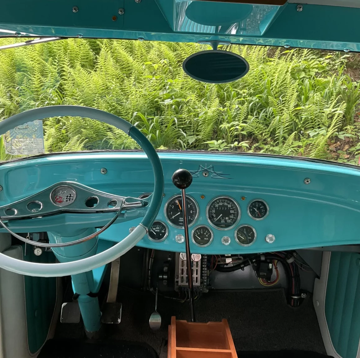 Donc, le moteur de ce Hot Rod équipé de culasses “Offenhauser”, est soutenu par une transmission manuelle à trois vitesses. Les autres points marquants et forts supplémentaires de la construction, comprennent un essieu avant abaissé, un boîtier de direction Vega, des freins à tambour Lincoln, des ailes type motos, des barres nerf chromées et un pont quick change Columbia. L’intérieur est garni d’une sellerie turquoise et grise avec sièges baquets, la console centrale est en bois d’arbre, et le volant vient d’une Impala. L’instrumentation est VDO, les ceintures de sécurité sont à trois points et les Nerf-bars chromées ont été fabriquées “maison” en même temps que d’autres détails extérieurs qui incluent un revêtement de toit en vinyle gris…