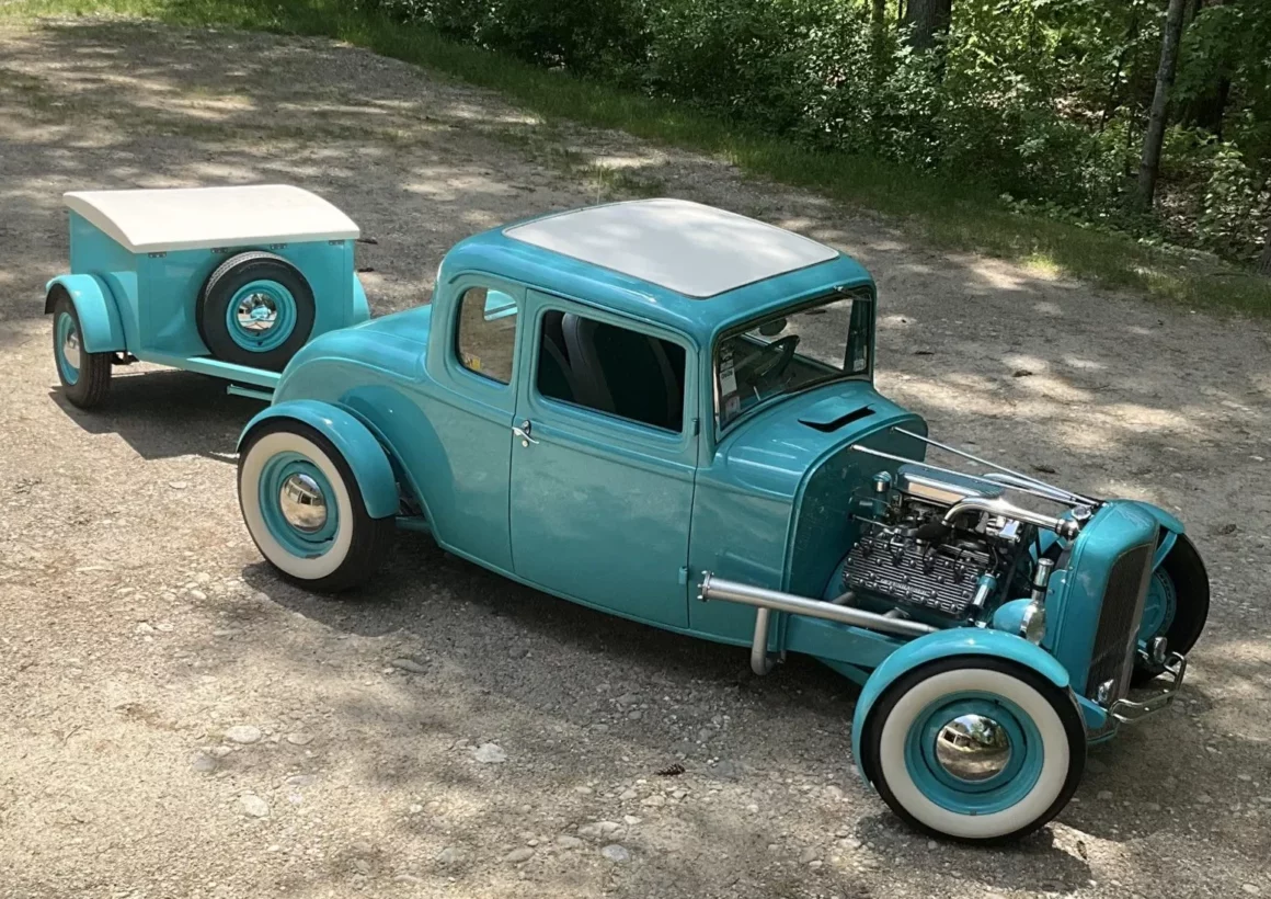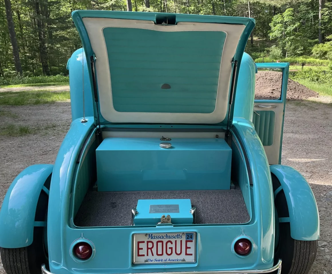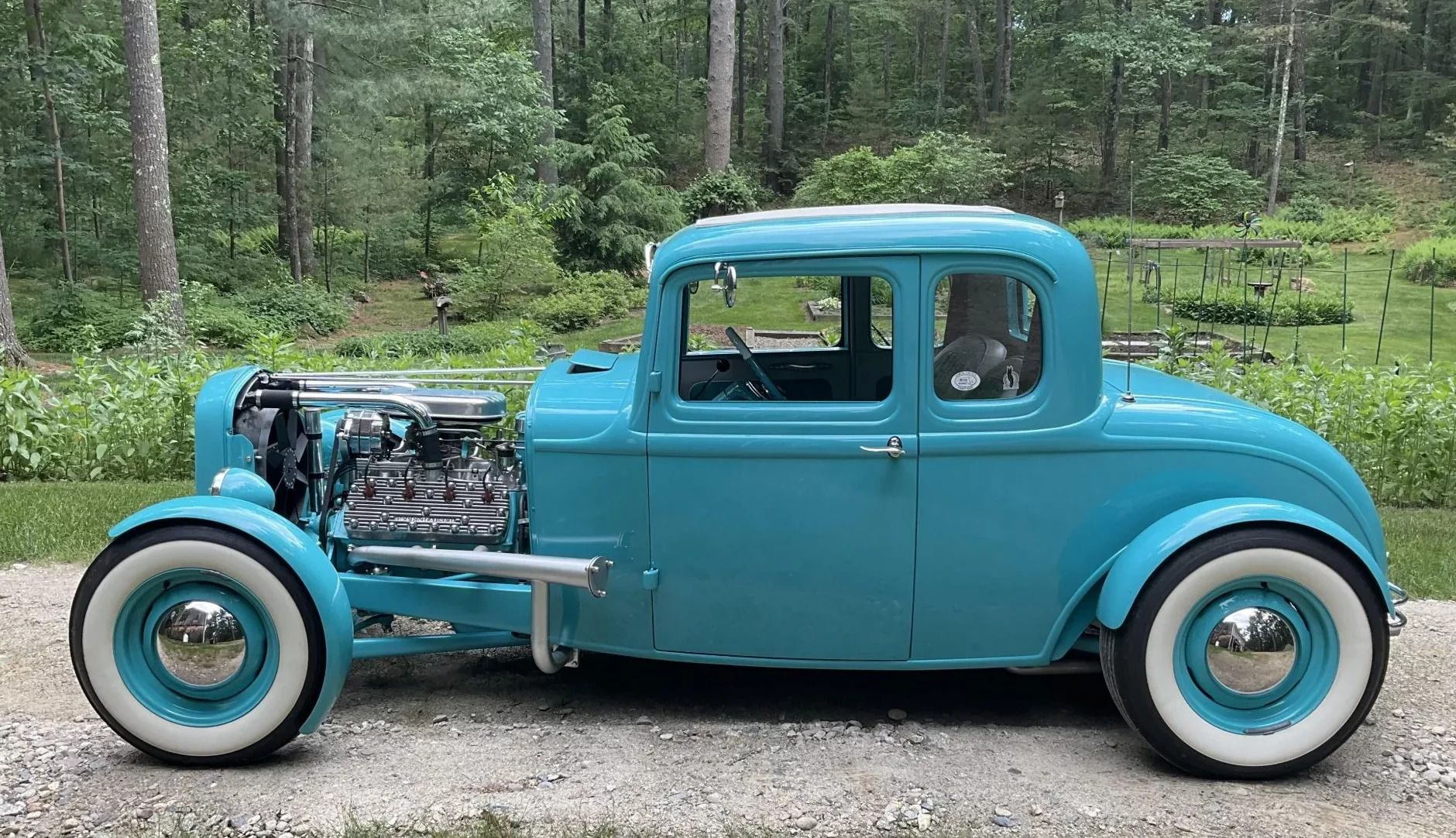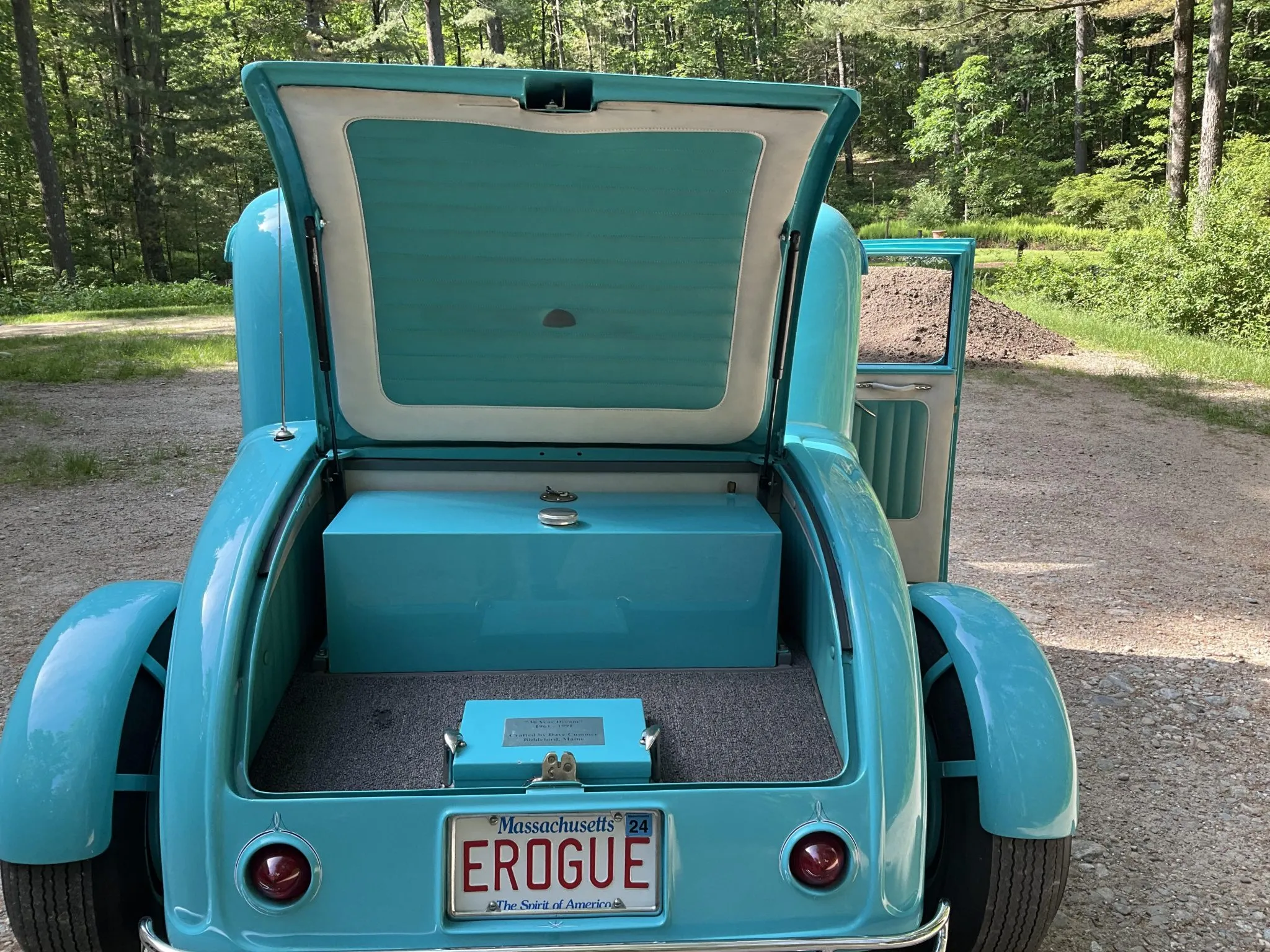 Donc, le moteur de ce Hot Rod équipé de culasses “Offenhauser”, est soutenu par une transmission manuelle à trois vitesses. Les autres points marquants et forts supplémentaires de la construction, comprennent un essieu avant abaissé, un boîtier de direction Vega, des freins à tambour Lincoln, des ailes type motos, des barres nerf chromées et un pont quick change Columbia. L’intérieur est garni d’une sellerie turquoise et grise avec sièges baquets, la console centrale est en bois d’arbre, et le volant vient d’une Impala. L’instrumentation est VDO, les ceintures de sécurité sont à trois points et les Nerf-bars chromées ont été fabriquées “maison” en même temps que d’autres détails extérieurs qui incluent un revêtement de toit en vinyle gris…