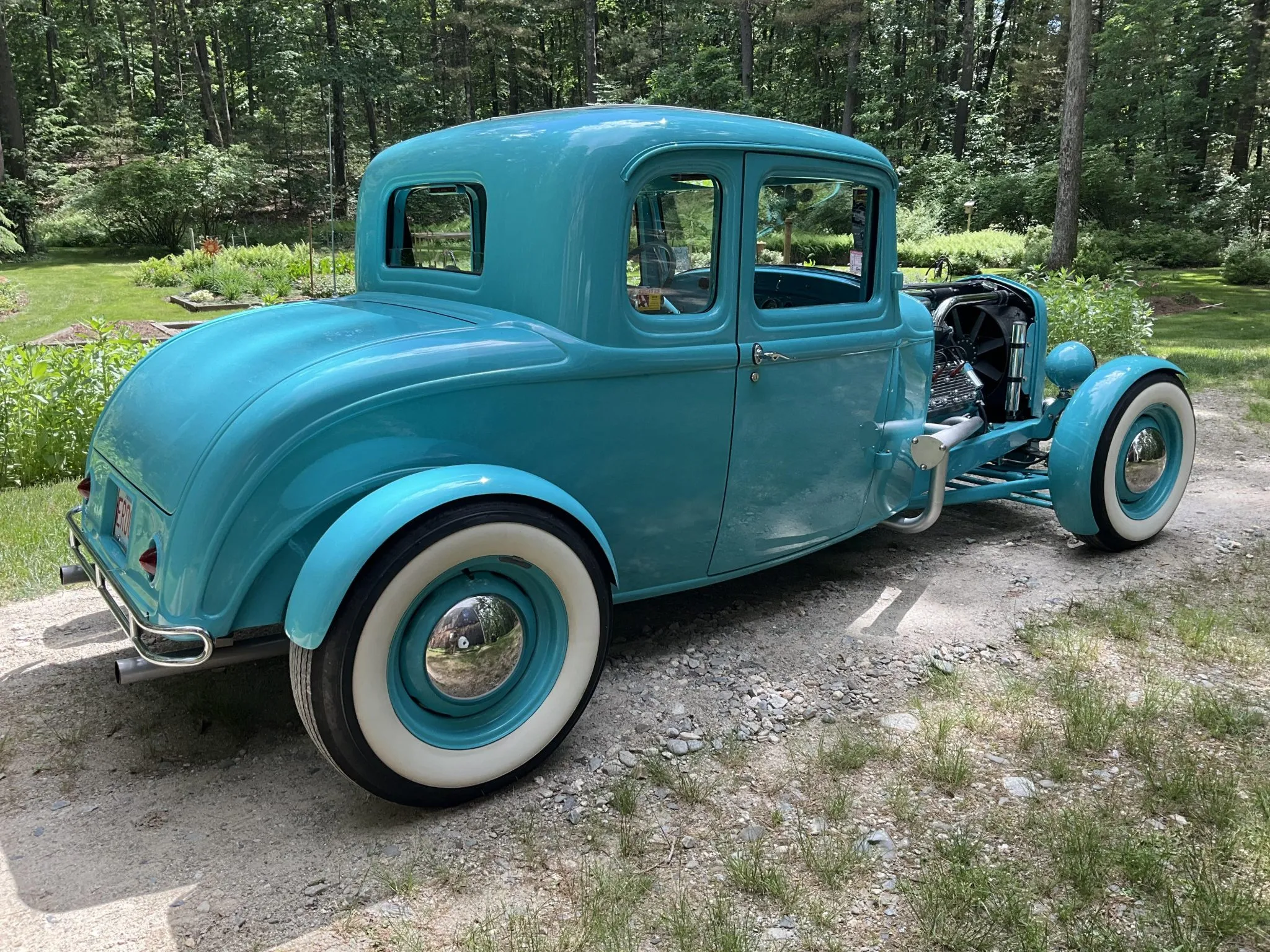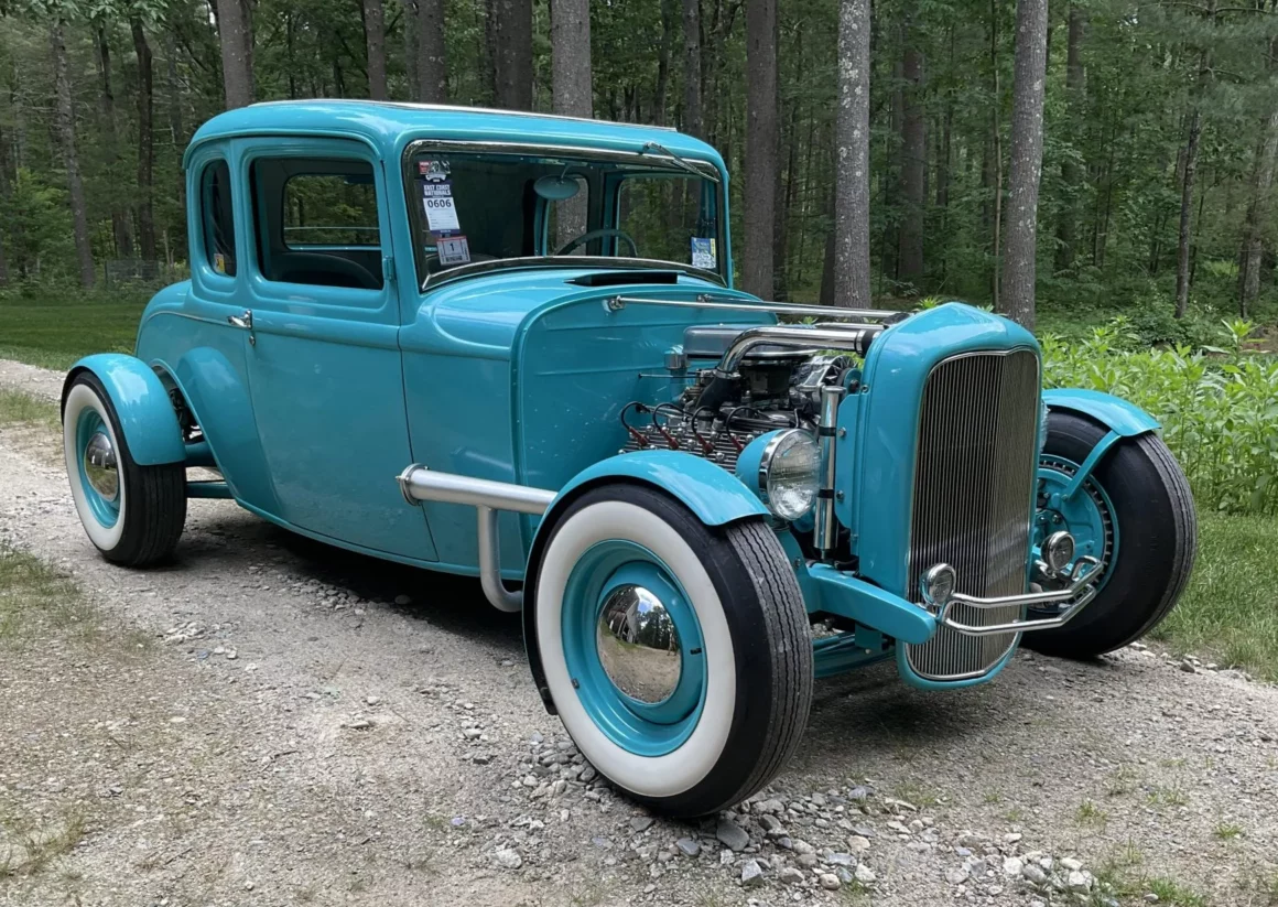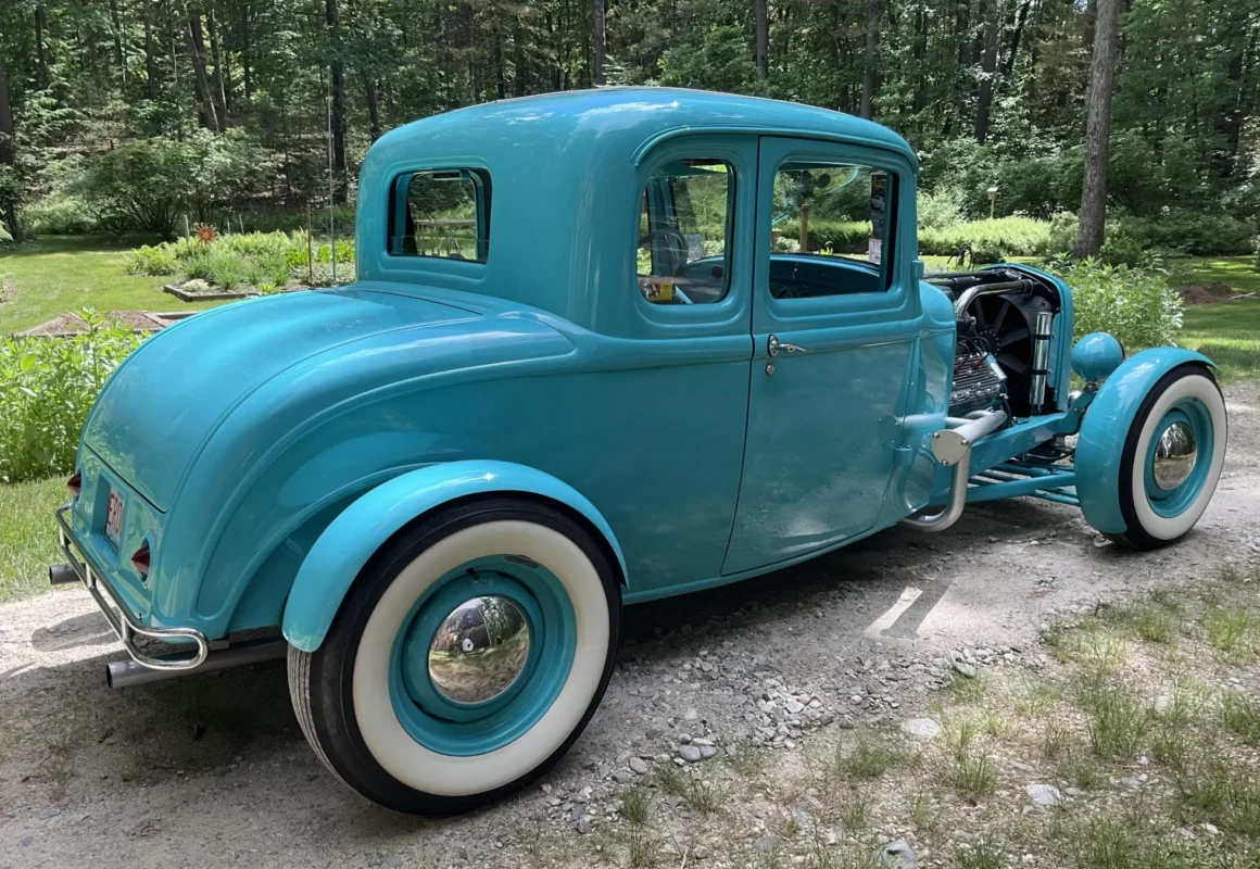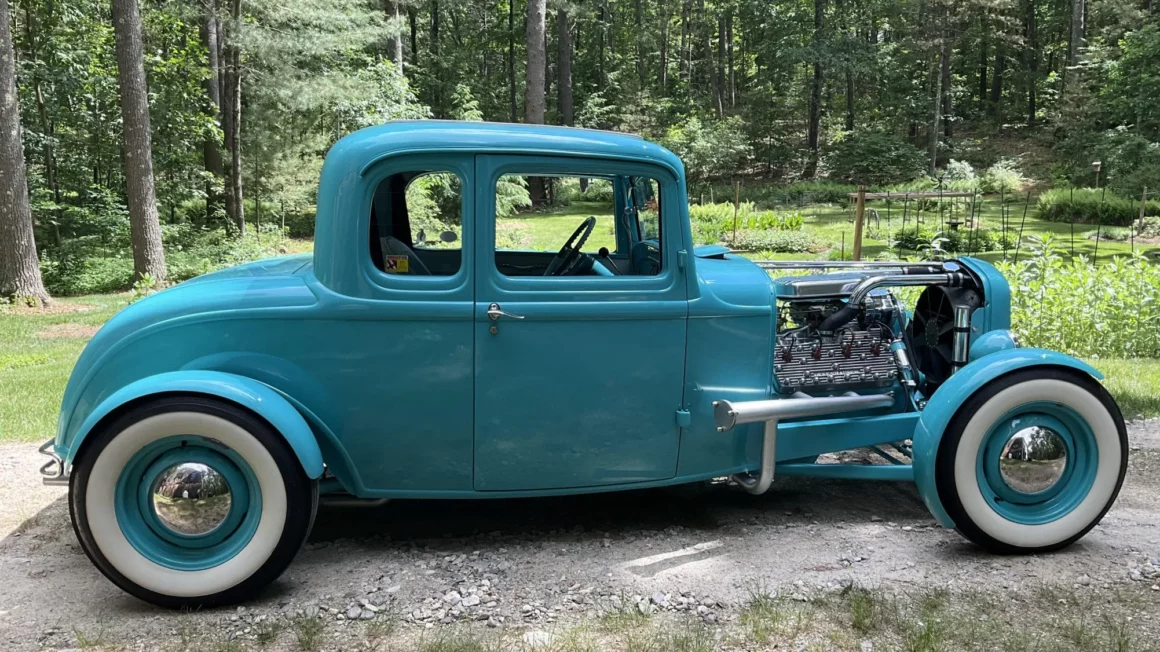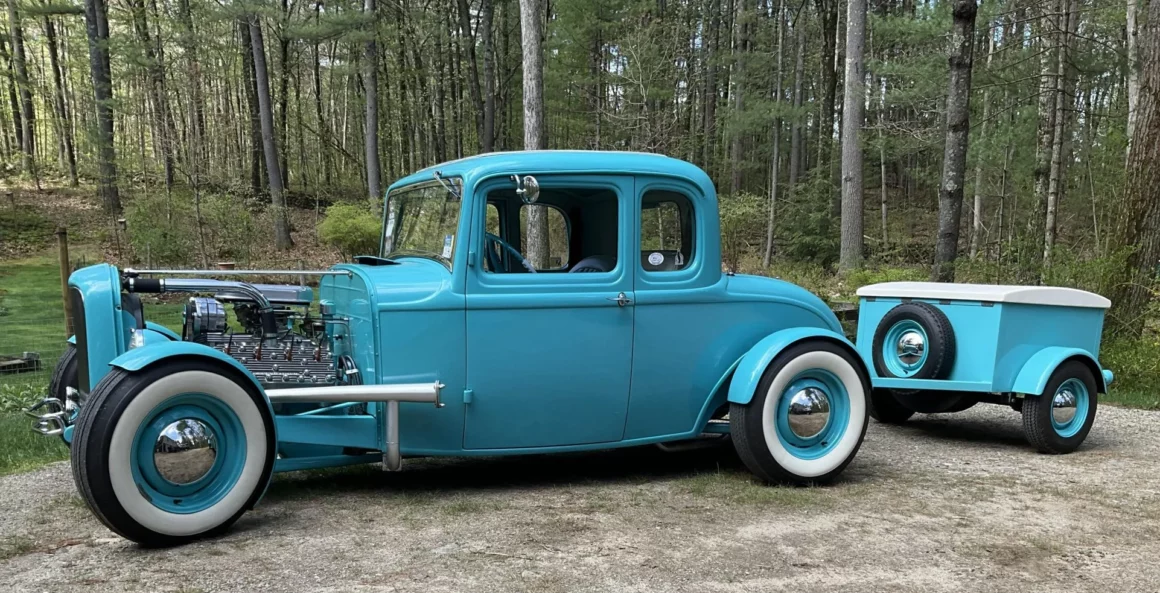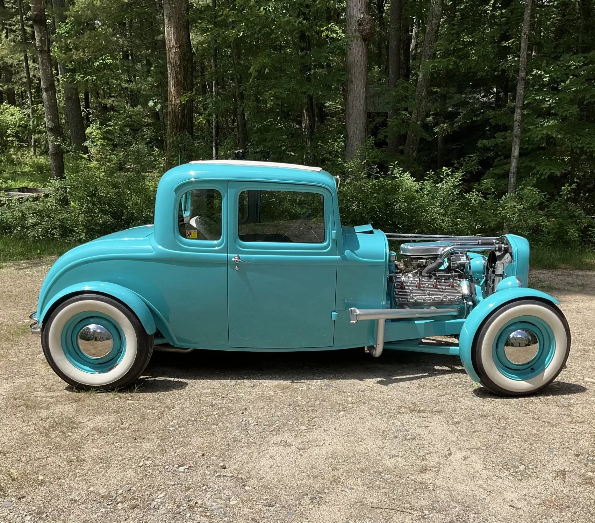 Donc, le moteur de ce Hot Rod équipé de culasses “Offenhauser”, est soutenu par une transmission manuelle à trois vitesses. Les autres points marquants et forts supplémentaires de la construction, comprennent un essieu avant abaissé, un boîtier de direction Vega, des freins à tambour Lincoln, des ailes type motos, des barres nerf chromées et un pont quick change Columbia. L’intérieur est garni d’une sellerie turquoise et grise avec sièges baquets, la console centrale est en bois d’arbre, et le volant vient d’une Impala. L’instrumentation est VDO, les ceintures de sécurité sont à trois points et les Nerf-bars chromées ont été fabriquées “maison” en même temps que d’autres détails extérieurs qui incluent un revêtement de toit en vinyle gris…