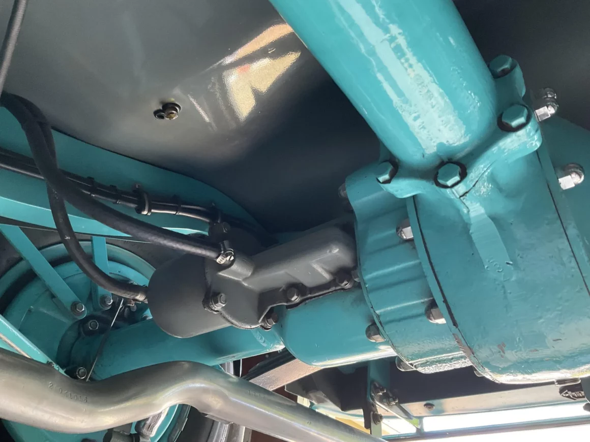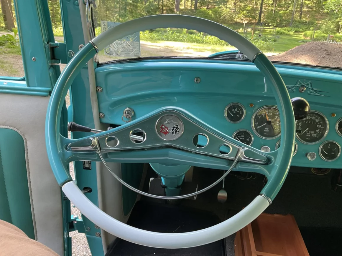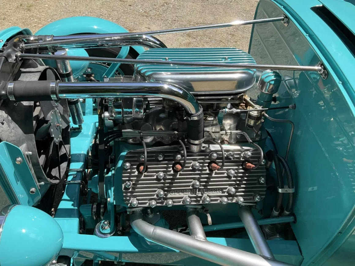 Le tableau de bord est couleur carrosserie et les équipements supplémentaires comprennent une console centrale en bois d’arbre (déjà dit) et un plateau de tablette, des tapis gris, des ceintures de sécurité à trois points et un panneau de fusibles Ron Francis WireWorks… Une unité principale Pioneer a été installée dans la console mais compte tenu du bruit général, elle n’est plus connectée aux haut-parleurs montés derrière les sièges. Le V8 flathead 59A provient d’une Mercury de 1946 et déplace 262ci. Comme déjà écrit il comporte des culasses et un collecteur d’admission Offenhauser (qui n’est pas un chef d’orchestre ni un compositeur comme Wagner) et un carburateur Holley à quatre corps .