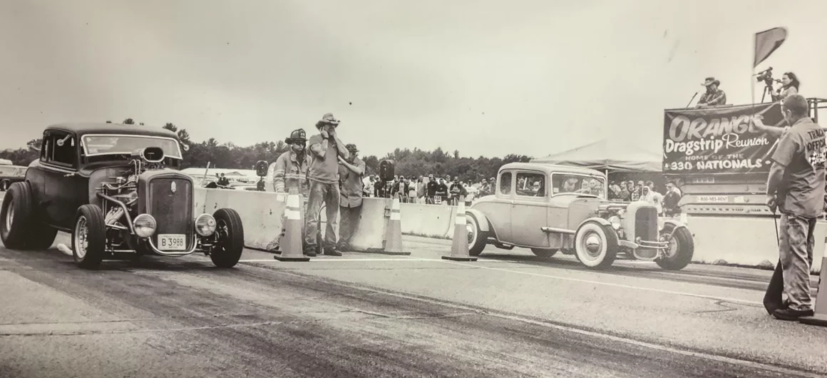 Quelques bosses et la peinture écaillée au bas du contour de la calandre peuvent être vues sur diverses des photos, ce qui atteste que le Hot Rod n’a pas fait que de la figuration mais a été utilisé… Les jantes en acier de 15po de la même couleur que la carrosserie, portent des enjoliveurs “Baby Moon” et sont chaussées de pneus à flancs blancs BFGoodrich… La suspension comprend des triangles et des ressorts à lames transversaux à l’avant et à l’arrière, l’essieu avant abaissé est un Magnum, le boîtier de direction est un Vega, la barre Panhard et les amortisseurs sont des Pete & Jakes. Le freinage est plus ou moins bien assuré par un maître-cylindre Tilton et un pédalier adéquat reliés à des tambours Lincoln tout autour…