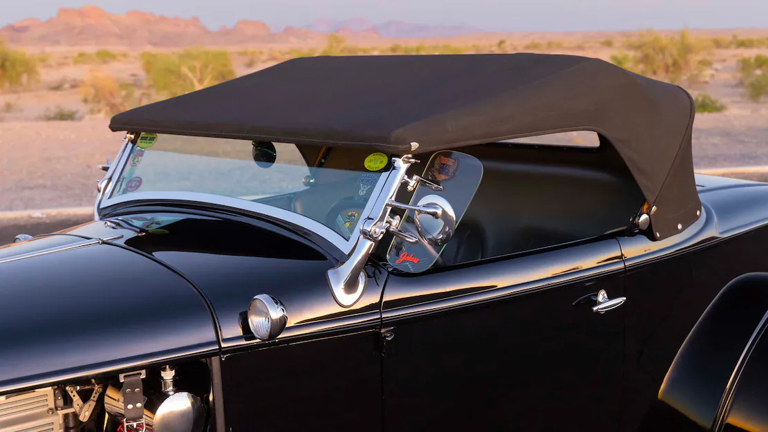 Les poteaux n’ont été coupés que d’environ 2 pouces, mais la côtelette semble plus sévère en raison du râteau… C’était un peu unique quand cela a été fait au début des années’90 que je lui ai dit. Il a répondu du tac au tac : “Mais cela a probablement été copié depuis. Vous pouvez aussi les repouser vers l’avant, mais cela n’a pas l’air correct, Mon choix est le bon”… Tim Case, un tapissier près de l’usine de Dick en Arizona, a refait la capote en suivant son design personnalisé.