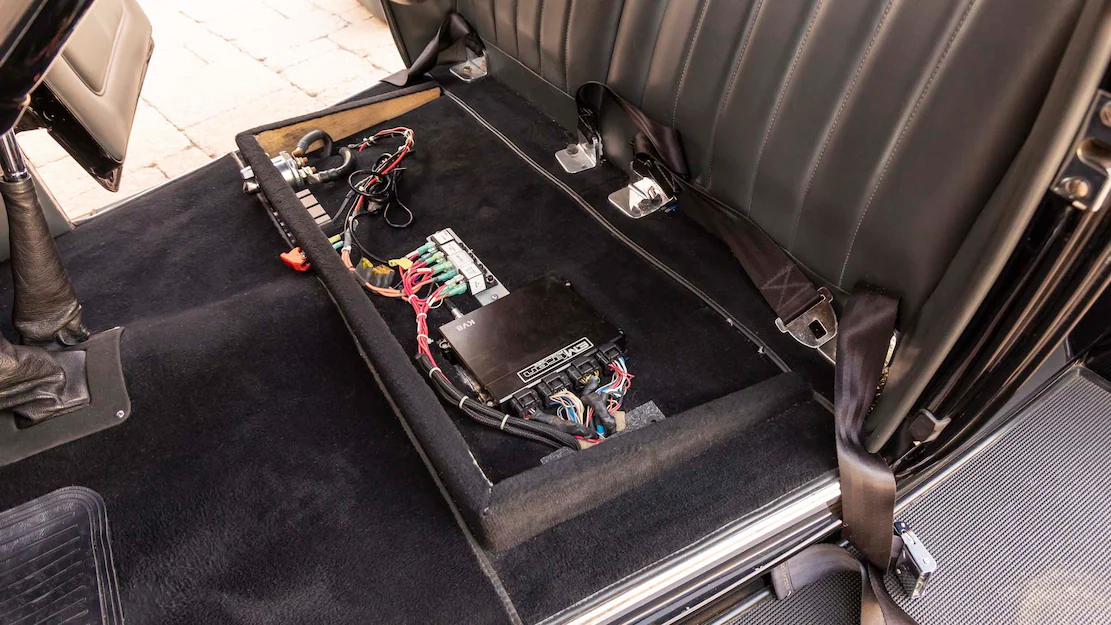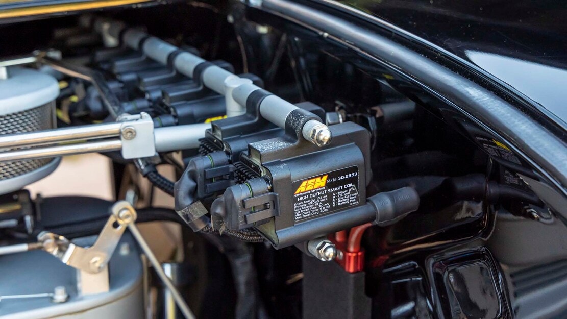 Dick a également conçu un nouveau système d’allumage (qui utilise un ECU Emtron caché sous le siège). Là où se trouvait le distributeur, c’est maintenant un appareil qui compte les tours d’arbre à cames. Il y a des packs de bobines individuels pour chaque cylindre et des capteurs de cognement montés dans les culasses Wilson & Woods, visibles juste au-dessus des emblèmes V8 personnalisés.