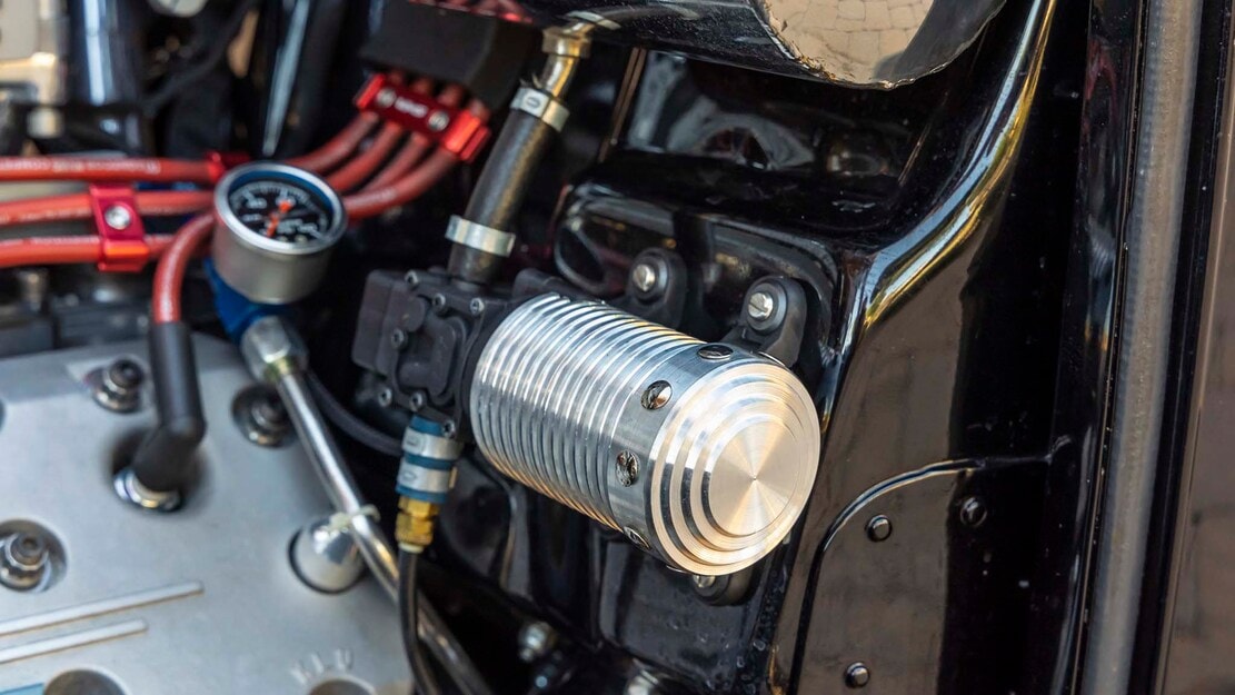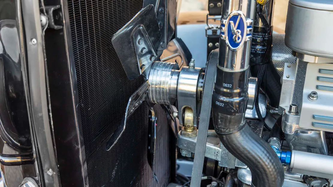 Cela fonctionne et devait fonctionner parce que je vis dans l’une des régions les plus chaudes d’Amérique, et ce moteur tourne à 180 degrés, peu importe ce qui se passe ici”… Au cas où il rencontrerait des problèmes de surchauffe, Dick a installé un réservoir en acier inoxydable sur le pare-feu, rempli d’eau désionisée qu’il peut pomper à travers les brumisateurs devant la calandre Alumicraft Winterfront : “Je n’ai jamais eu à l’utiliser, mais je l’ai là, juste au cas où”…