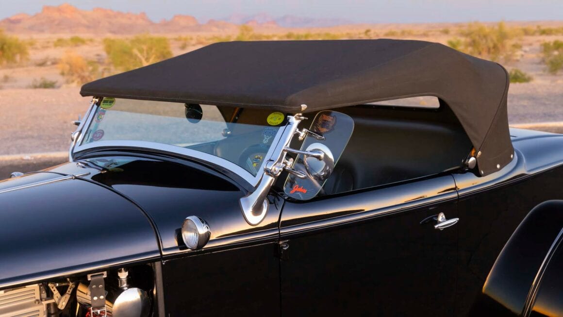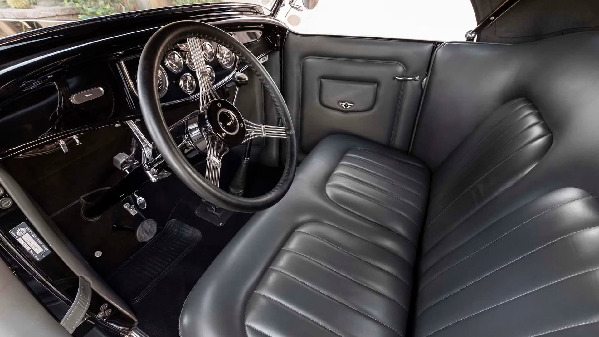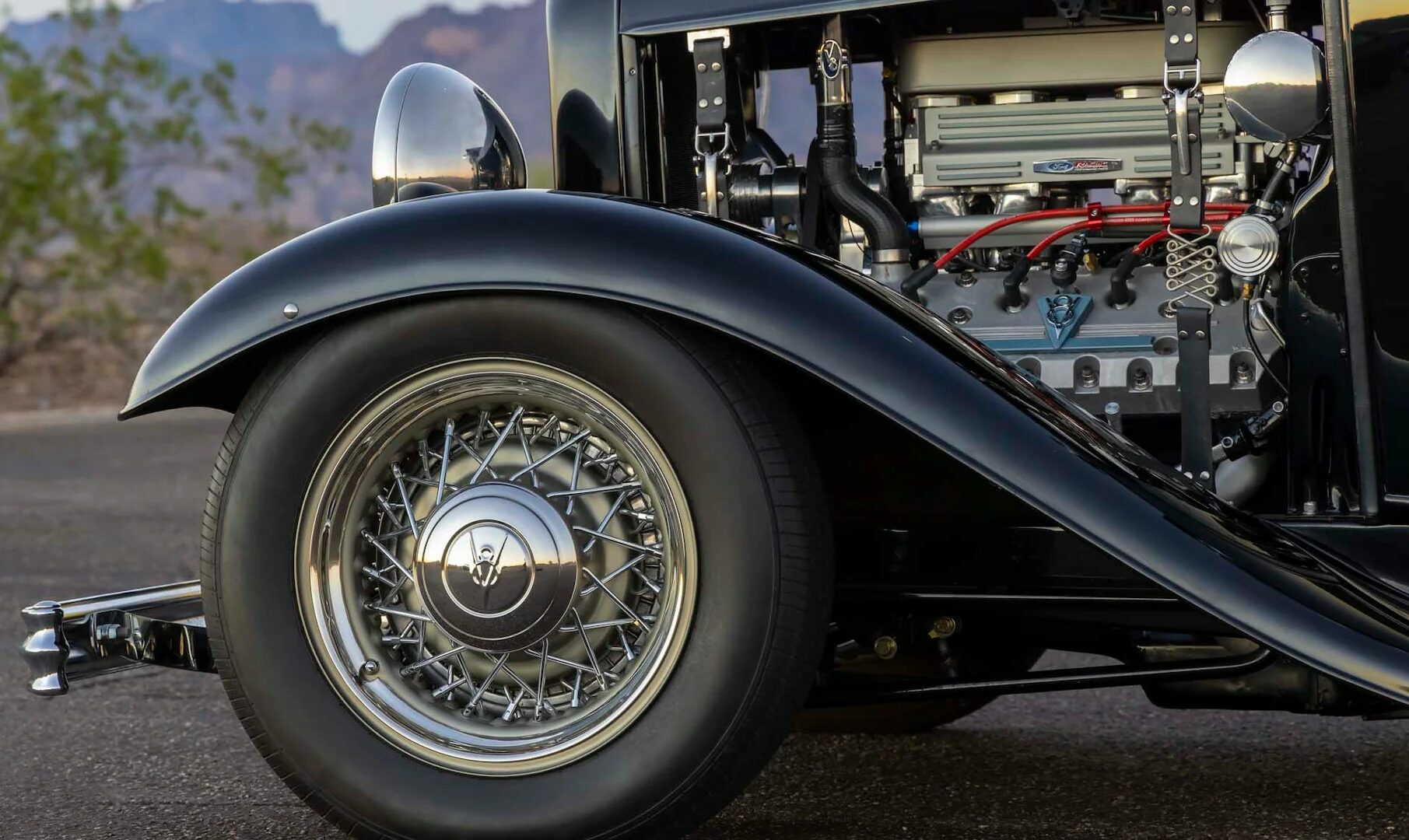 Le châssis à la façon de 1932 est équipé d’un essieu abaissé de 4 pouces et d’un pont quick Change arrière Columbia à deux rapports. Les jantes à rayons Wheelsmith de 15 pouces qu’il a mises dessus lui donnent en quelque sorte un look de retour aux années “50. Ce qui distingue cette Deuce des autres Hot rods construit dans les années 1990, c’est l’inclinaison vers l’arrière assez raide et décontractée du pare-brise qui est également coupé pour obtenir le look surbaissé des Coupés Top-Choppés. Le fameux “Clapot” qui surnomme cette caractéristique apporte un look et un air plus sévère en raison du fameux “râteau” qui est l’appellation de la forme du toit (ici la capote) personnalisé d’un surbaissement : “C’était un peu unique au début des années ’90, mais cela a été copié depuis. Vous pouvez aussi les reculer plus, mais cela gâche le style qui n’a plus l’air correct, mais celui-ci a la bonne coupe... Tim Case, un tapissier d’ameublement près de la base militaire de Dick en Arizona, a refait le dessus en suivant un design personnalisé qui semble être l’original. Il a également tapissé l’intérieur en cuir”...