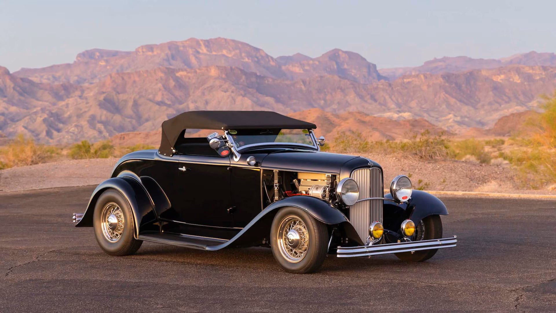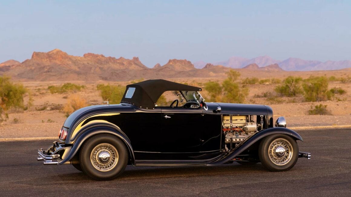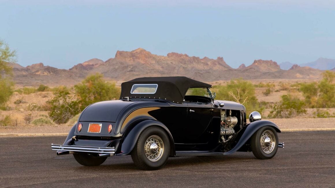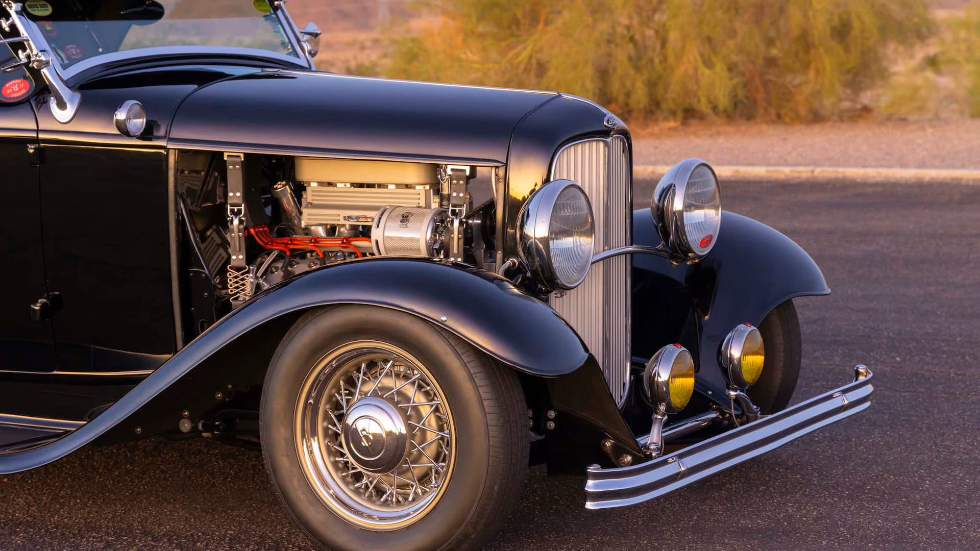 Le châssis à la façon de 1932 est équipé d’un essieu abaissé de 4 pouces et d’un pont quick Change arrière Columbia à deux rapports. Les jantes à rayons Wheelsmith de 15 pouces qu’il a mises dessus lui donnent en quelque sorte un look de retour aux années “50. Ce qui distingue cette Deuce des autres Hot rods construit dans les années 1990, c’est l’inclinaison vers l’arrière assez raide et décontractée du pare-brise qui est également coupé pour obtenir le look surbaissé des Coupés Top-Choppés. Le fameux “Clapot” qui surnomme cette caractéristique apporte un look et un air plus sévère en raison du fameux “râteau” qui est l’appellation de la forme du toit (ici la capote) personnalisé d’un surbaissement : “C’était un peu unique au début des années ’90, mais cela a été copié depuis. Vous pouvez aussi les reculer plus, mais cela gâche le style qui n’a plus l’air correct, mais celui-ci a la bonne coupe... Tim Case, un tapissier d’ameublement près de la base militaire de Dick en Arizona, a refait le dessus en suivant un design personnalisé qui semble être l’original. Il a également tapissé l’intérieur en cuir”...