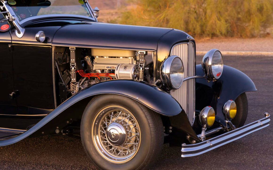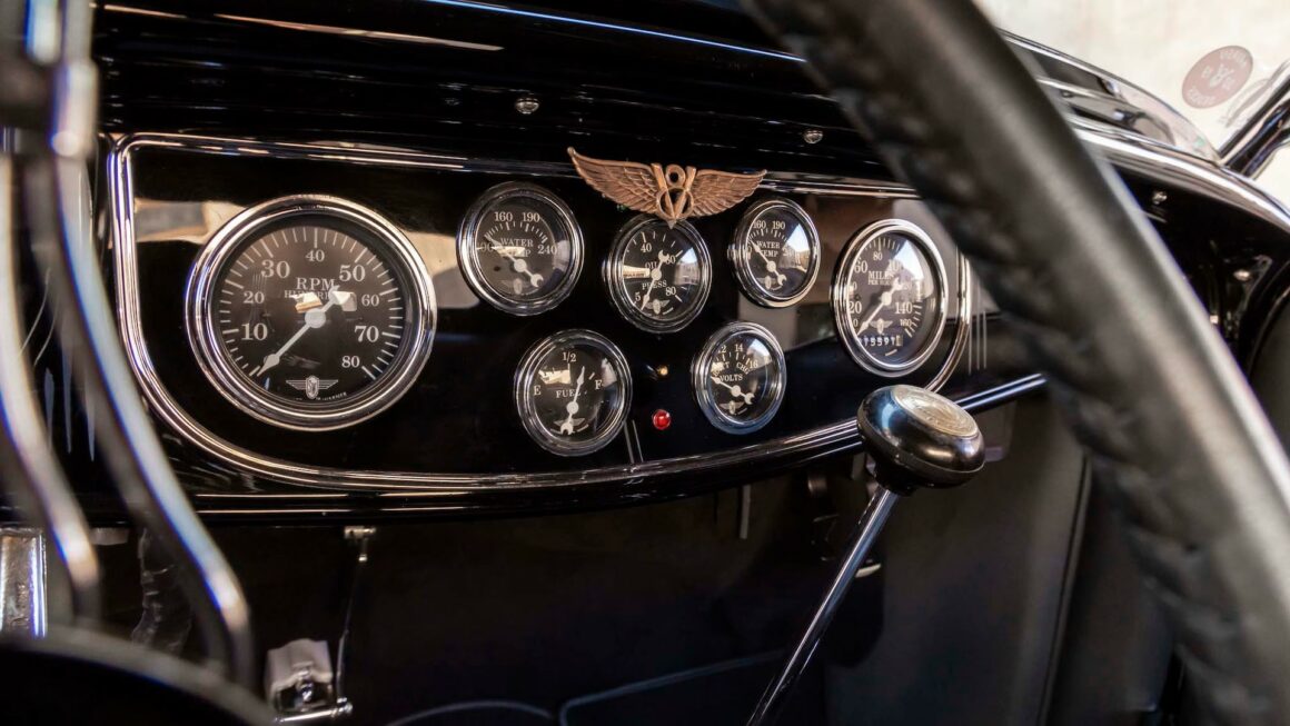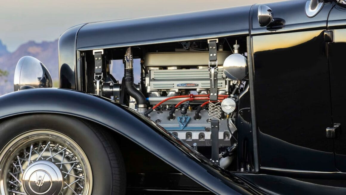 Le cockpit traditionnel a des compteurs Stewart-Warner Wings dans le tableau de bord, et Dick a utilisé/transformé une bielle pour fabriquer “la chute” de la colonne de direction. Dick qui conduit toutes ses Ford’32 originales, fait de même avec ce Hot Rod. Mais il n’avait pas parcouru 100 miles au compteur lorsque le moteur a explosé, c’est donc à ce moment-là qu’il a commencé toutes sortes de modifications. Plutôt que de retravailler/reconstruire le moteur explosé, Dick est reparti à zéro avec un tout nouveau bloc Flathead dit “Français”. (Les Français de France ont reçu la licence/autorisation de Ford (moyennant royalties conséquentes) pour la fabrication de V8 Ford Flathead pour une utilisation dans les camions militaires. Ils sont une sorte d’amalgame, avec des caractéristiques et des composants similaires à ceux des Ford 8BA et 59A)… “Je l’ai fait déstresser et grenaillé avant de faire les transformations. C’est un moteur de 3/8 x 1/2 pouce, un suralésage de 3/8 de pouce et un embiellage de course Scat de 1/2 pouce se combinant pour former un 304ci”.