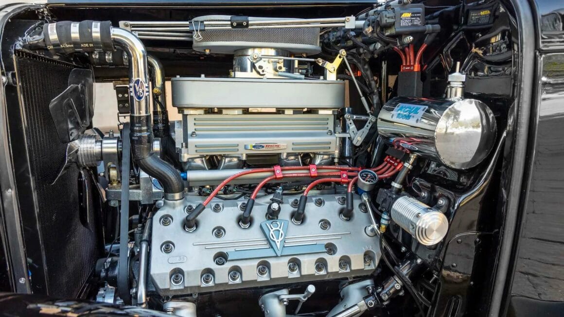 “Oui, parfois ils commencent à exploser un peu. Le capteur de cliquetis le détecte et, tout comme sur les voitures neuves, retire l’étincelle de ce cylindre jusqu’à ce qu’il puisse le remettre en place pour qu’il fonctionne à pleine pression”... Dick est fier du fait qu’au cours des plus de 10 années où le moteur a été ensemble, il n’a pas vécu de casse… “Lorsque j’ai perfectionné les cylindres, j’ai fabriqué de fausses culasses et je les ai serrées, de sorte que le couple était tout là, tout comme on le fait avec des moteurs de course”... Pour résoudre les problèmes notoires de surchauffe du flathead, exacerbés par l’environnement désertique, il a recouvert les dessus des pistons et les chambres de combustion d’un matériau réfléchissant la chaleur… “Je pense que ça marche parce que je vis dans l’une des régions les plus chaudes du pays, et ce moteur tourne à 180 degrés, peu importe ce qui se passe ici”... Au cas où il rencontrerait des problèmes de surchauffe, Dick a installé un réservoir en acier inoxydable sur le pare-feu, rempli d’eau déminéralisée qu’il peut pomper à travers des brumisateurs devant la calandre Alumicraft Winterfront…