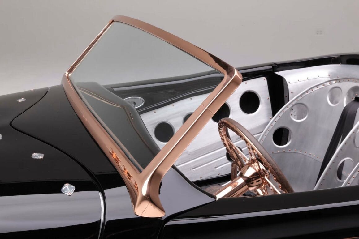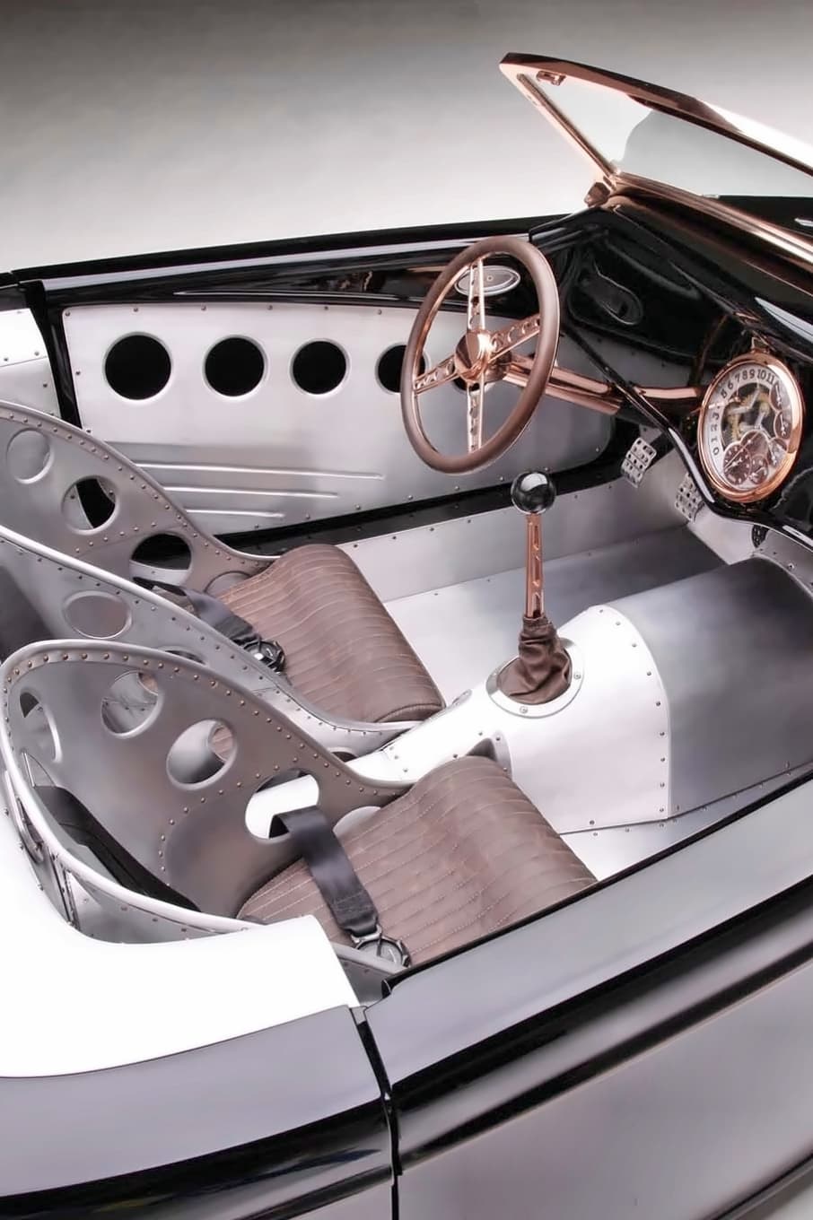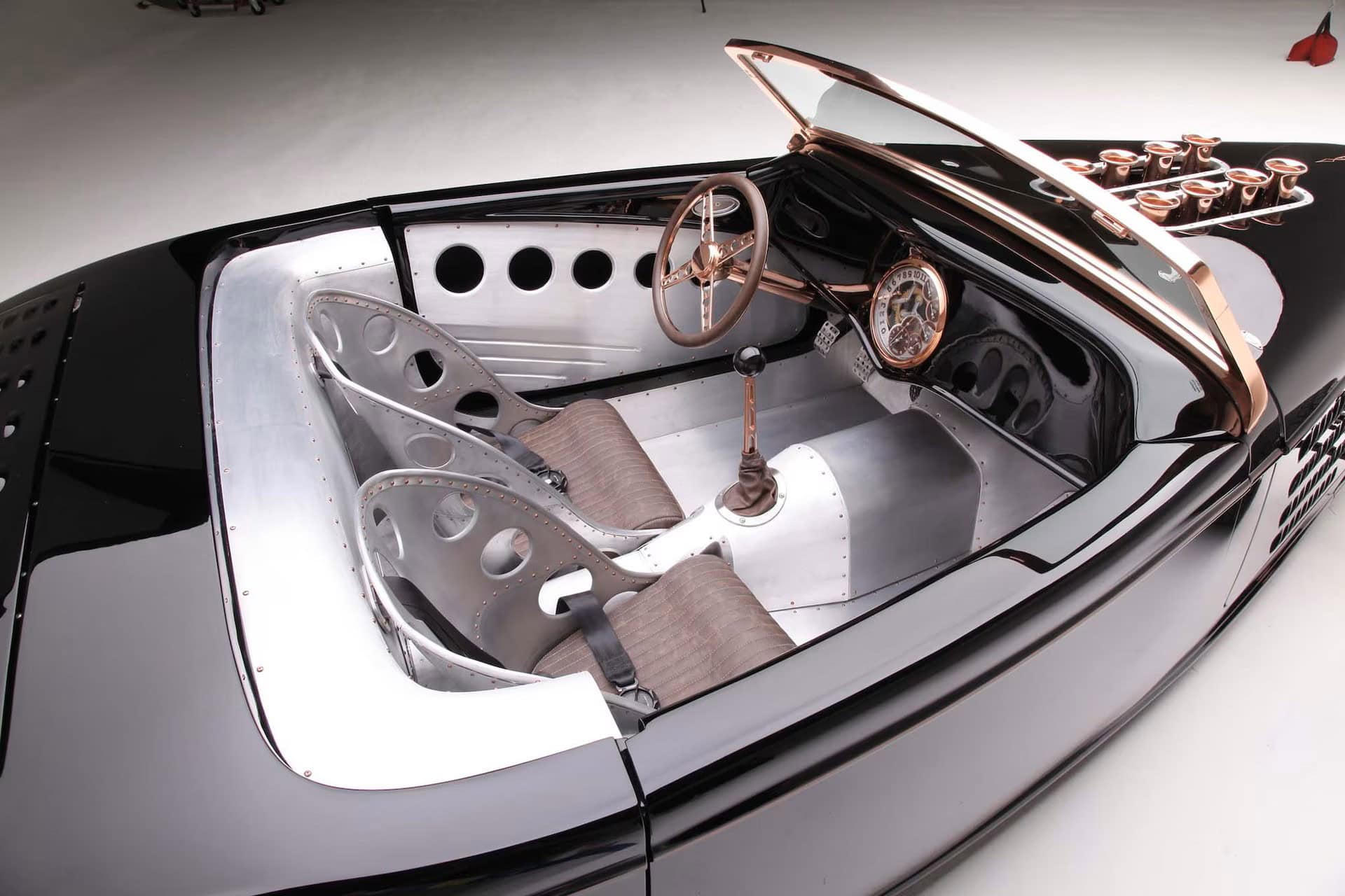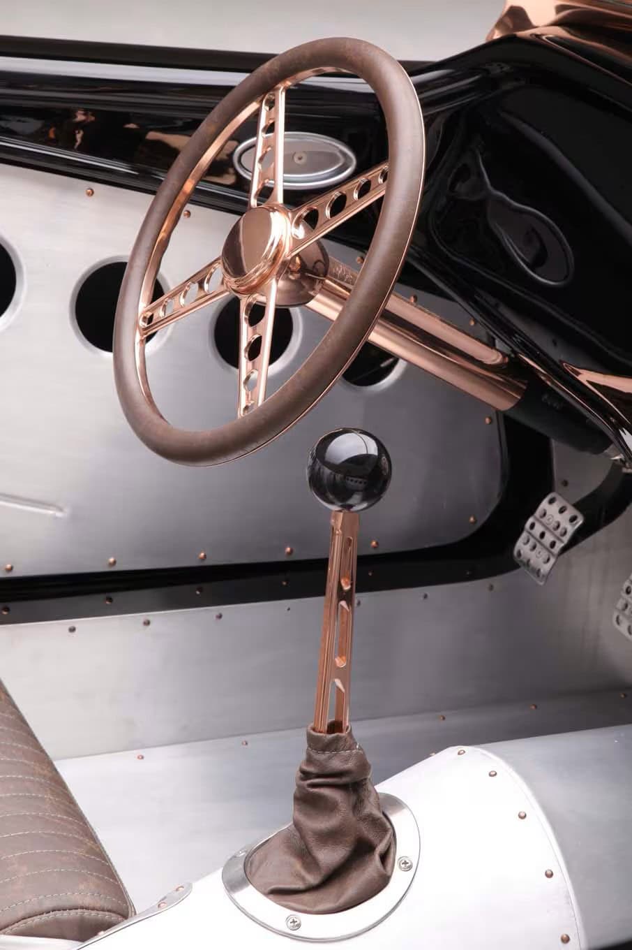 Steve Martinez a suivi avec les décos, qui incorporent des parties disposées sur le capot et le couvercle du coffre. Parmi les éléments qui séparent cette création de la plupart des autres, il y a l’utilisation d’un placage de cuivre au lieu de chrome. “Ogden Chrome” a fait “tout le Job”, y compris les baquets de phares, les enjoliveurs pour les feux arrière “FFR”, le cadre du pare-brise, les jantes, les pipes de carburateurs, le levier de vitesses, la colonne de direction et le volant unique. L’intérieur comprend les sièges baquets de type bombardier susmentionnés, fabriqués par Chris Miranda, qui se glissent dans un intérieur tout en aluminium qui entoure le cockpit. Outre l’utilisation de rivets partout, l’attention est attirée par le seul grand cadran au milieu du tableau de bord.