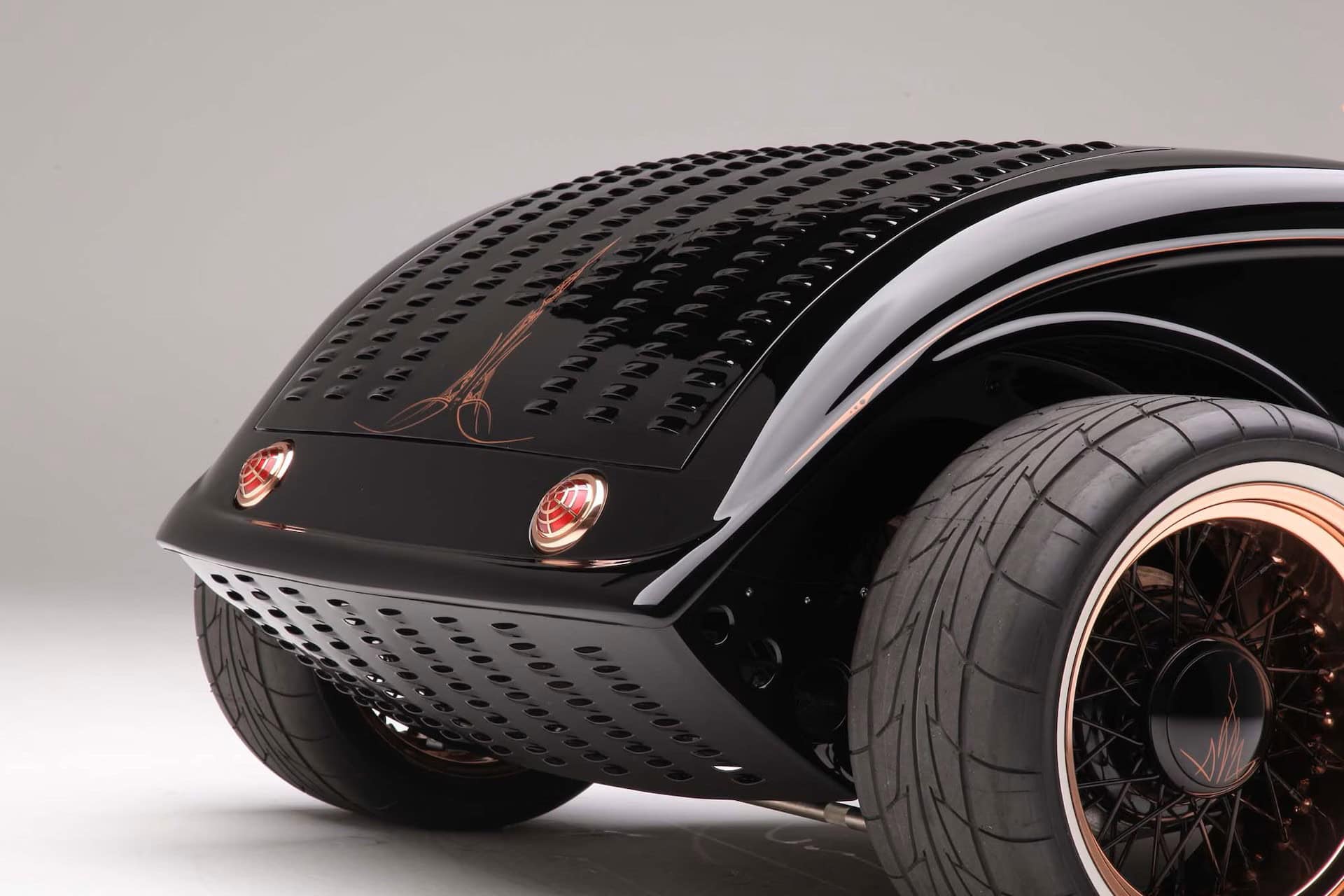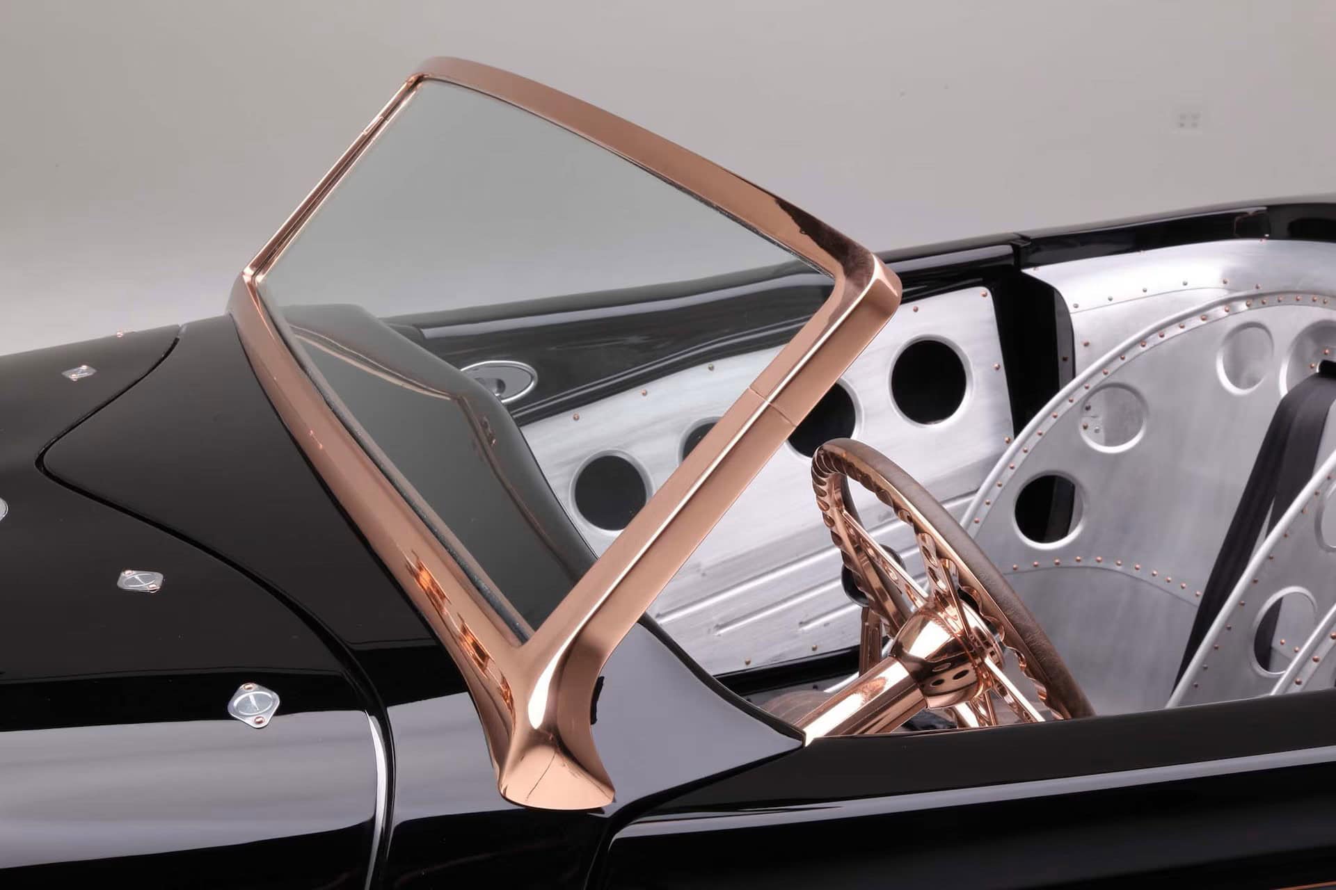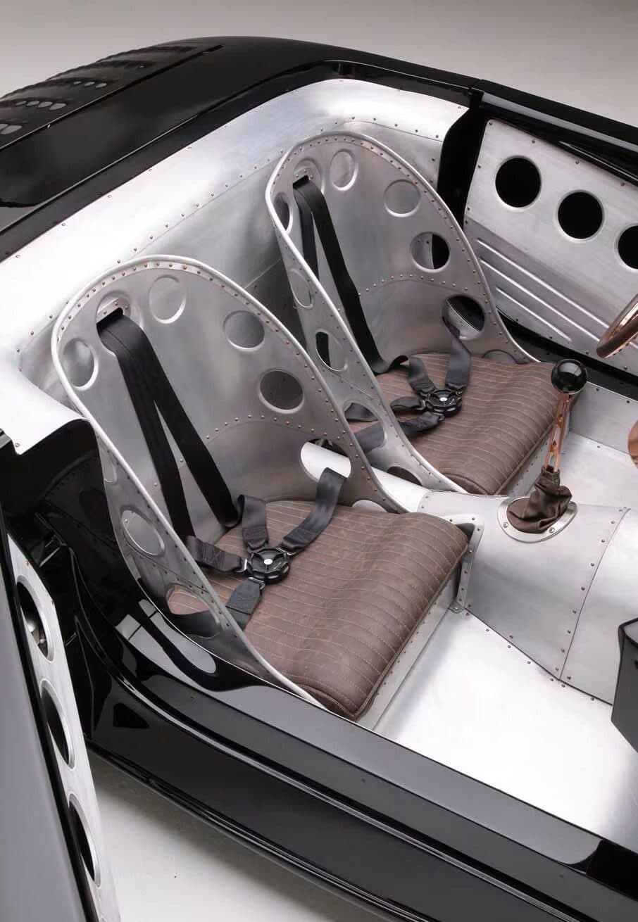 Steve Martinez a suivi avec les décos, qui incorporent des parties disposées sur le capot et le couvercle du coffre. Parmi les éléments qui séparent cette création de la plupart des autres, il y a l’utilisation d’un placage de cuivre au lieu de chrome. “Ogden Chrome” a fait “tout le Job”, y compris les baquets de phares, les enjoliveurs pour les feux arrière “FFR”, le cadre du pare-brise, les jantes, les pipes de carburateurs, le levier de vitesses, la colonne de direction et le volant unique. L’intérieur comprend les sièges baquets de type bombardier susmentionnés, fabriqués par Chris Miranda, qui se glissent dans un intérieur tout en aluminium qui entoure le cockpit. Outre l’utilisation de rivets partout, l’attention est attirée par le seul grand cadran au milieu du tableau de bord.