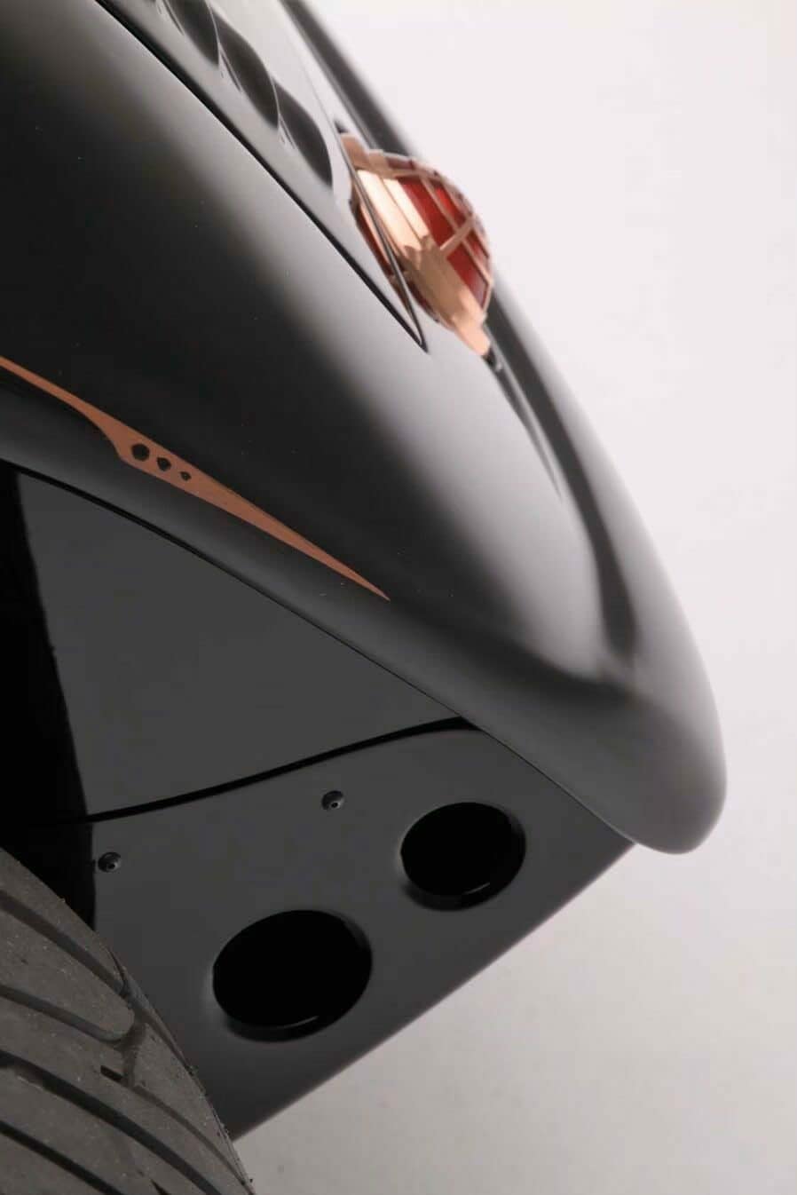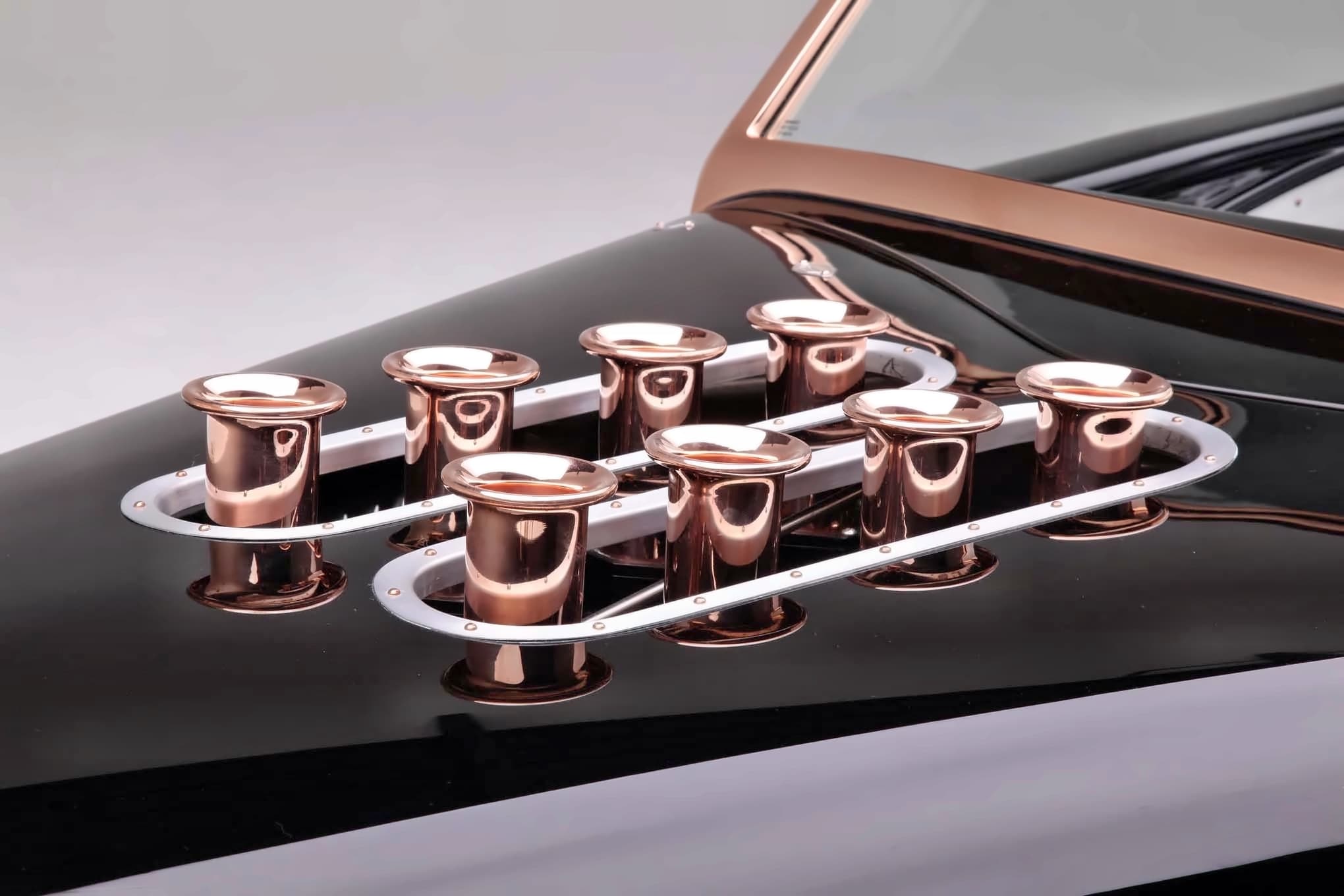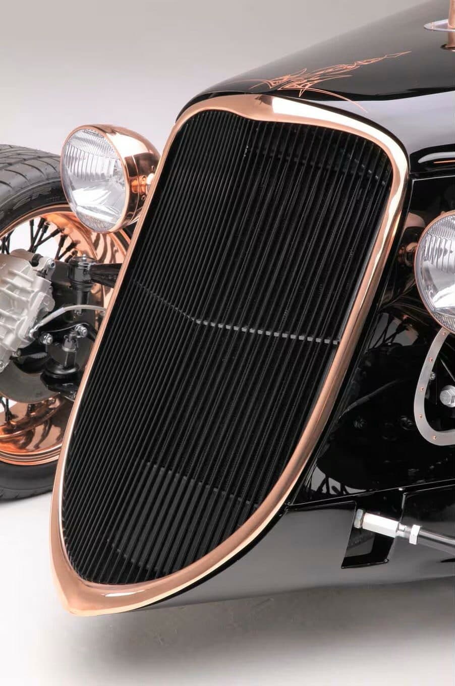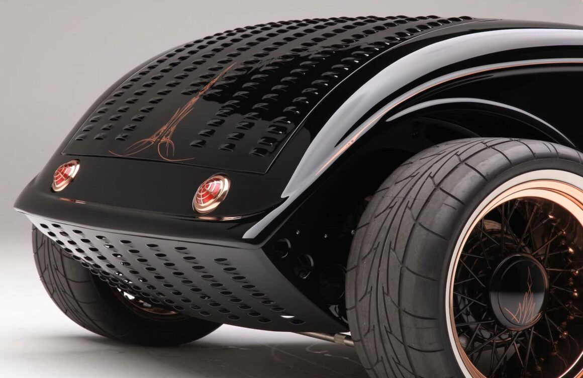 Steve Martinez a suivi avec les décos, qui incorporent des parties disposées sur le capot et le couvercle du coffre. Parmi les éléments qui séparent cette création de la plupart des autres, il y a l’utilisation d’un placage de cuivre au lieu de chrome. “Ogden Chrome” a fait “tout le Job”, y compris les baquets de phares, les enjoliveurs pour les feux arrière “FFR”, le cadre du pare-brise, les jantes, les pipes de carburateurs, le levier de vitesses, la colonne de direction et le volant unique. L’intérieur comprend les sièges baquets de type bombardier susmentionnés, fabriqués par Chris Miranda, qui se glissent dans un intérieur tout en aluminium qui entoure le cockpit. Outre l’utilisation de rivets partout, l’attention est attirée par le seul grand cadran au milieu du tableau de bord.