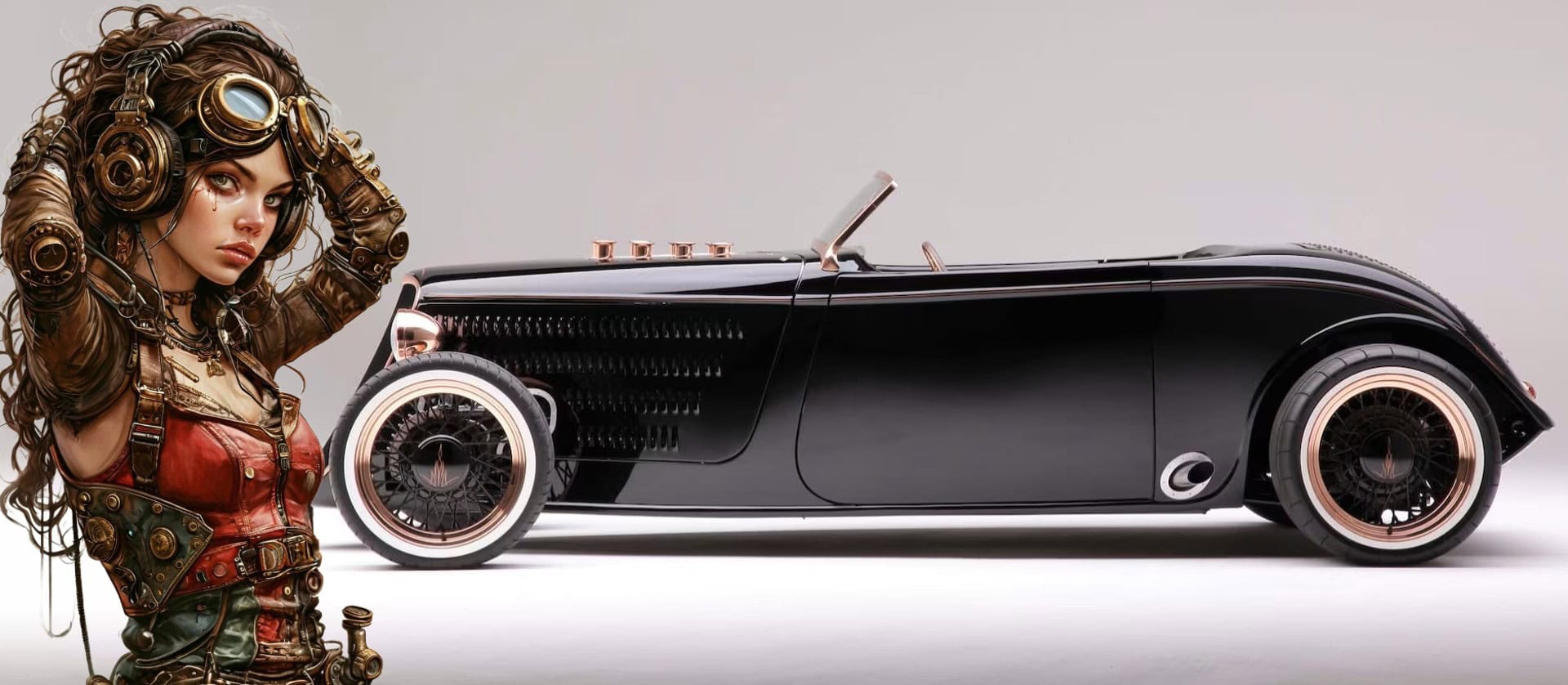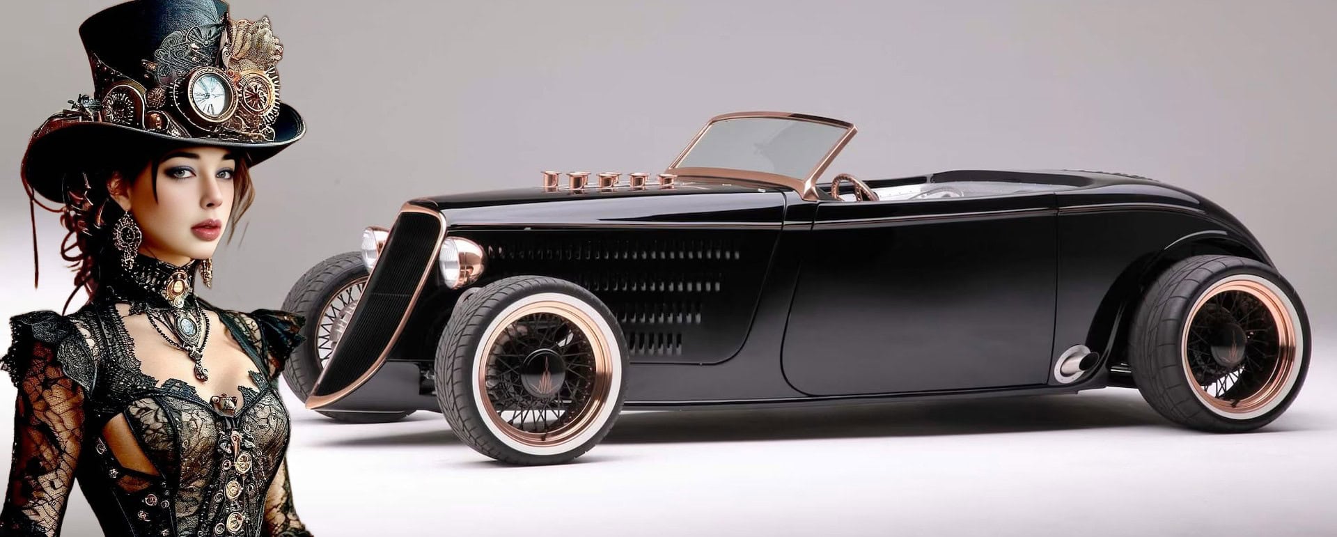 La vapeur faisait fureur avant le début du siècle dernier, mais qu’auraient construit les Hot Rodders actuels s’ils avaient existé à l’époque ? Ce concept est à la base d’un mouvement artistique populaire aujourd’hui appelé Steampunk qui incorpore des aspects de la machinerie industrielle et des appareils à vapeur (pensez aux ressorts, aux engrenages, aux leviers, aux jauges/compteurs avec des flèches, à l’acier ou à l’aluminium riveté, aux soupapes de décharge et à une bonne part des extensions et renflements). Le Steampunk d’aujourd’hui est aussi éloigné que possible de l’apparence des Hot Rods lisses qui étaient à la mode à la fin des années 1900 (juste avant l’année 2.000)…
