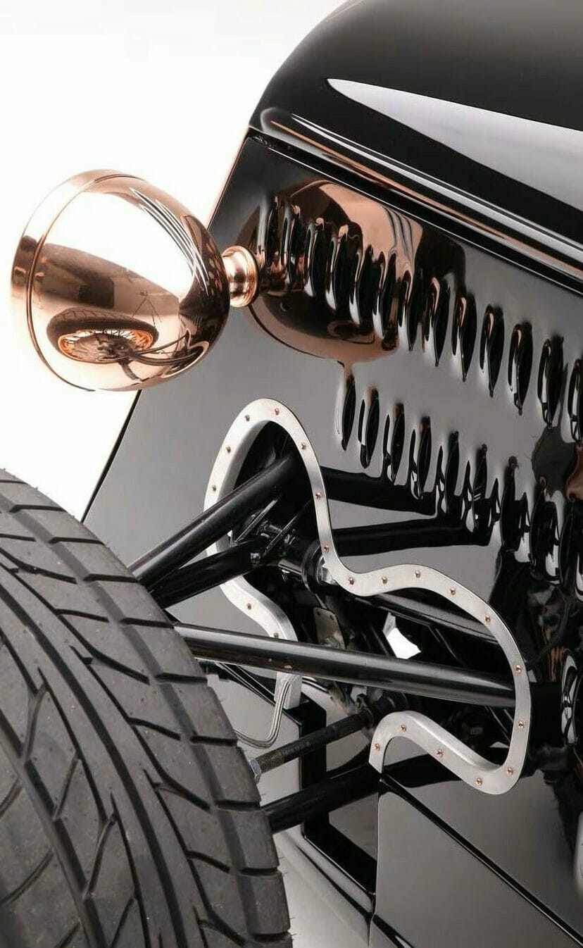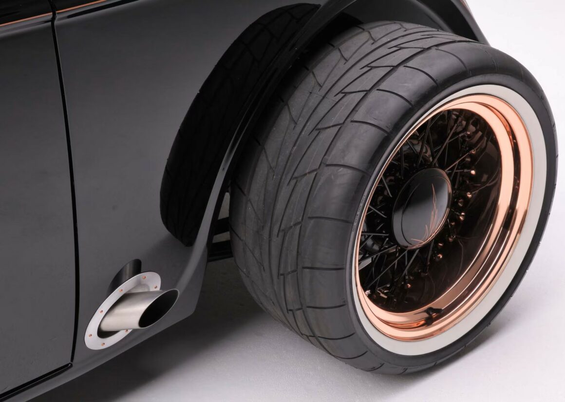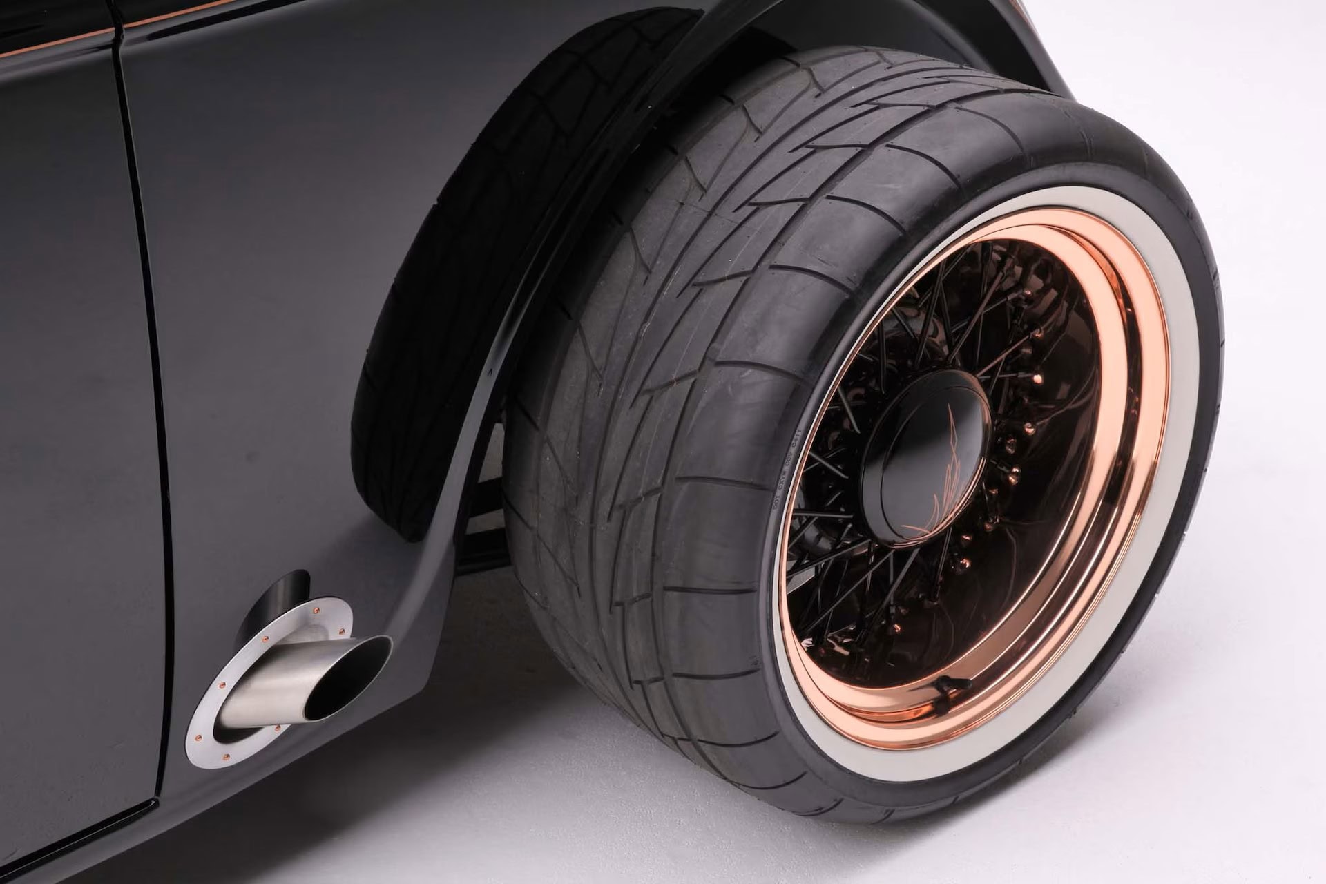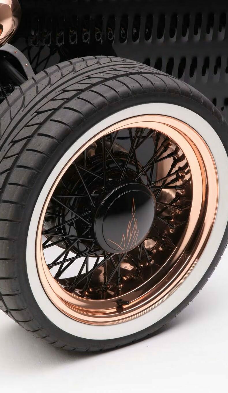 C’est “Wheelsmith” qui a été chargé de fabriquer les jantes à rayons spécifiques en 18×8 et 18×12, qui ont été cuivrées et enveloppées de pneus à flancs blancs “Nitto” NT555. Le châssis FFR permet d’utiliser la plupart des groupes motopropulseurs Ford, et ce Hot Rod Steampunk est propulsé par un V8 460ci de 510cv travaillé par “Peters Racing” situé à Lakeport, en Californie. Le big-block V8 a été mis à niveau avec une vilebrequin forgé “Scat” en 4,150po, des tiges de culbuteurs “Scat” forgées, des pistons forgés “JE” de 4,390po (10:1) et un arbre à cames à rouleaux hydraulique “COMP”... Au sommet, un système d’injection de marque “Imagine” alimente une paire de têtes de soupapes en aluminium “Edelbrock” le tout alimenté par des carburateurs 4 corps Weber.
